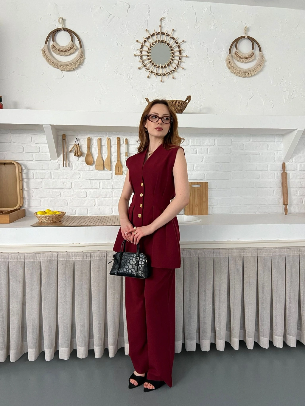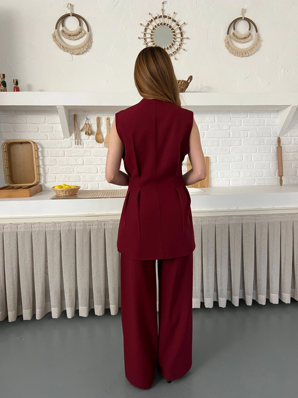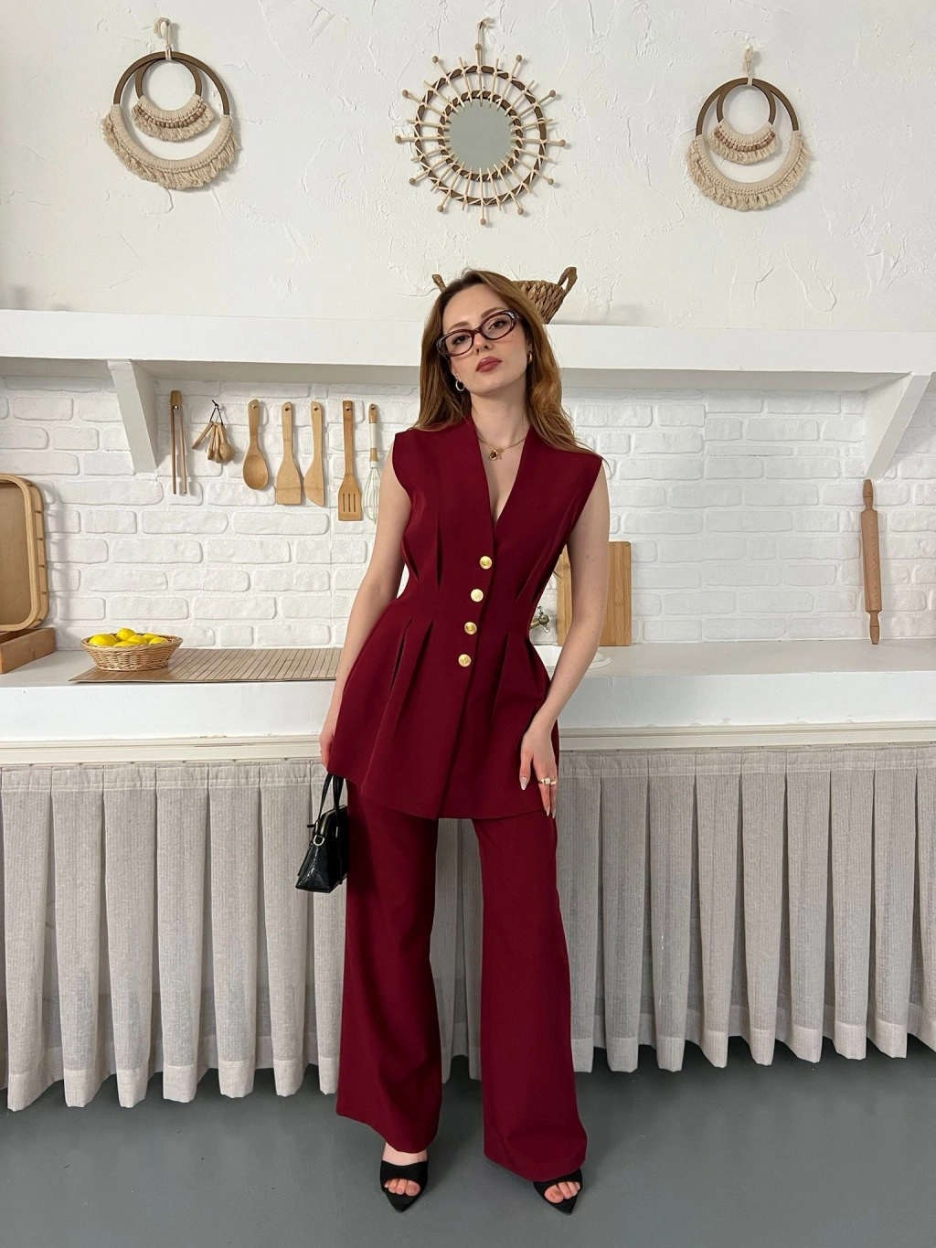 Gold Düğme Detaylı İkili Takım Bordo