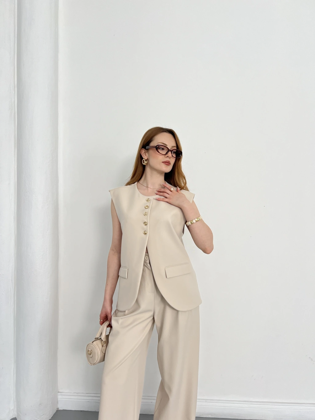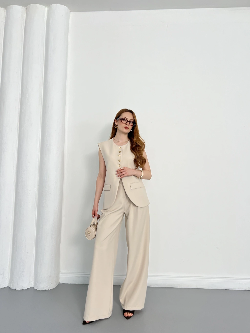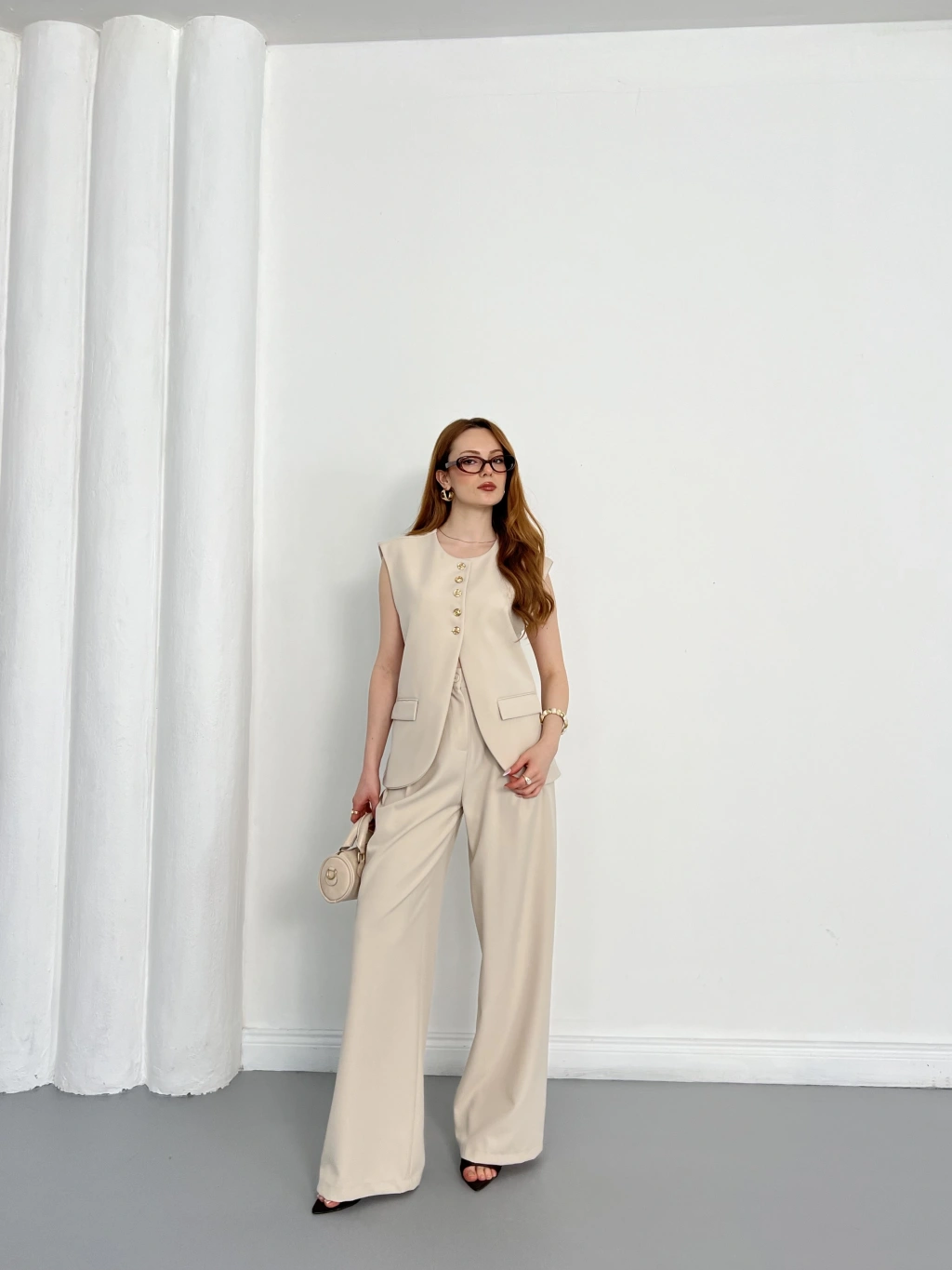 Gold Düğme Detaylı Tasarım Yelekli Takım Bej