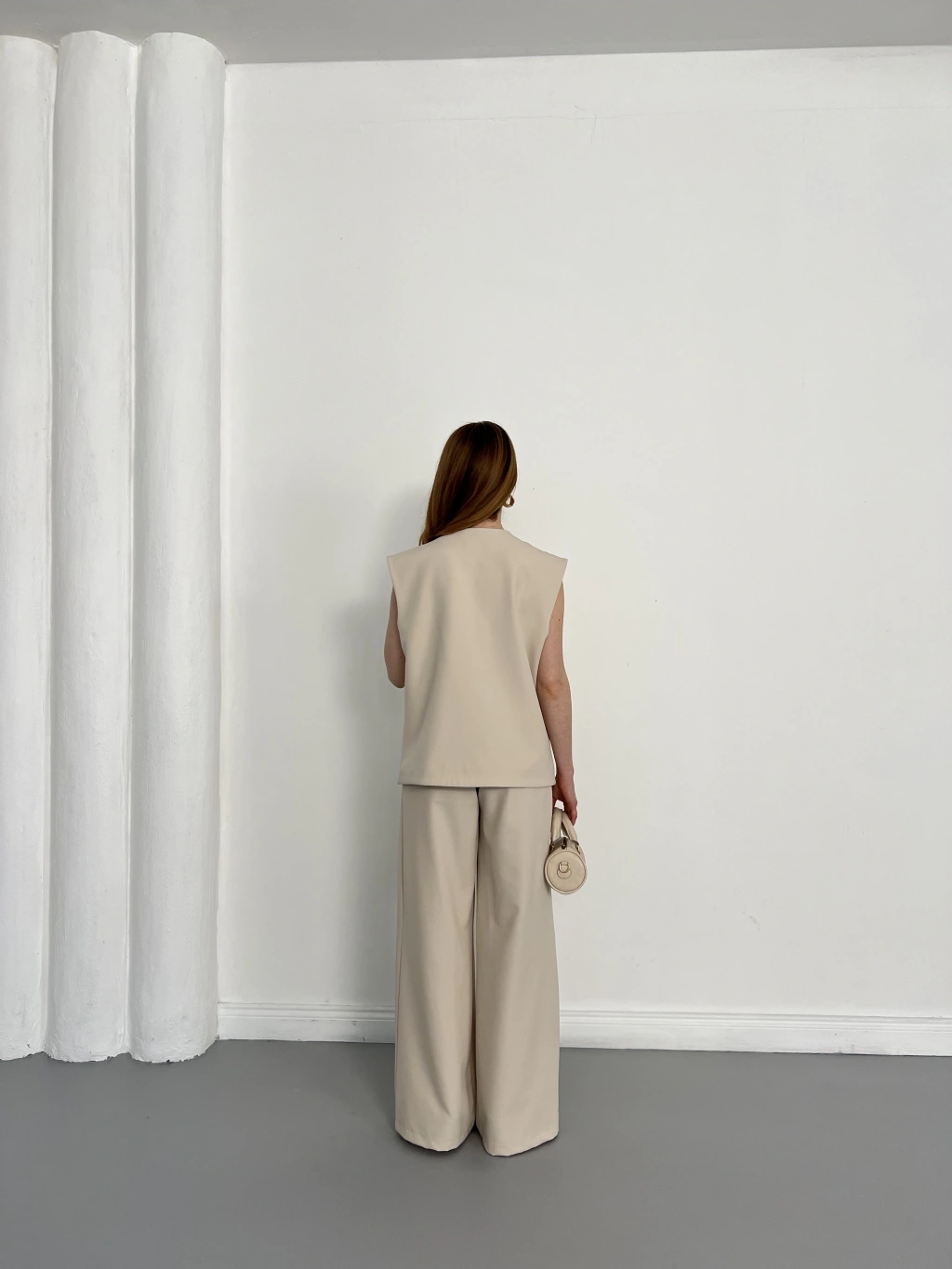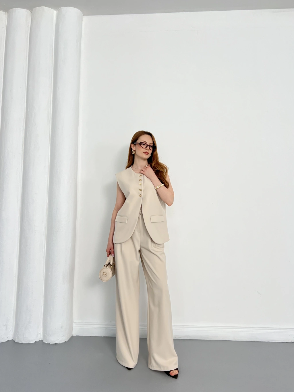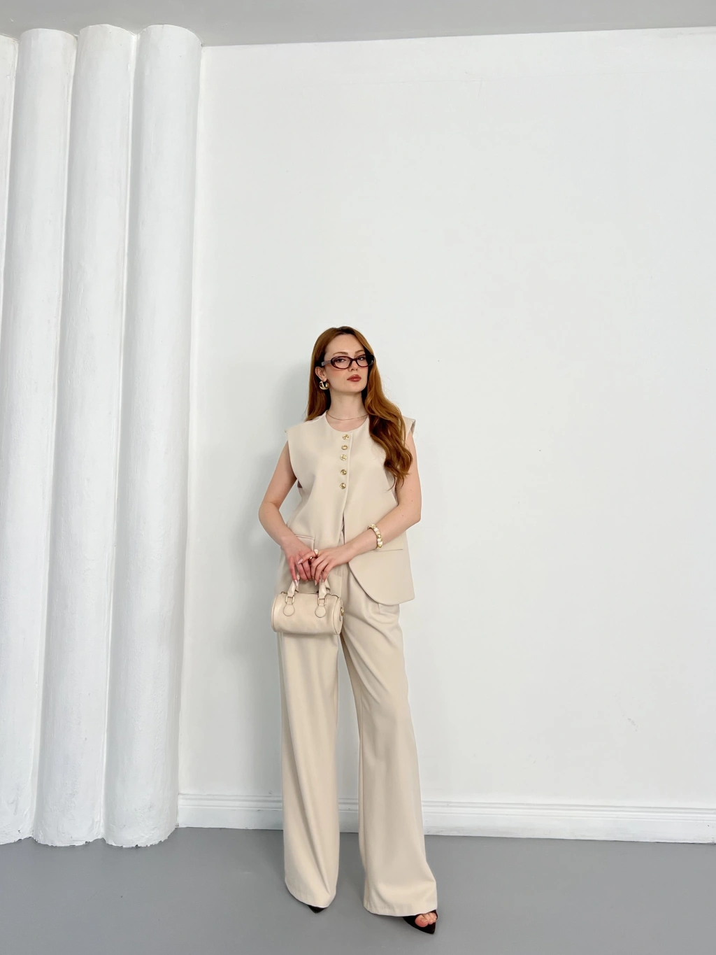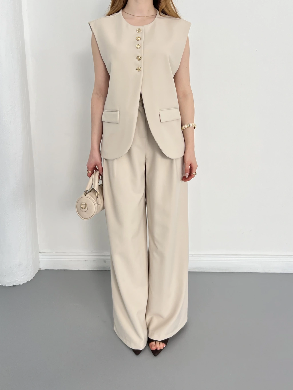 Gold Düğme Detaylı Tasarım Yelekli Takım Bej