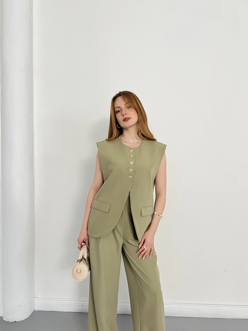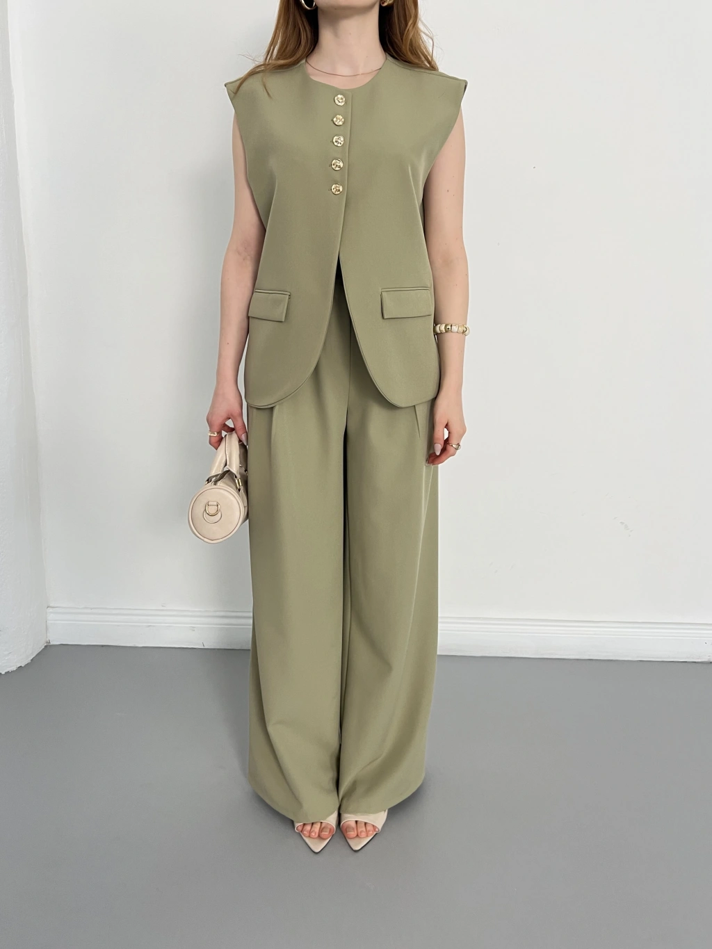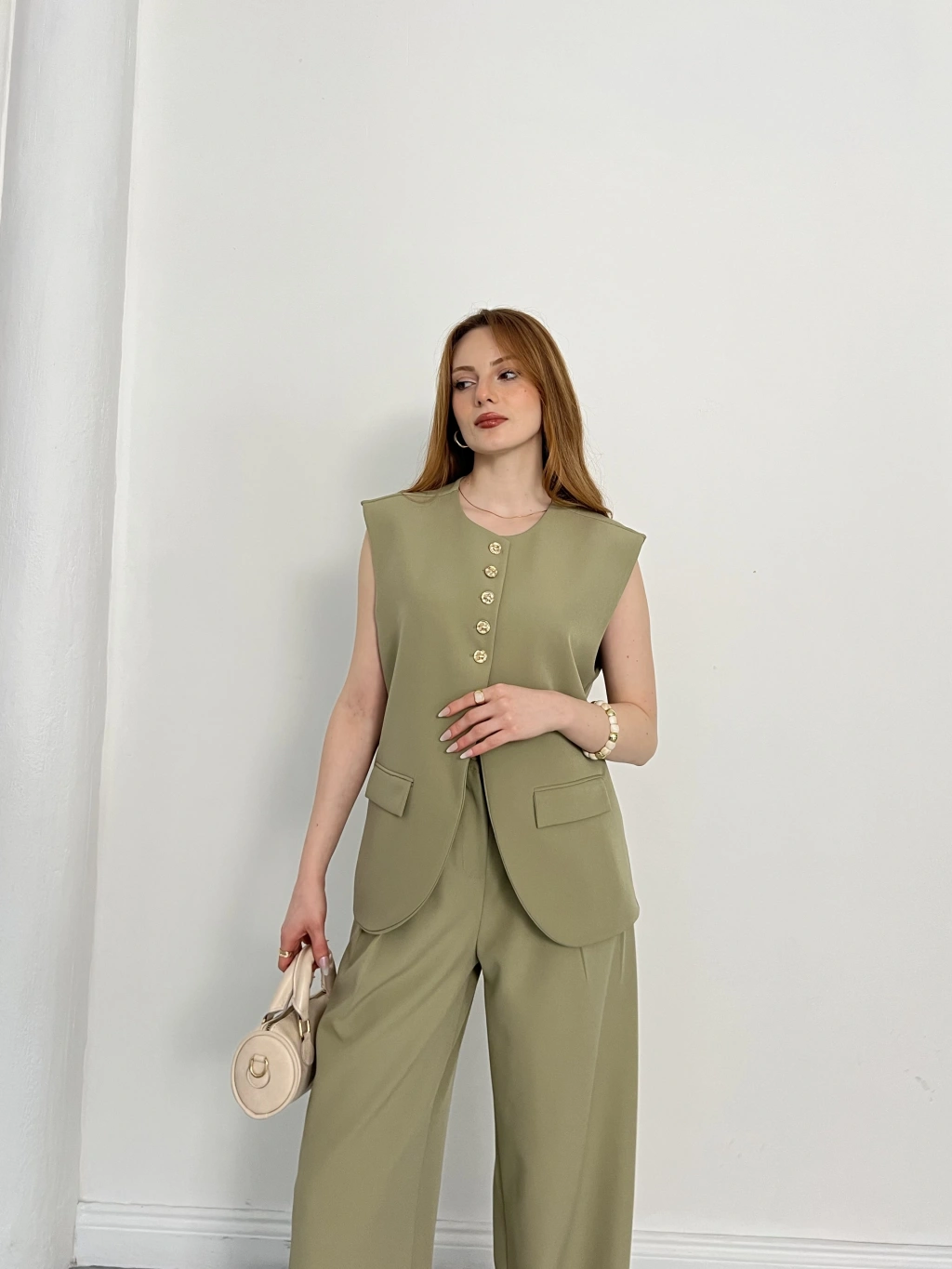 Gold Düğmeli Yelekli Pantolon Takım Haki
