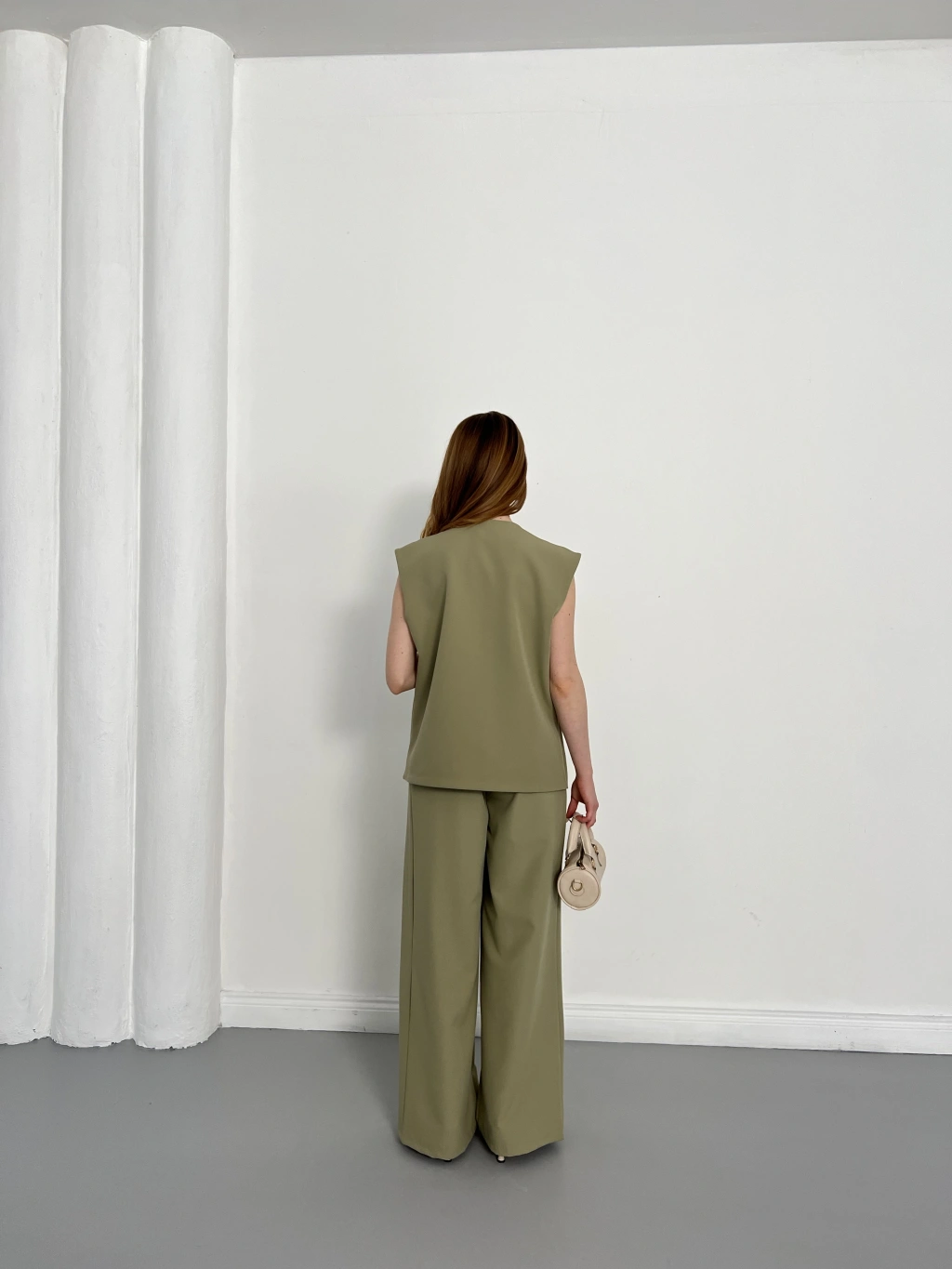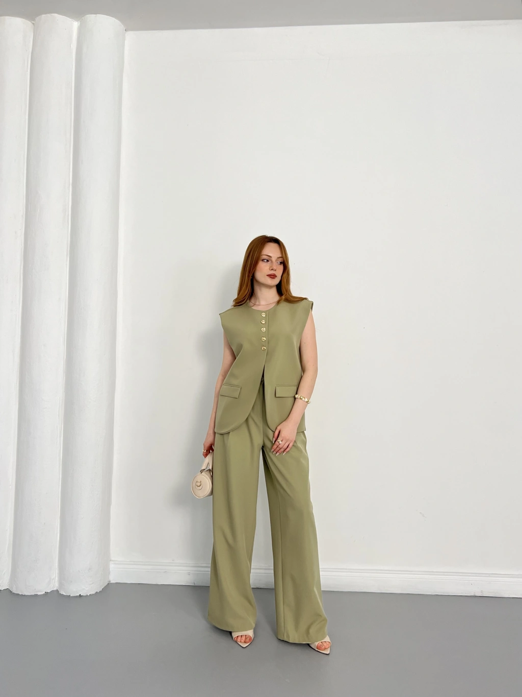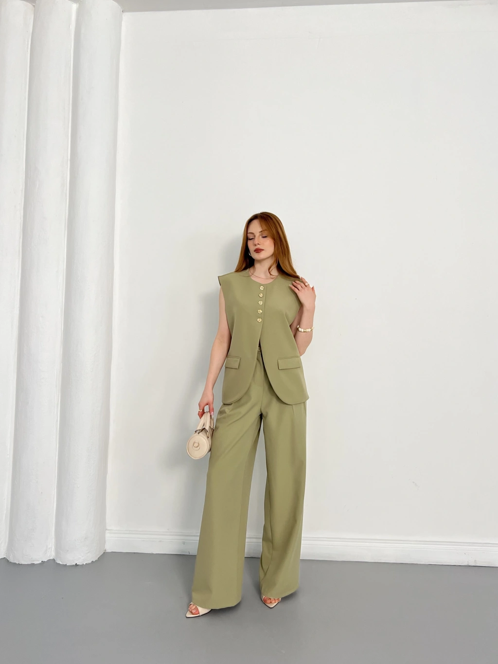Gold Düğmeli Yelekli Pantolon Takım Haki
