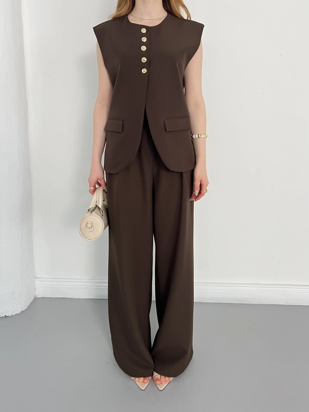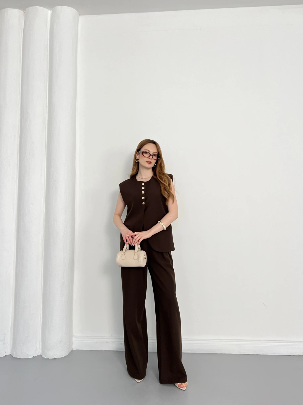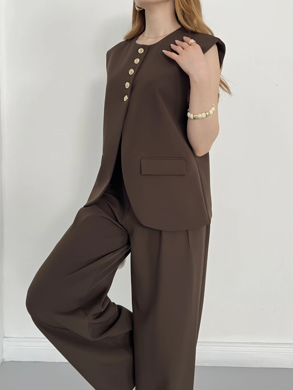 Gold Düğmeli Yelekli Pantolon Takım Kahve