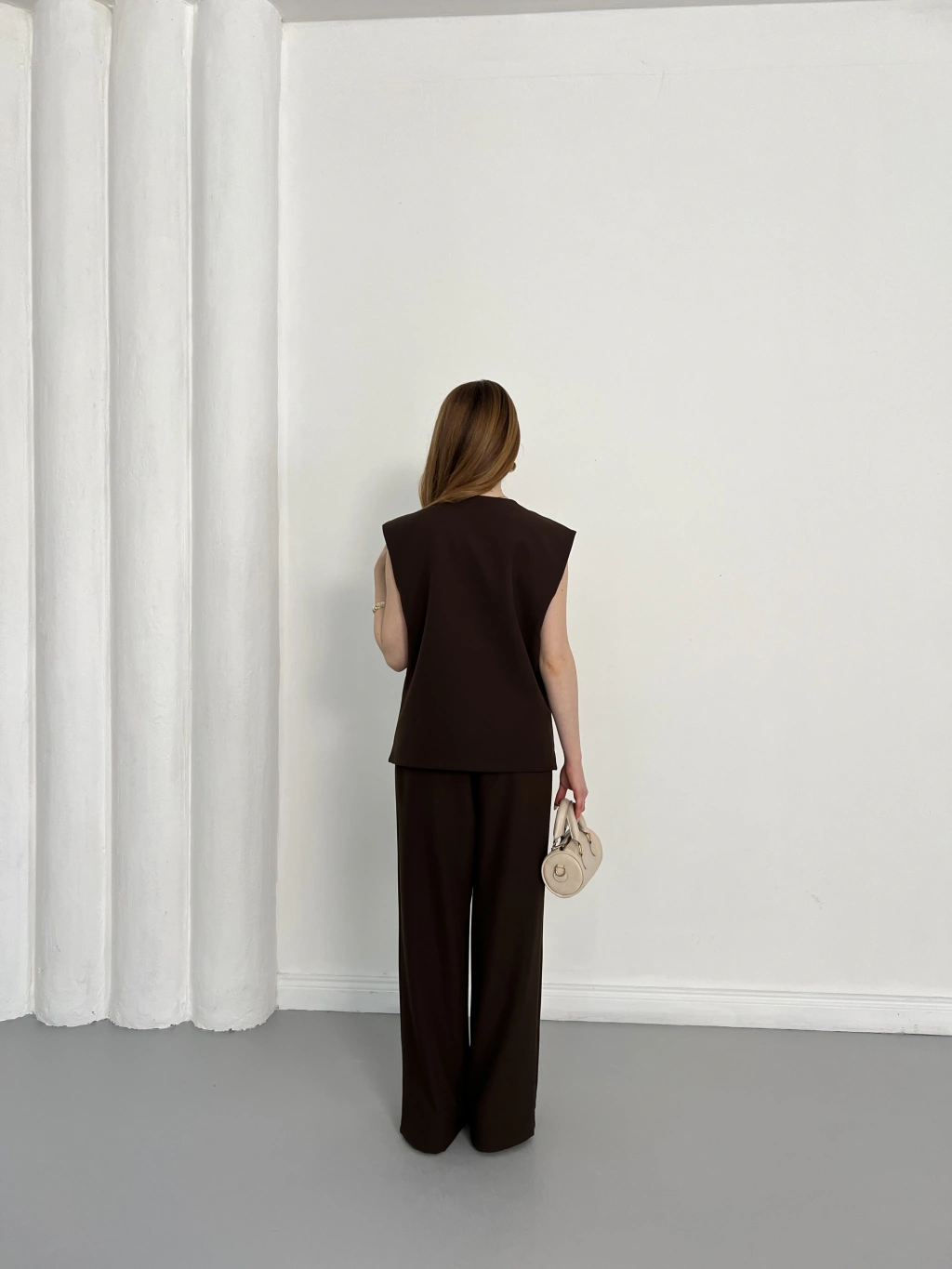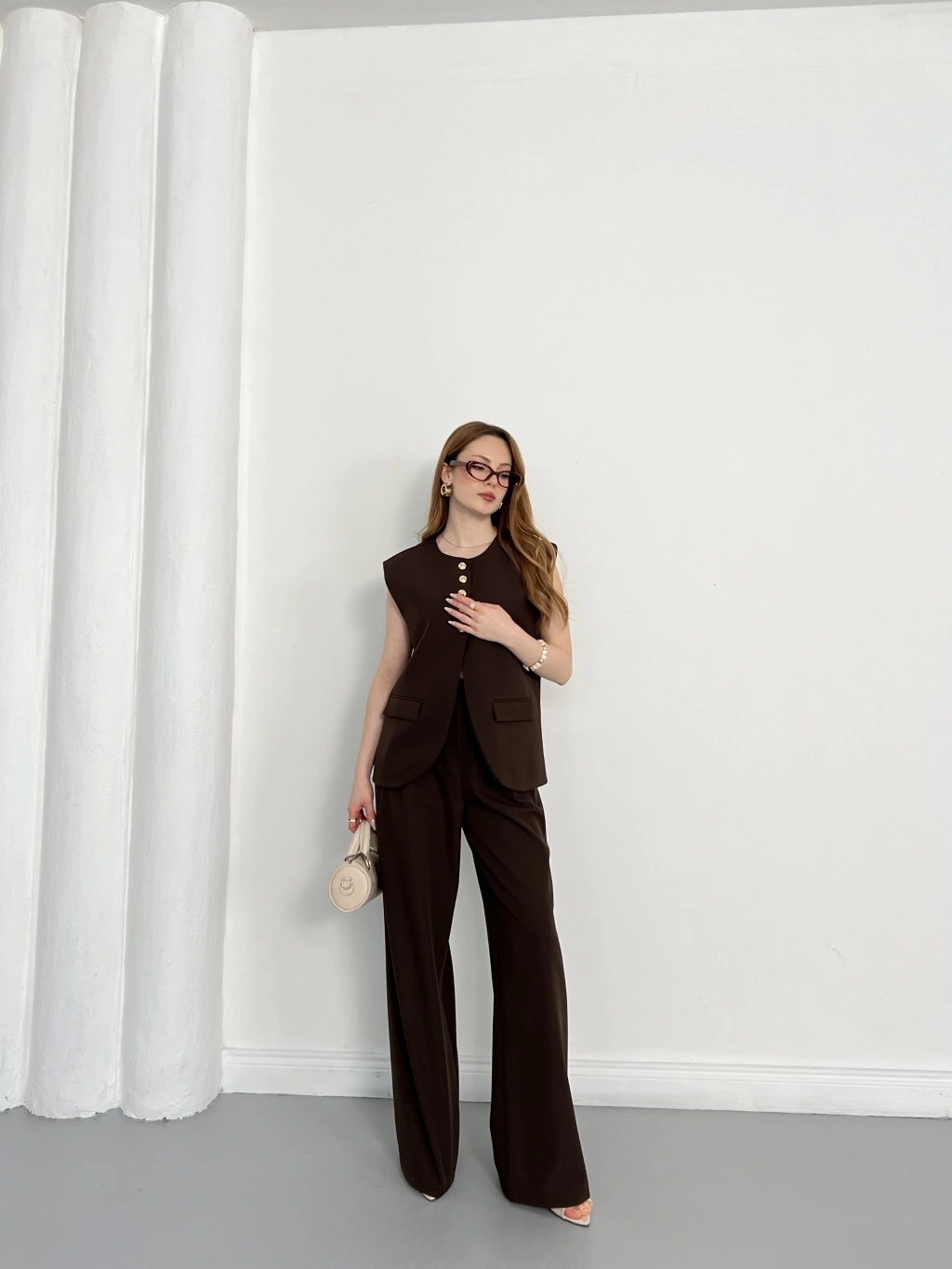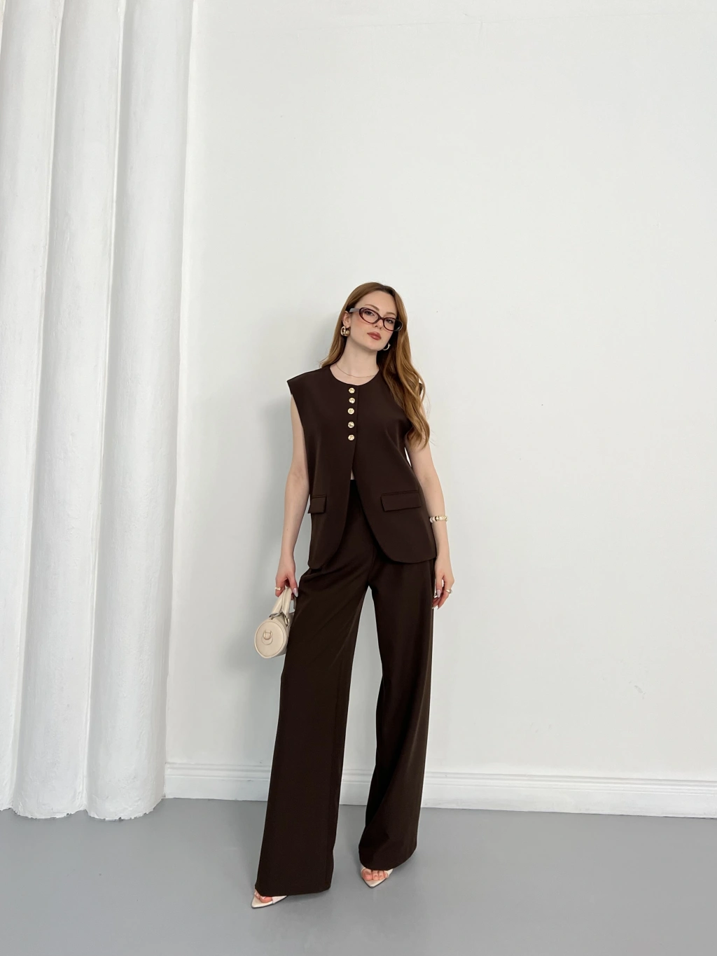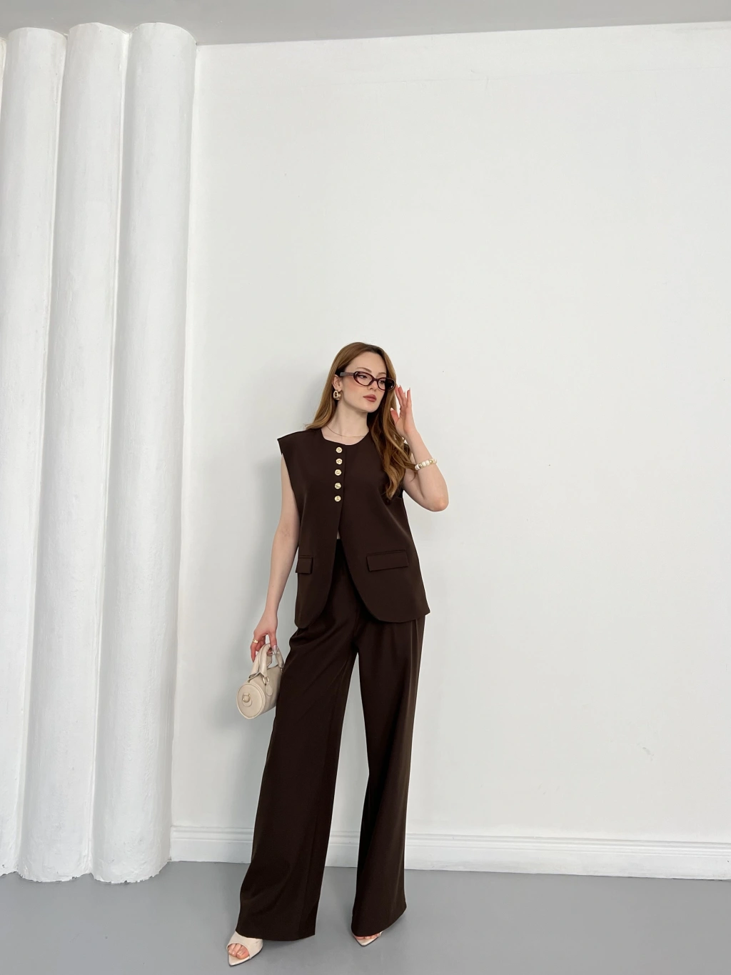 Gold Düğmeli Yelekli Pantolon Takım Kahve