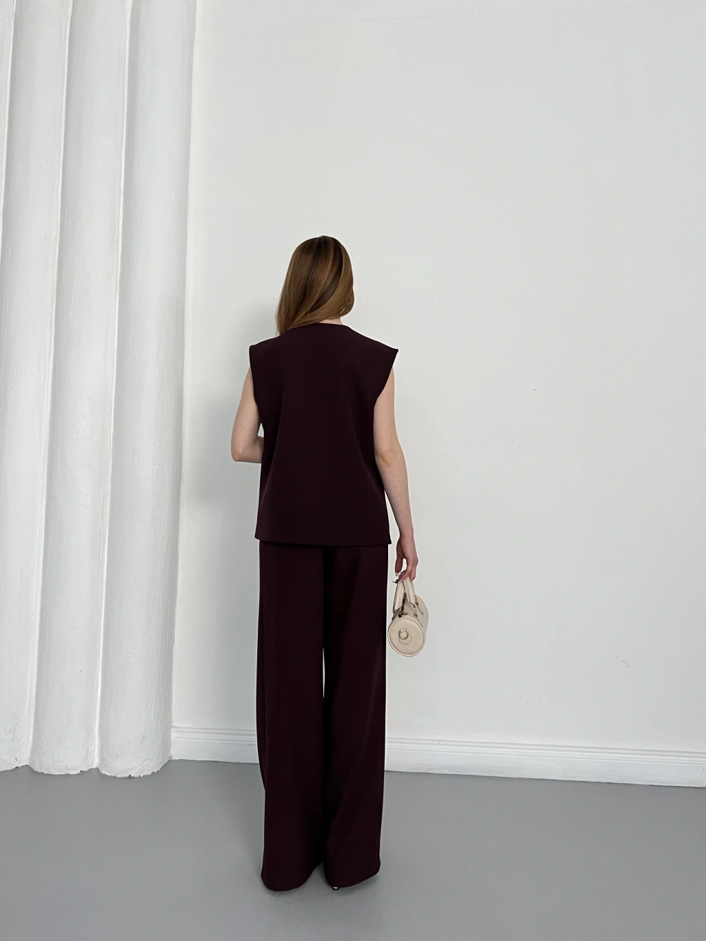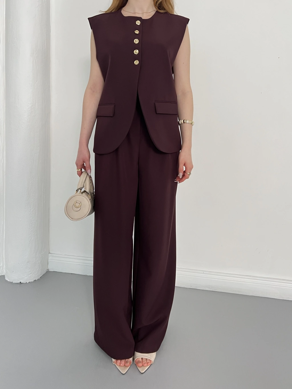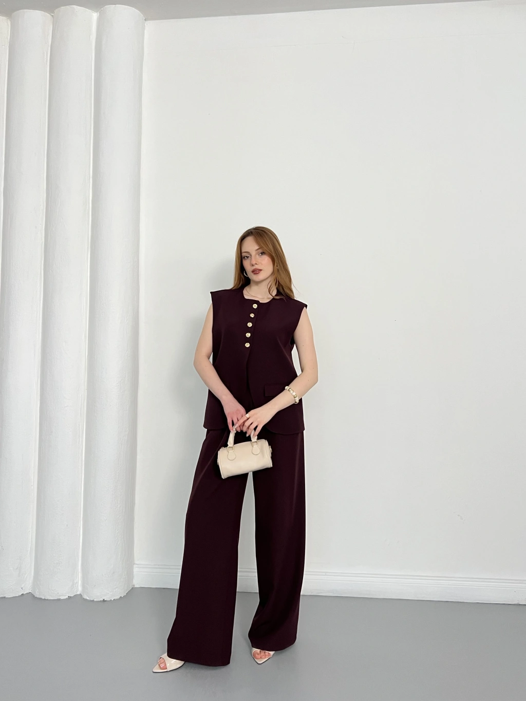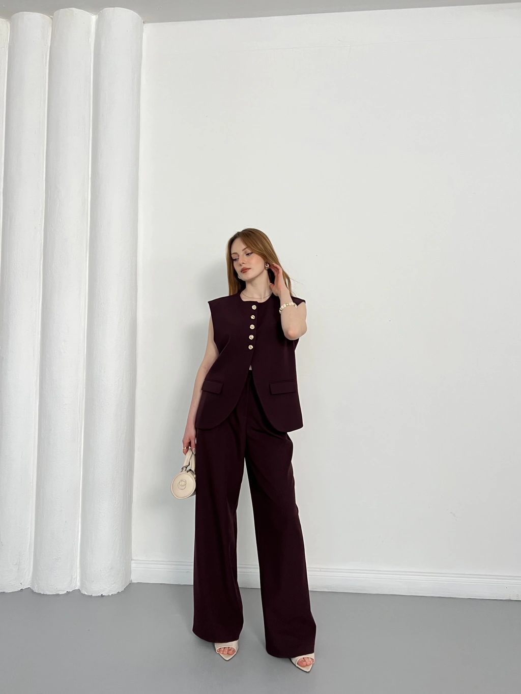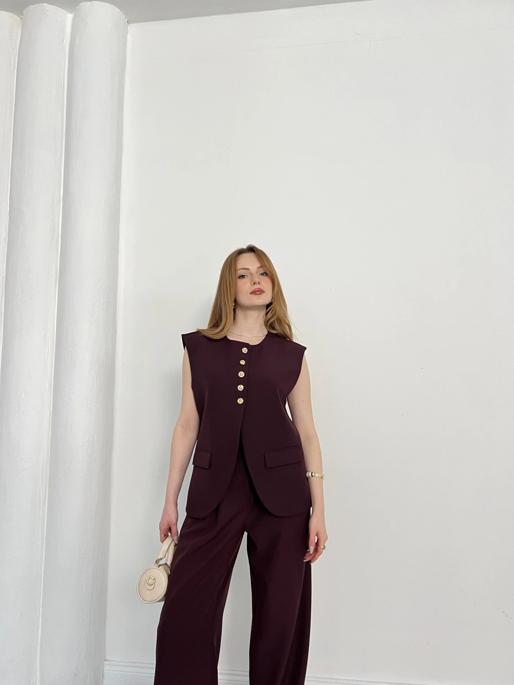 Gold Düğme Detaylı Tasarım Yelekli Takım Mürdüm