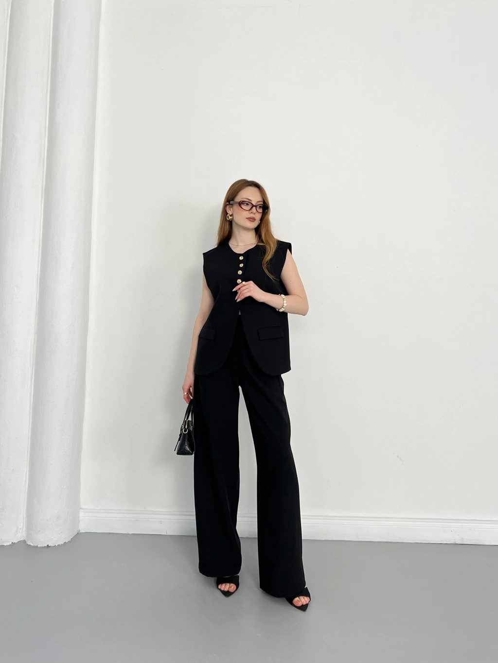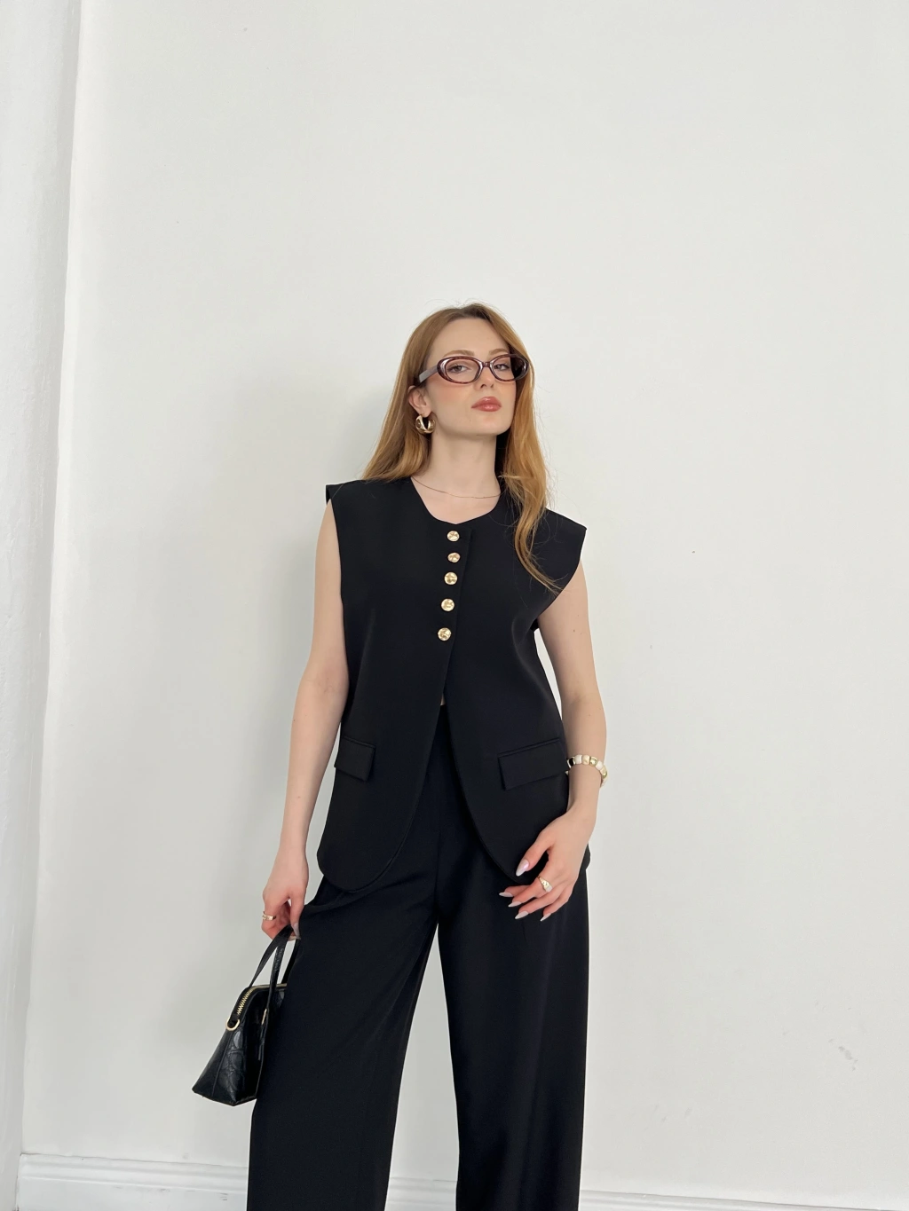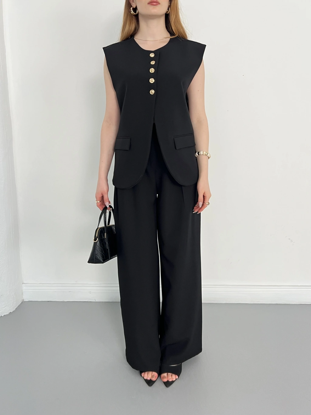 Gold Düğme Detaylı Tasarım Yelekli Takım Siyah