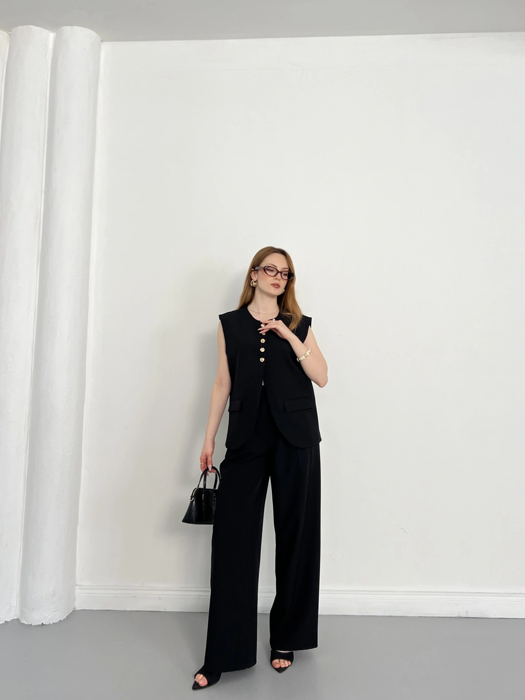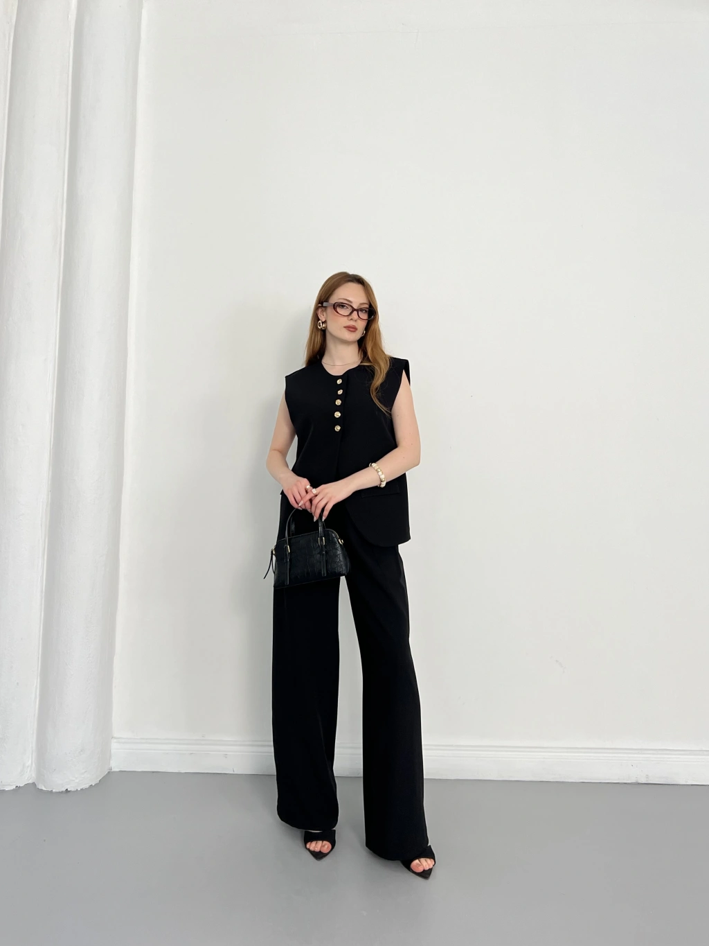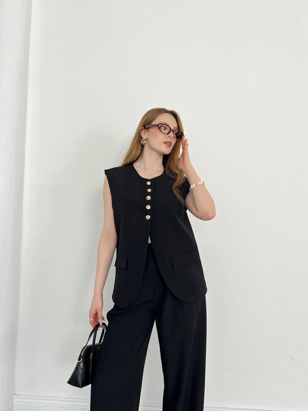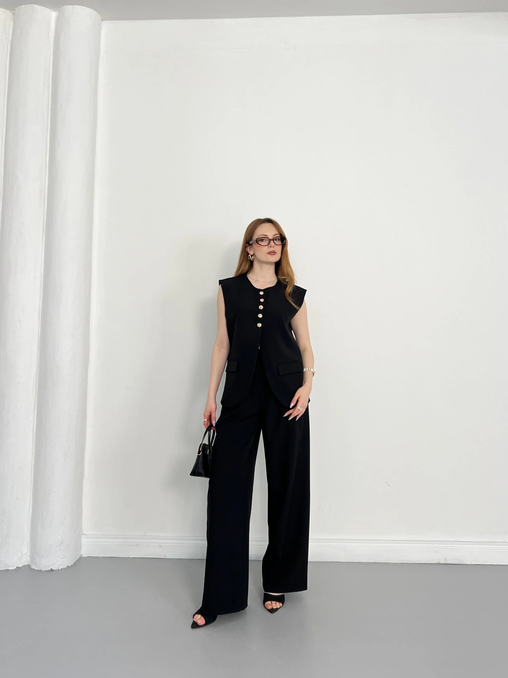 Gold Düğme Detaylı Tasarım Yelekli Takım Siyah