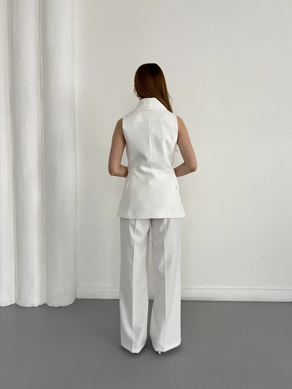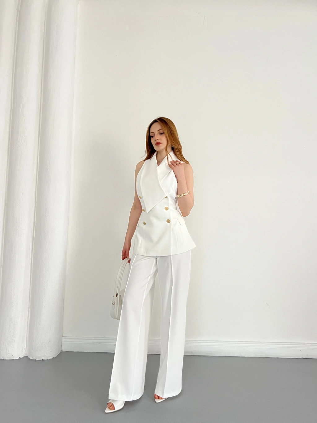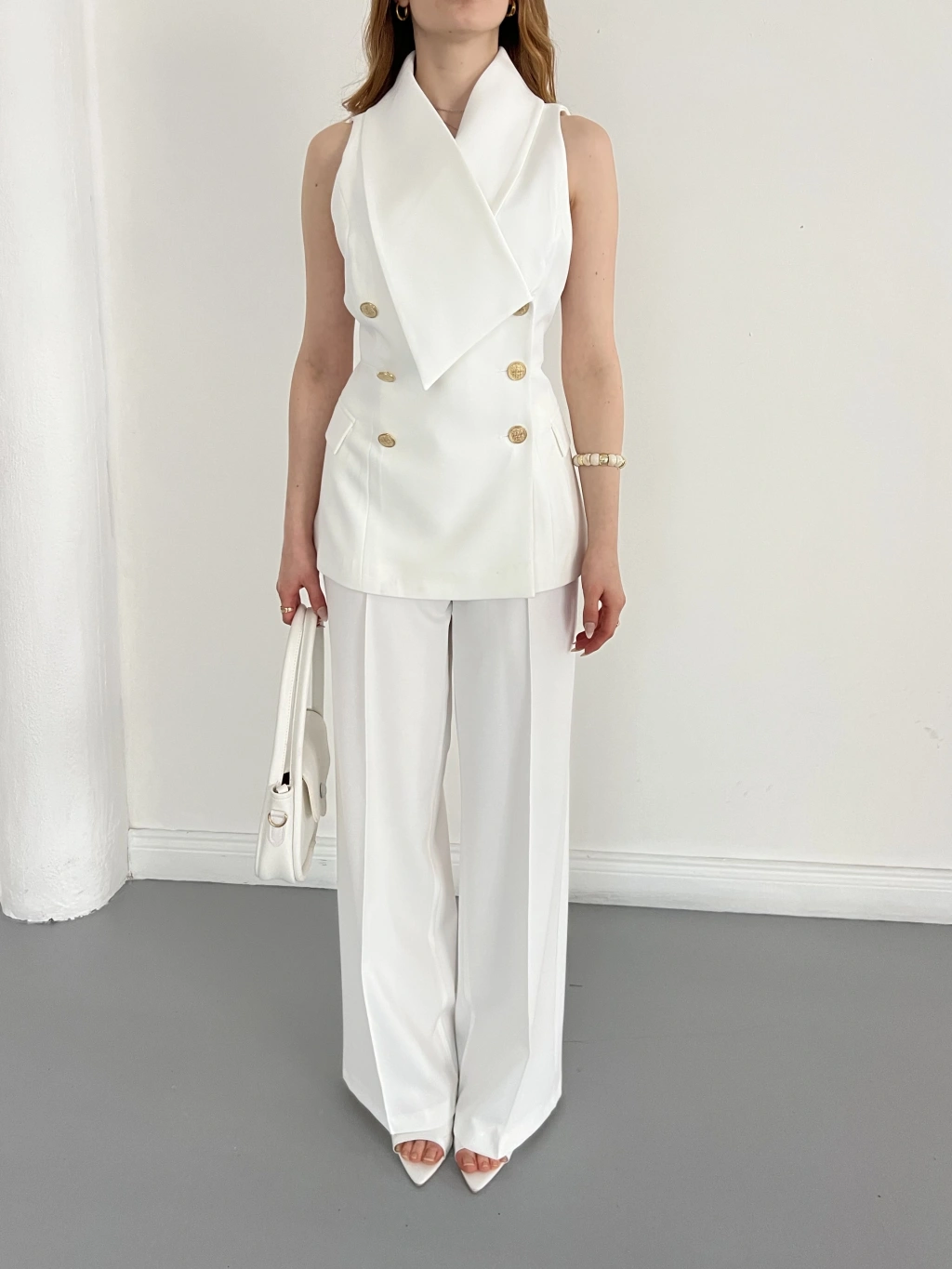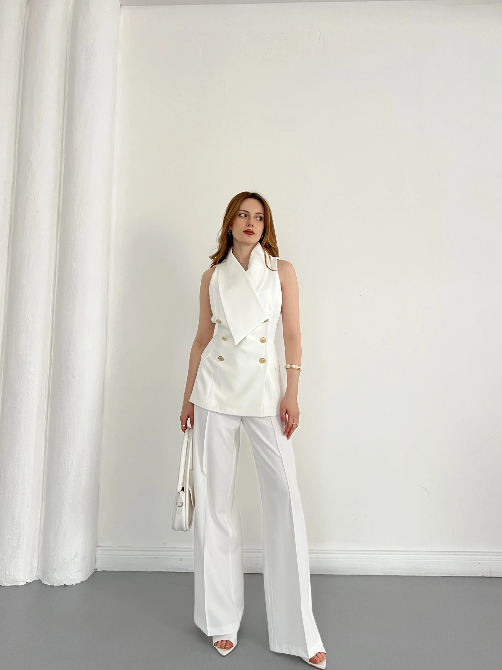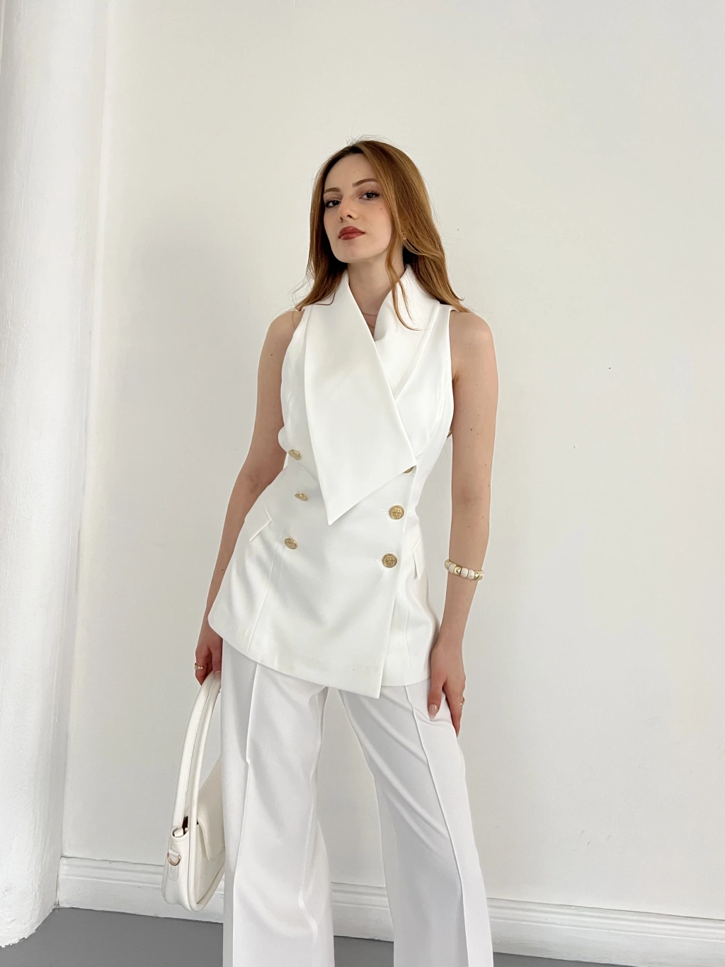 Gold Düğmeli Yelekli Pantolon Takım Beyaz