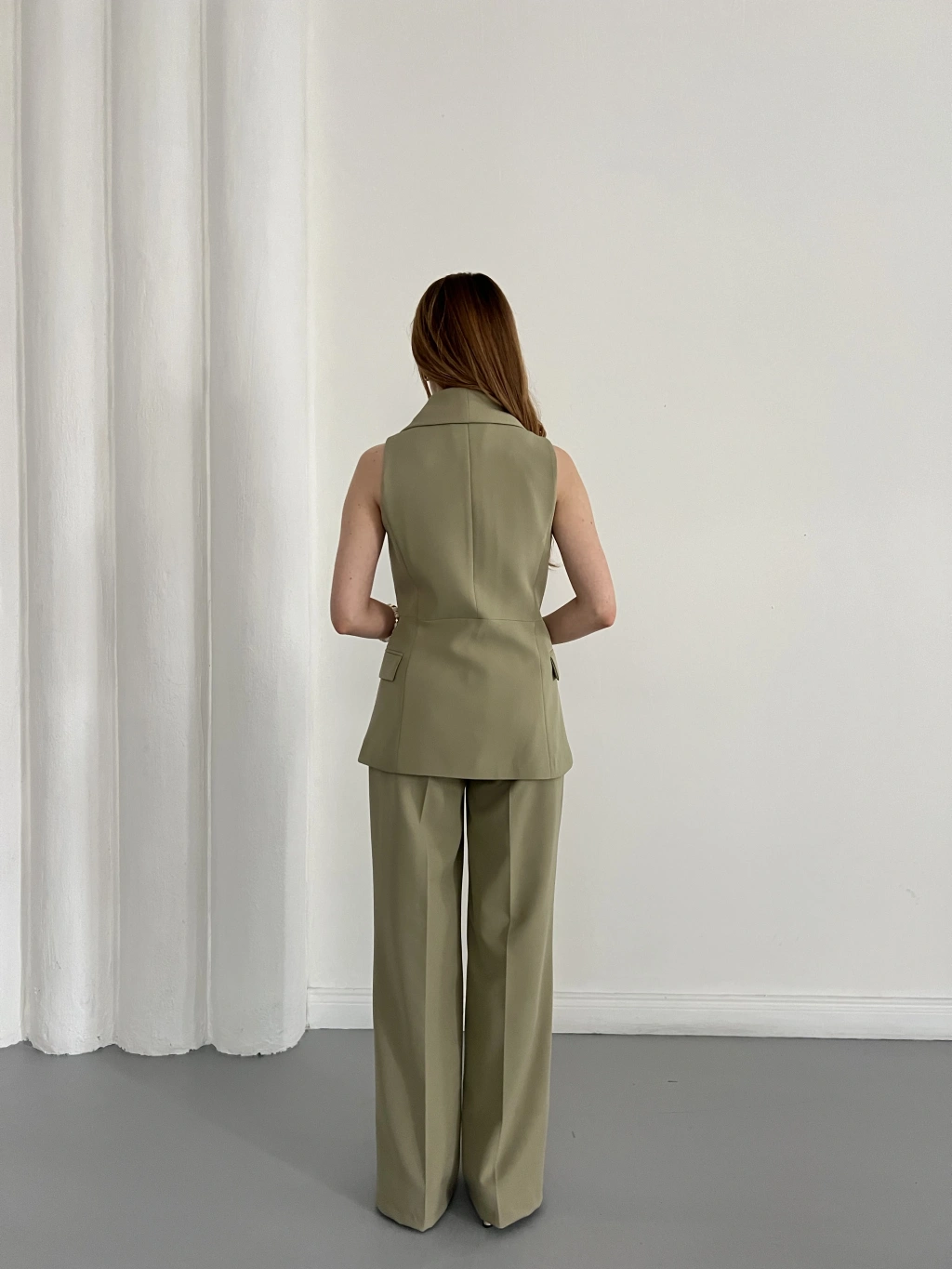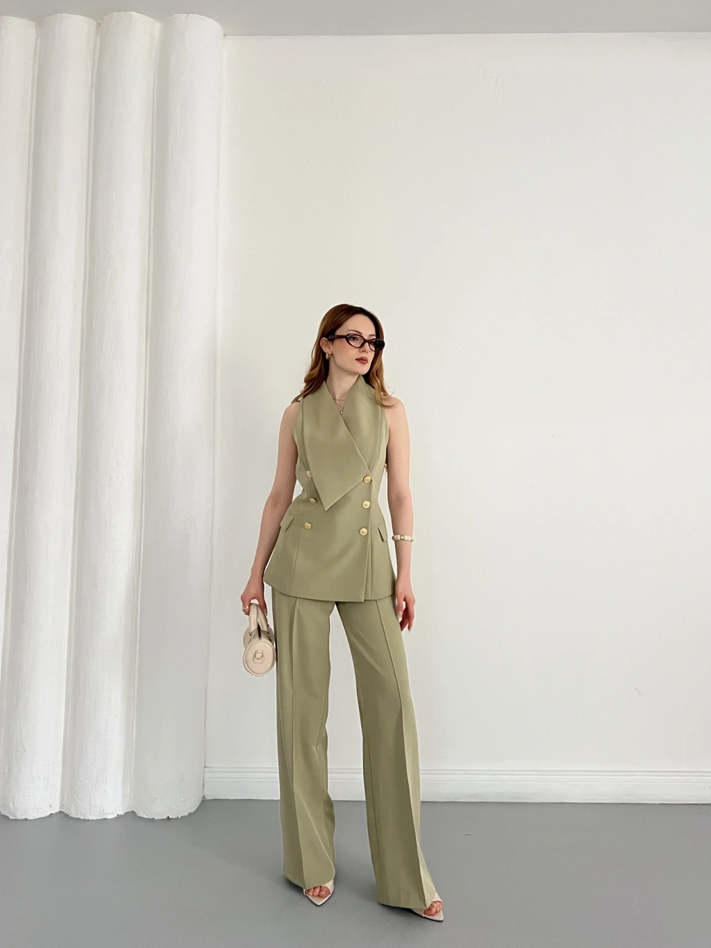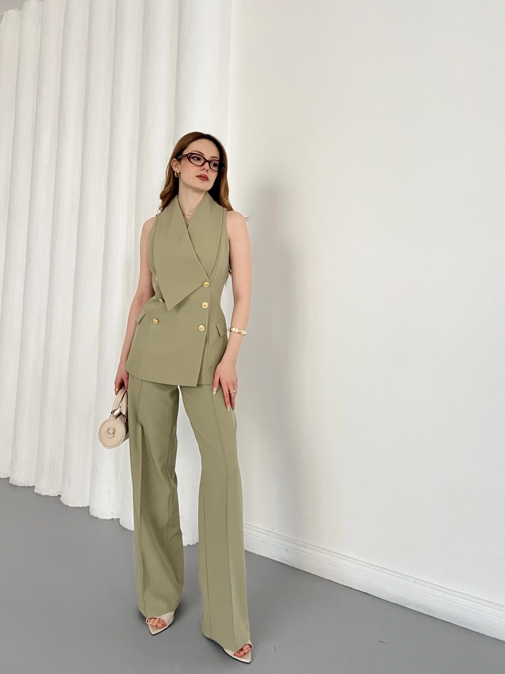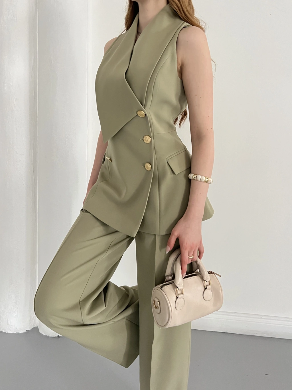 Gold Düğmeli Yelekli Pantolon Takım Haki