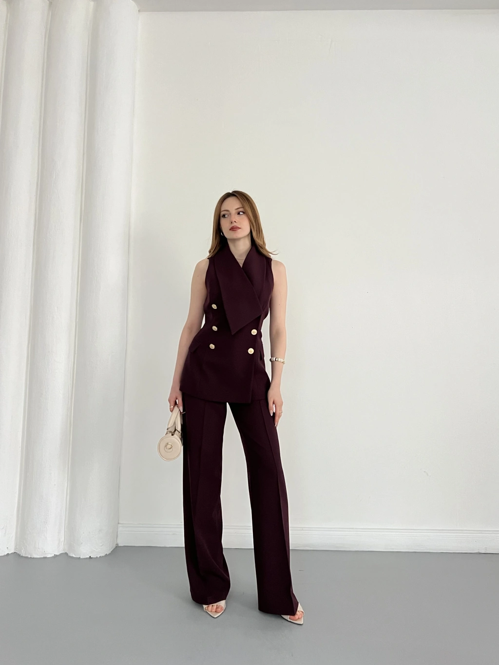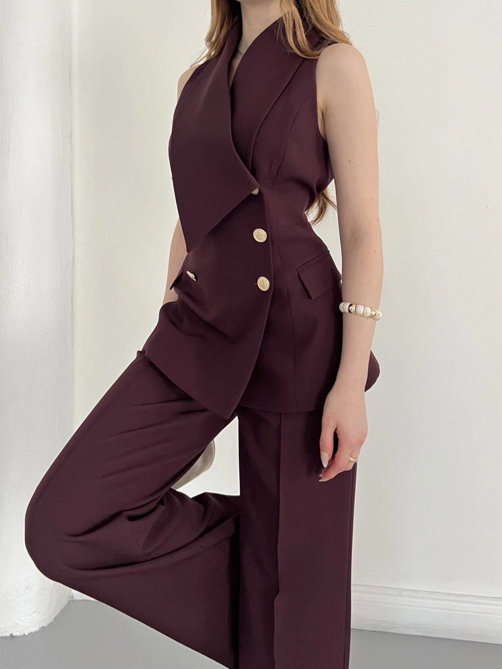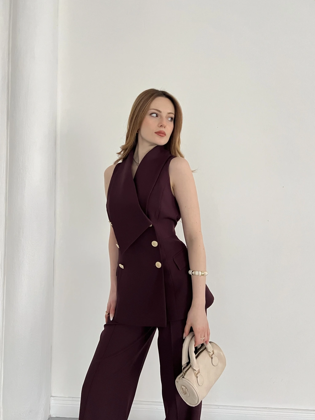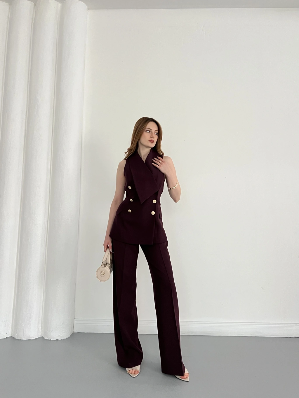 Gold Düğmeli Yelekli Pantolon Takım Mürdüm