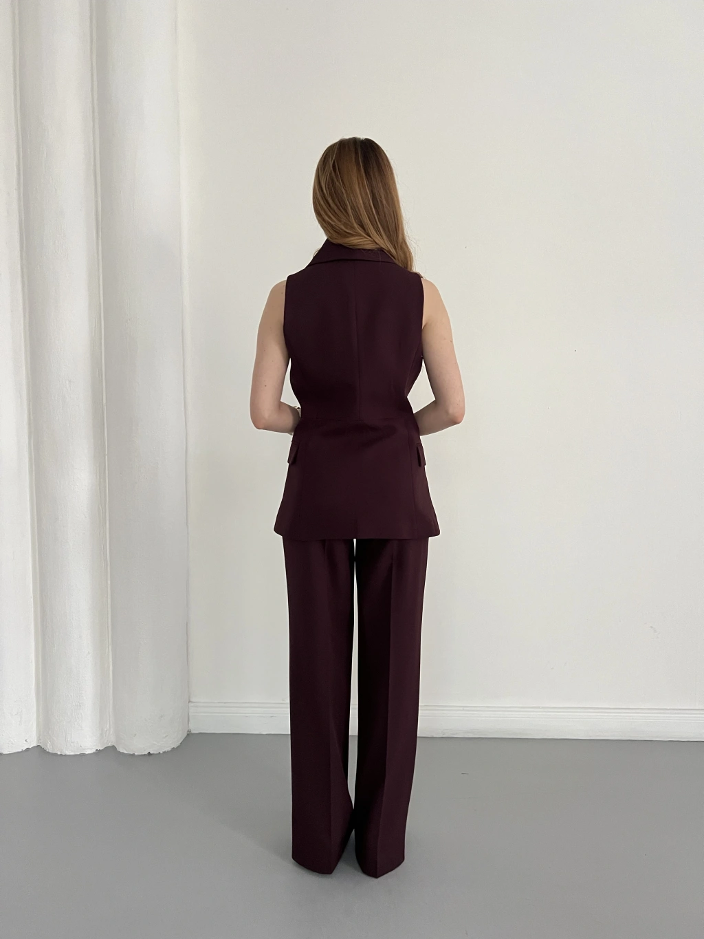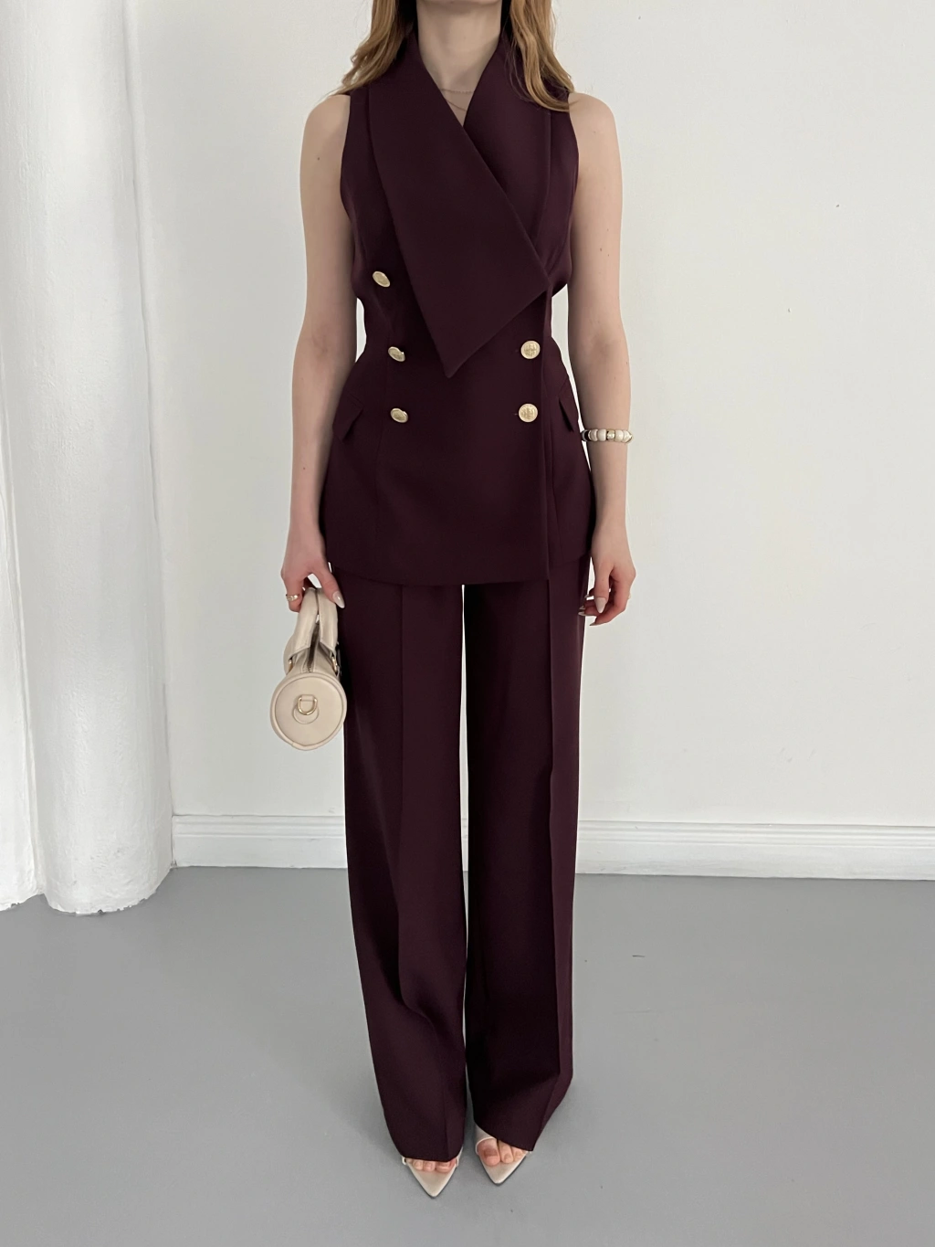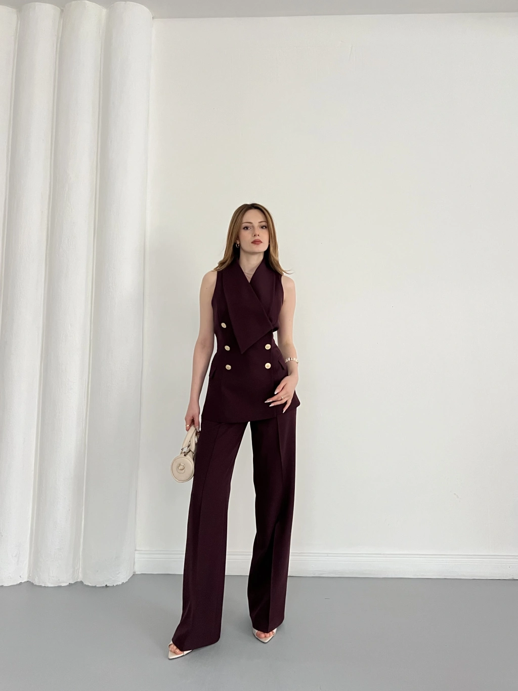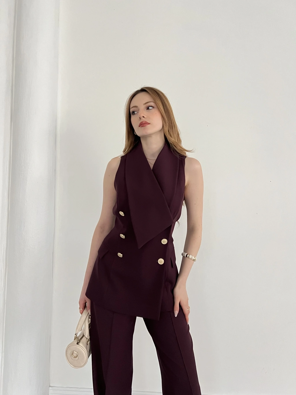Gold Düğmeli Yelekli Pantolon Takım Mürdüm