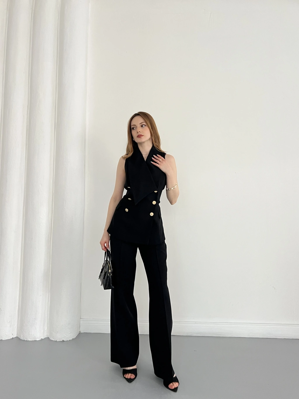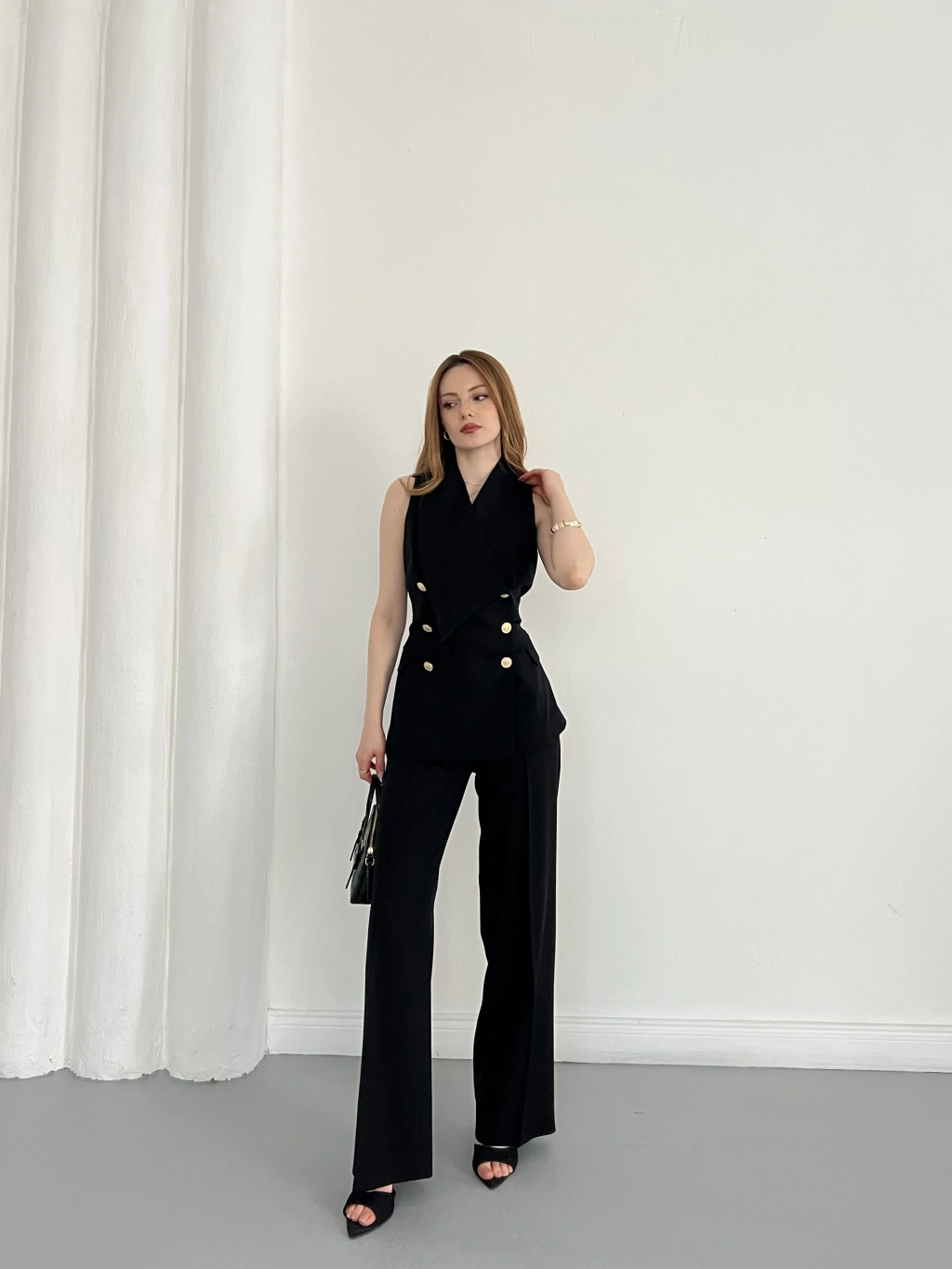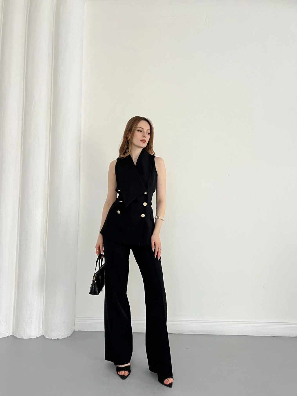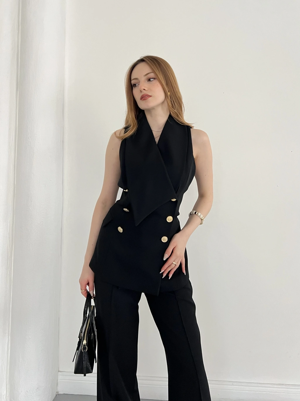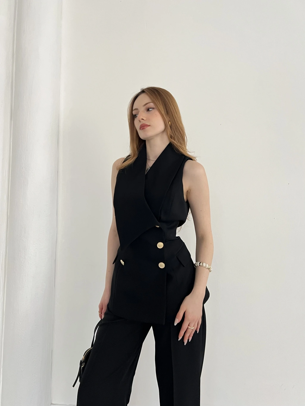 Gold Düğmeli Yelekli Pantolon Takım Siyah