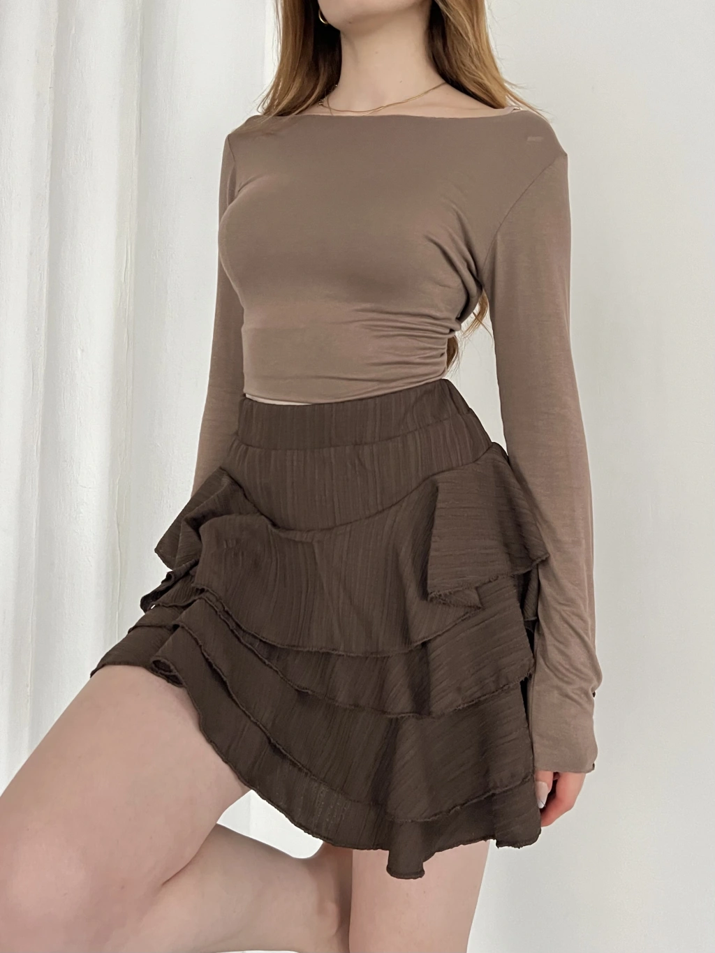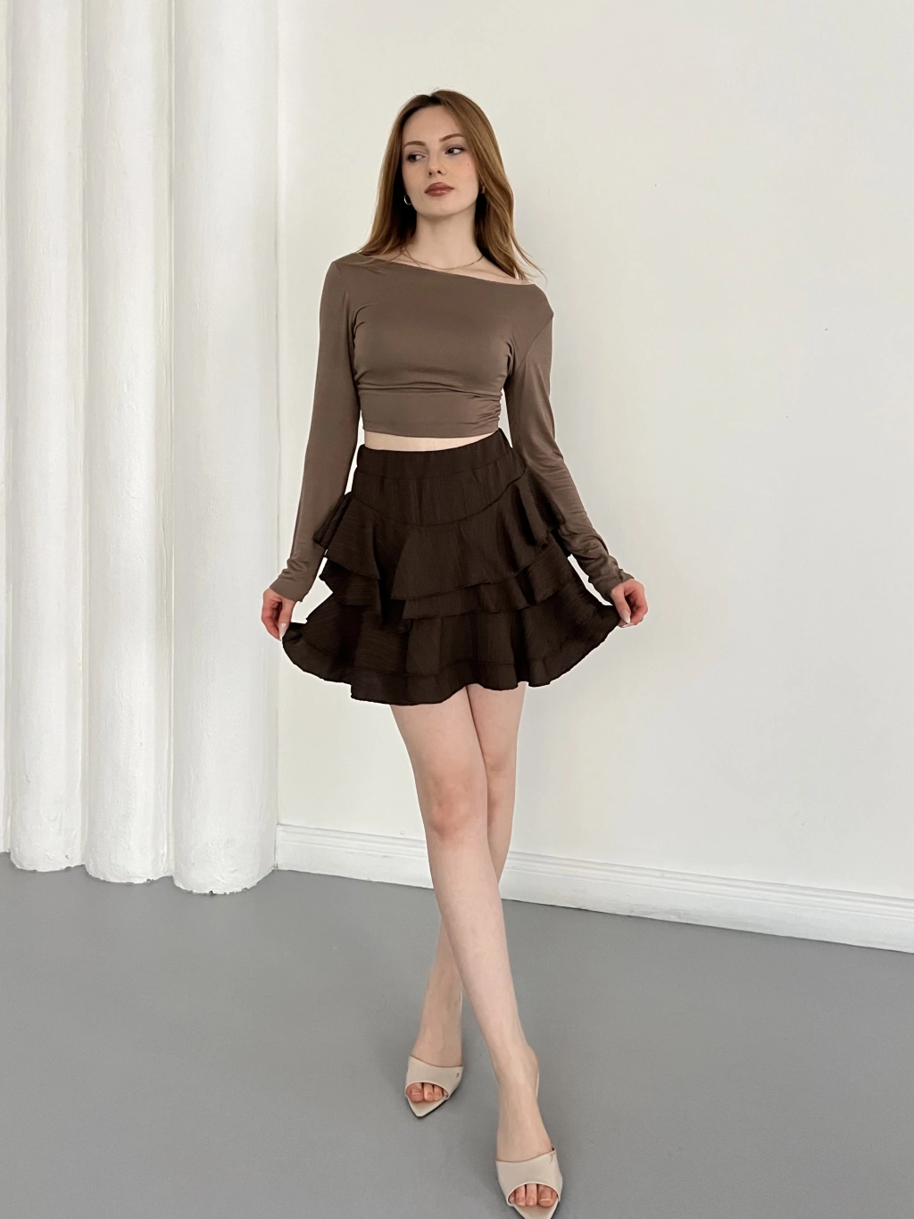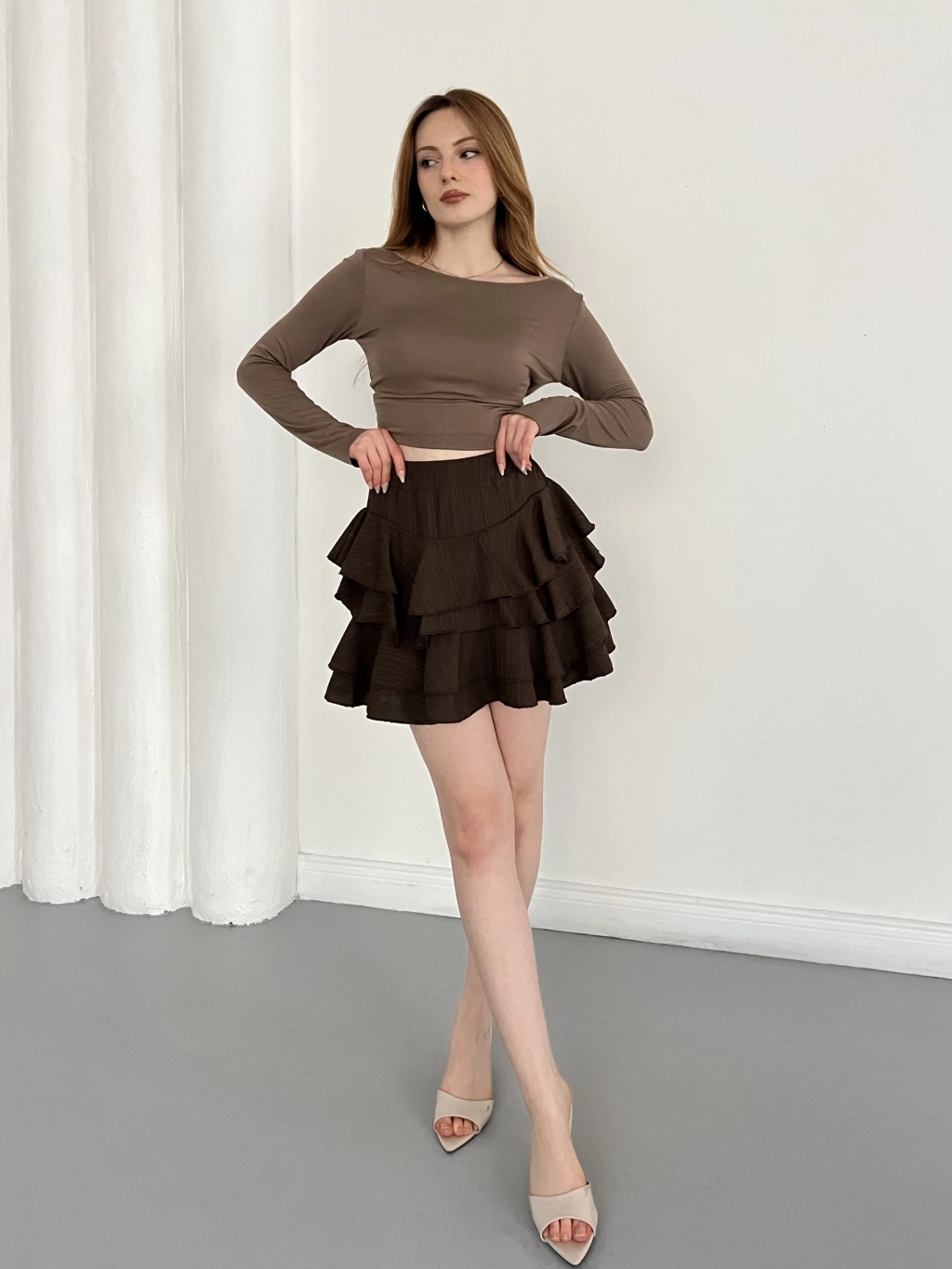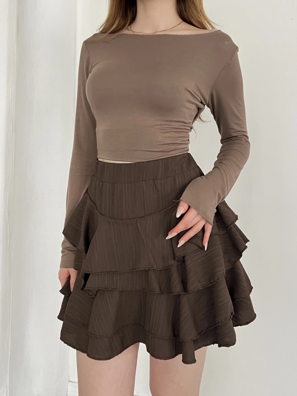 İçi Şortlu Fırfırlı Etek Kahve
