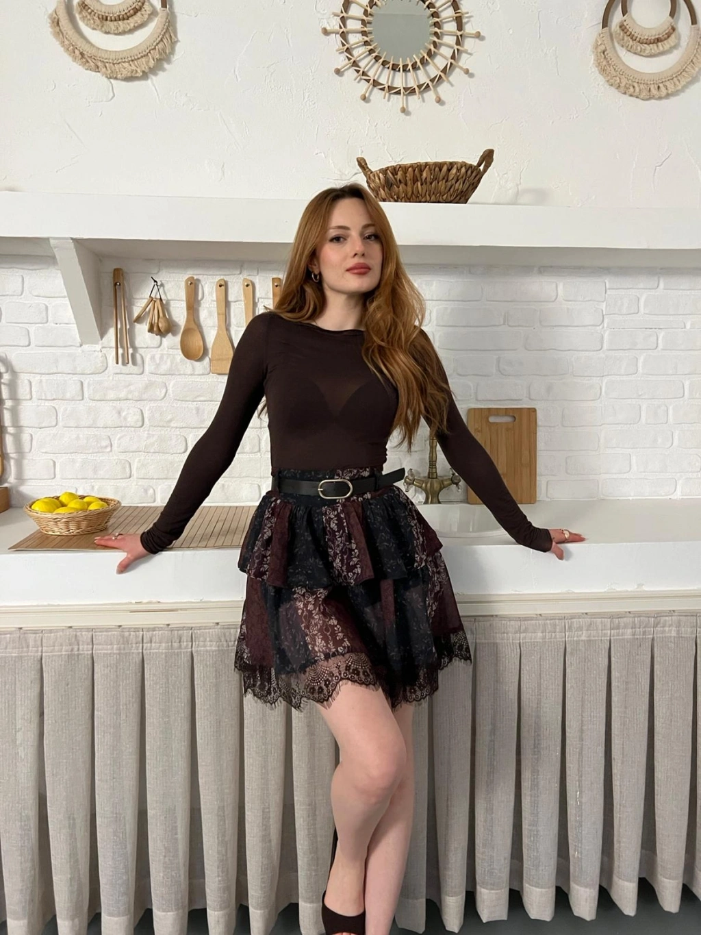 Arka Bağlama Detaylı Dantelli Elbise Kahve