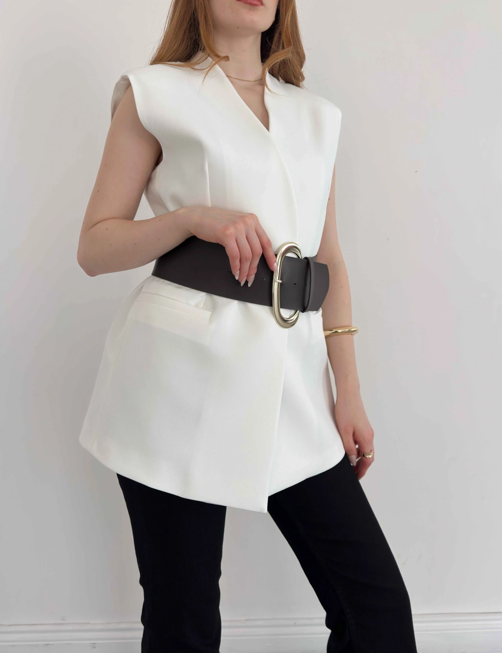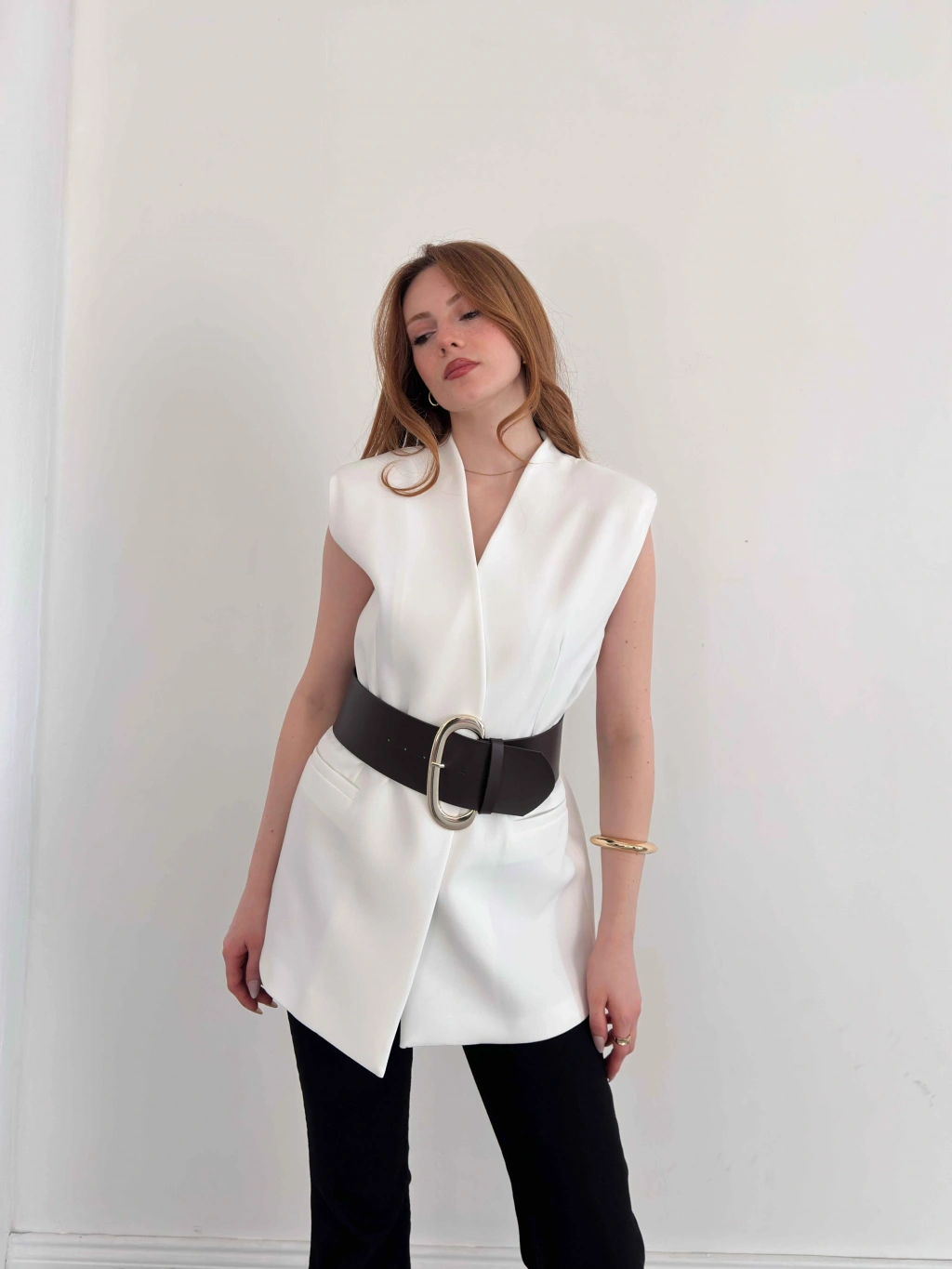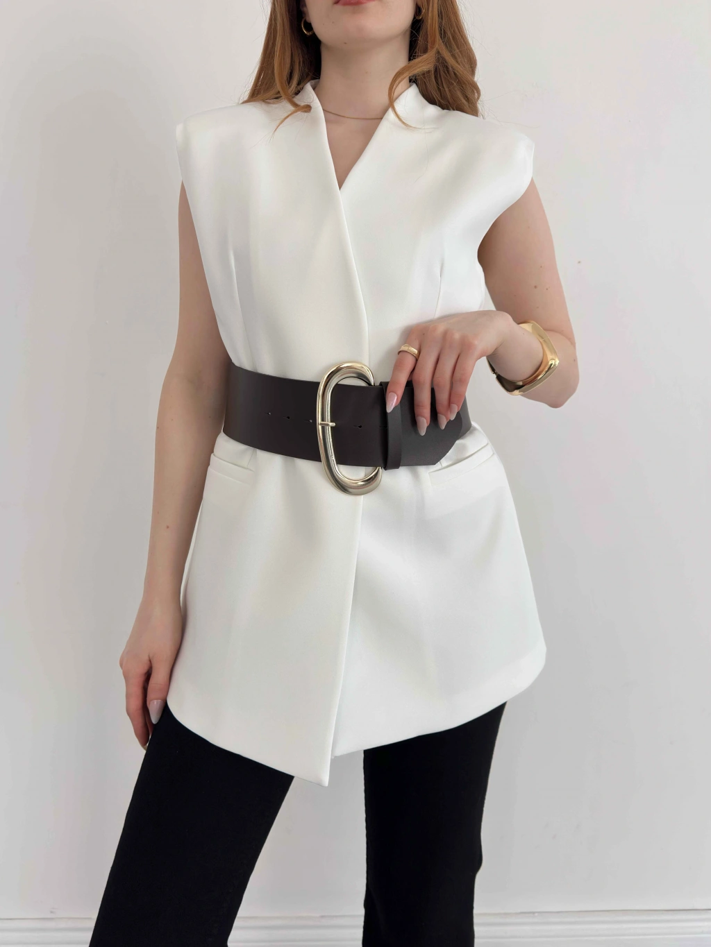 Kalın Kemer Detaylı Yelek Beyaz