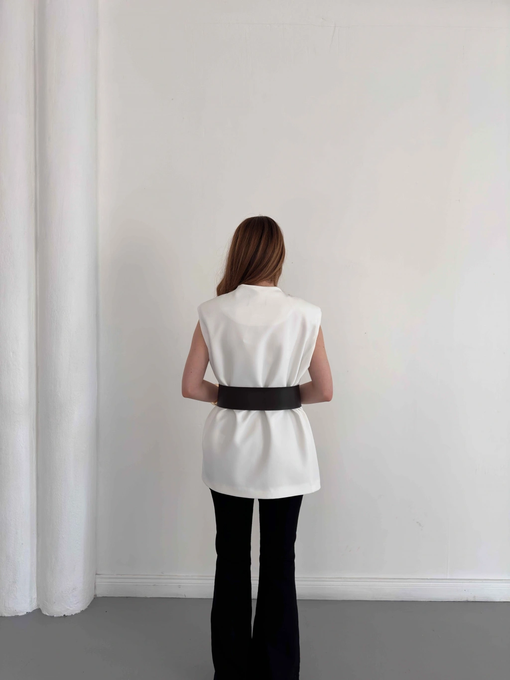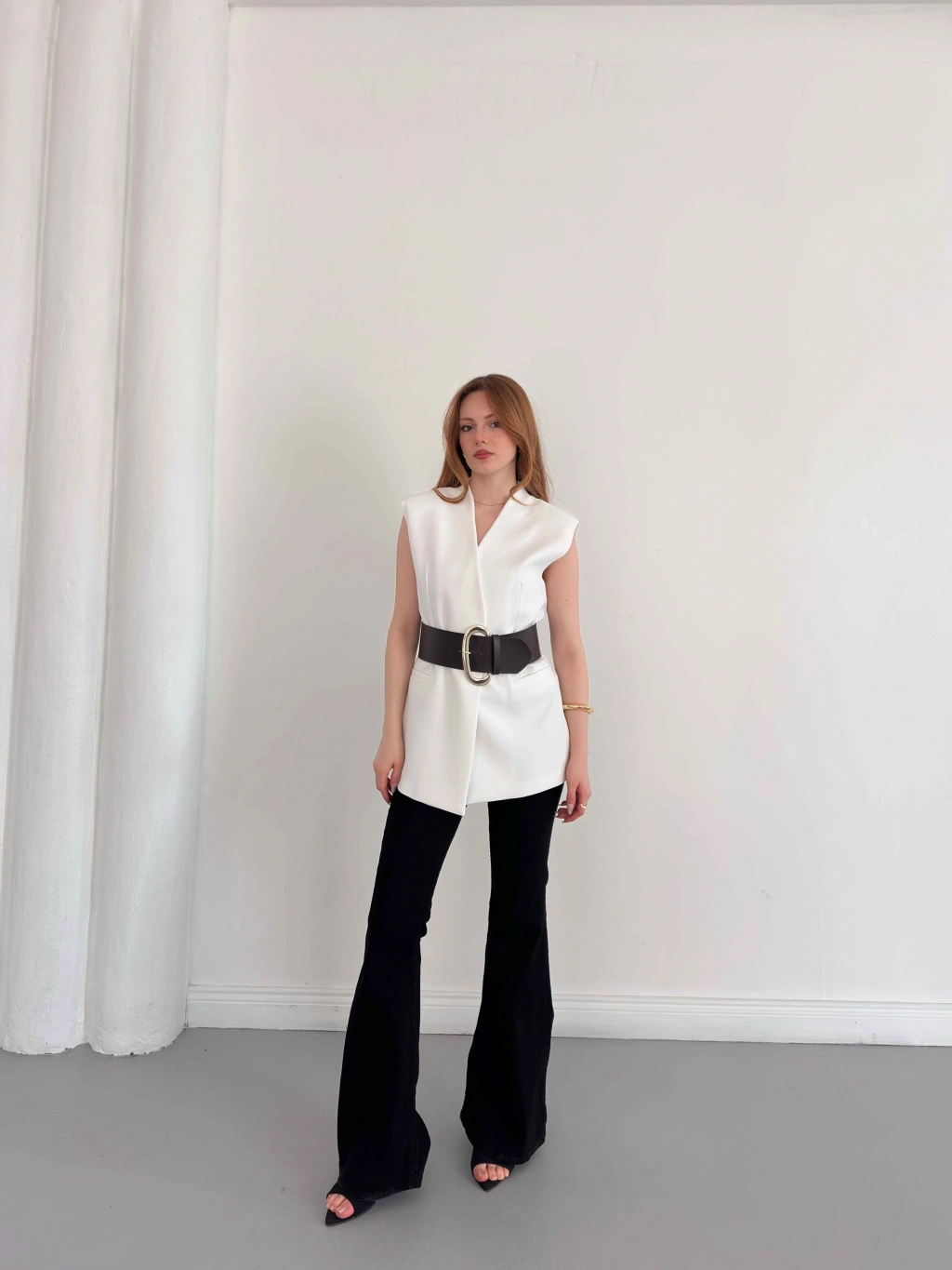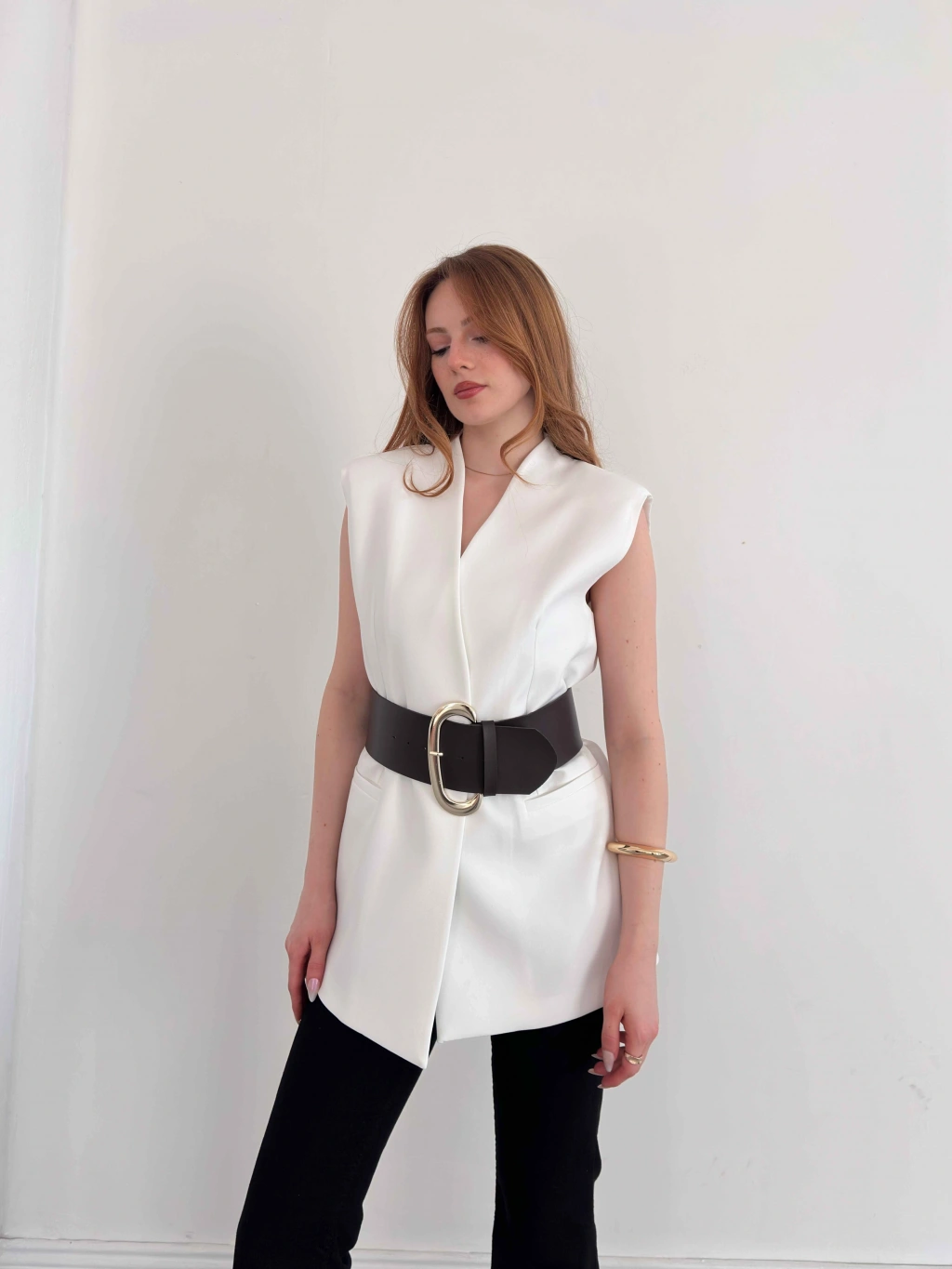 Kalın Kemer Detaylı Yelek Beyaz