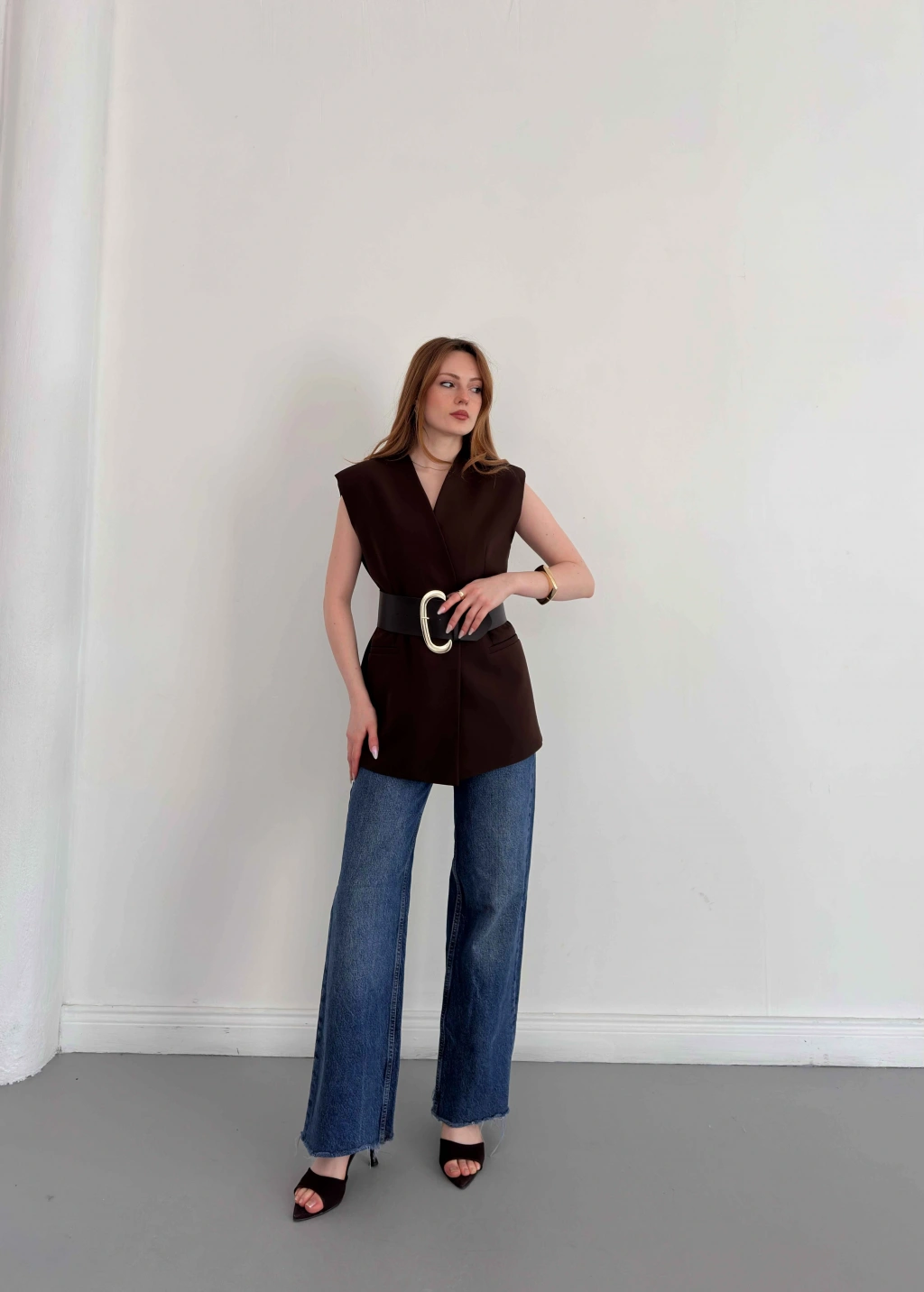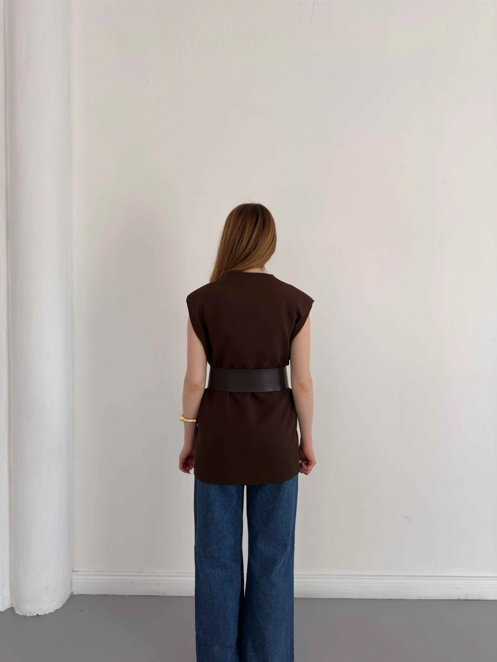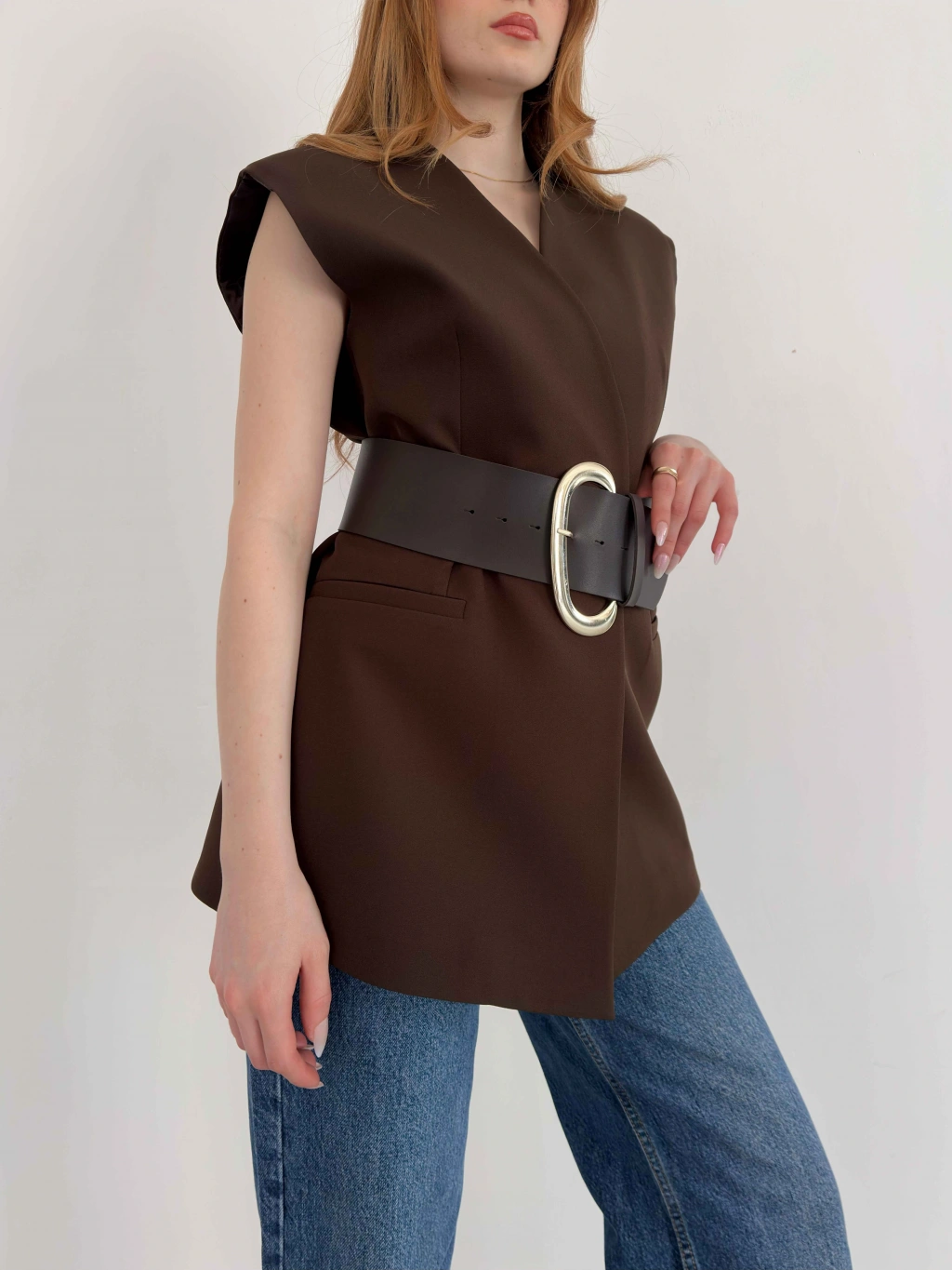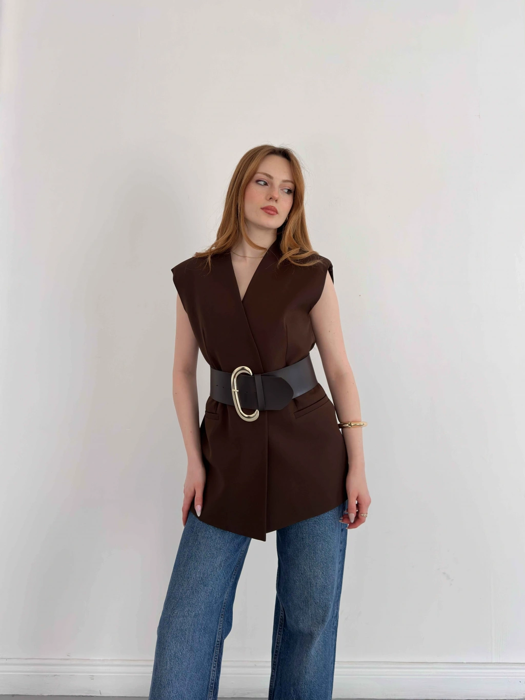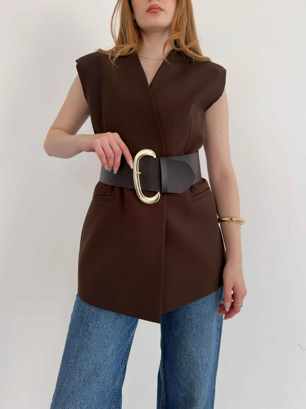 Kalın Kemer Detaylı Yelek Kahve