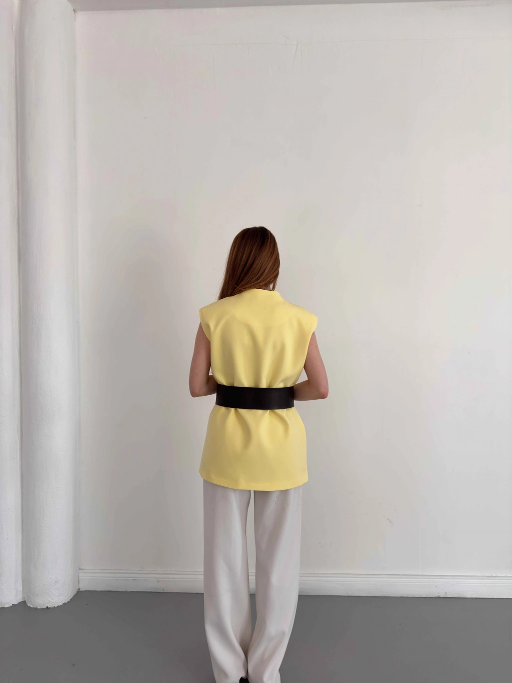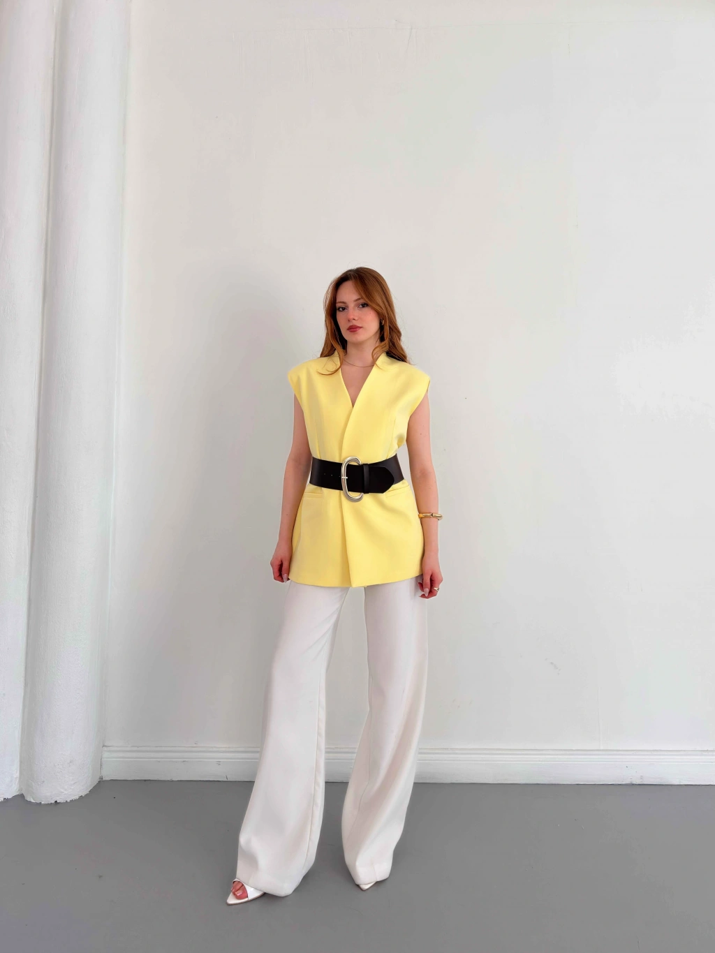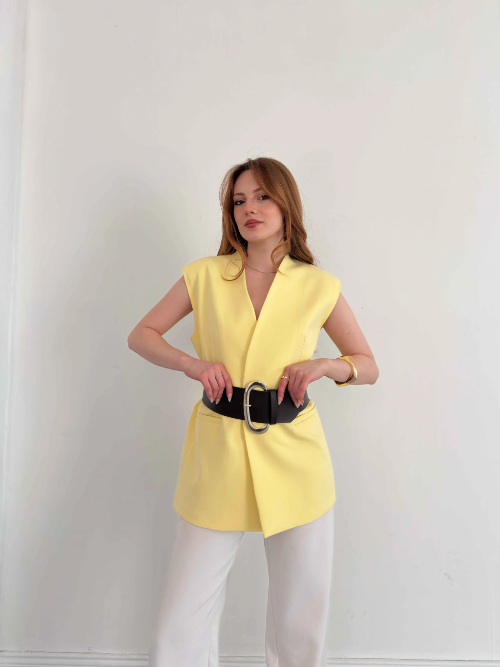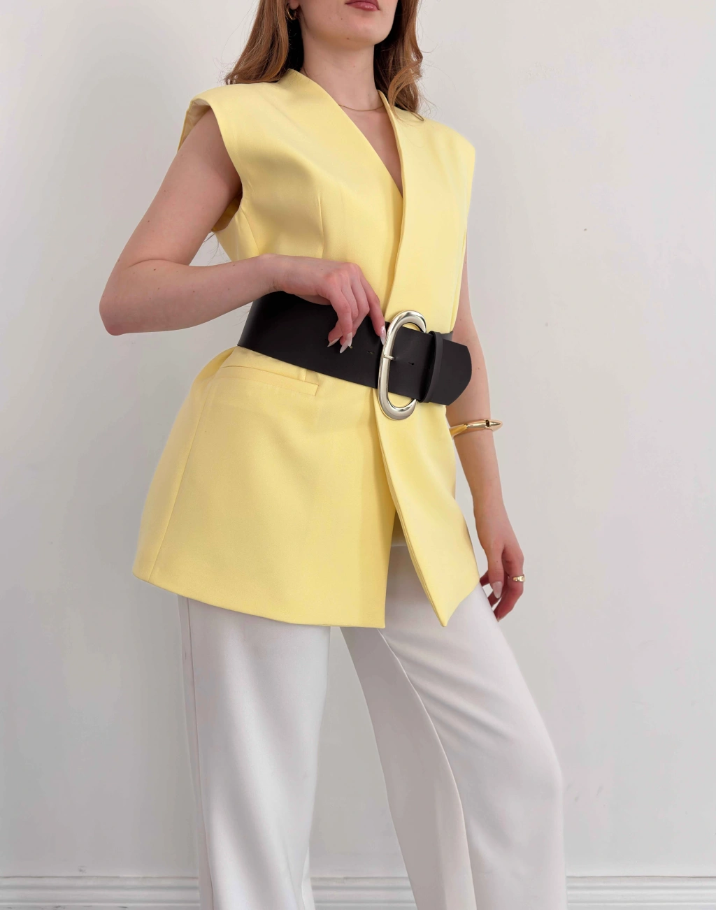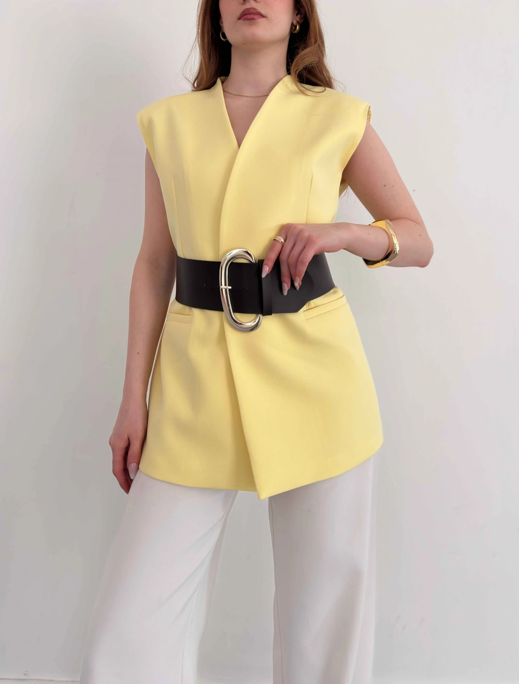 Kalın Kemer Detaylı Yelek Sarı