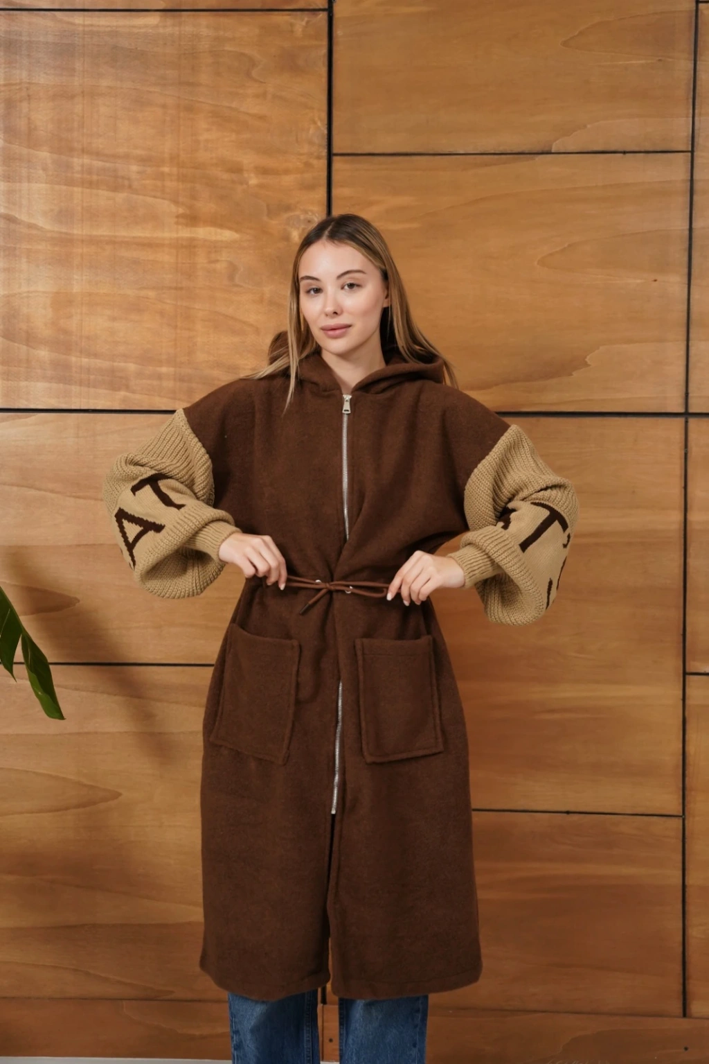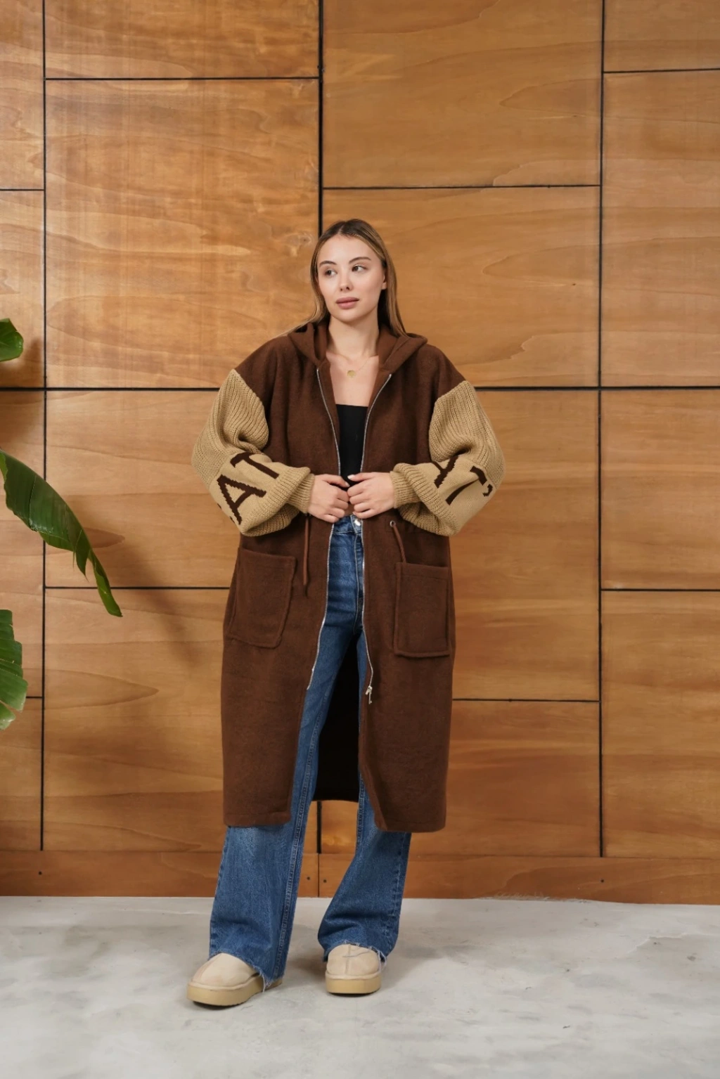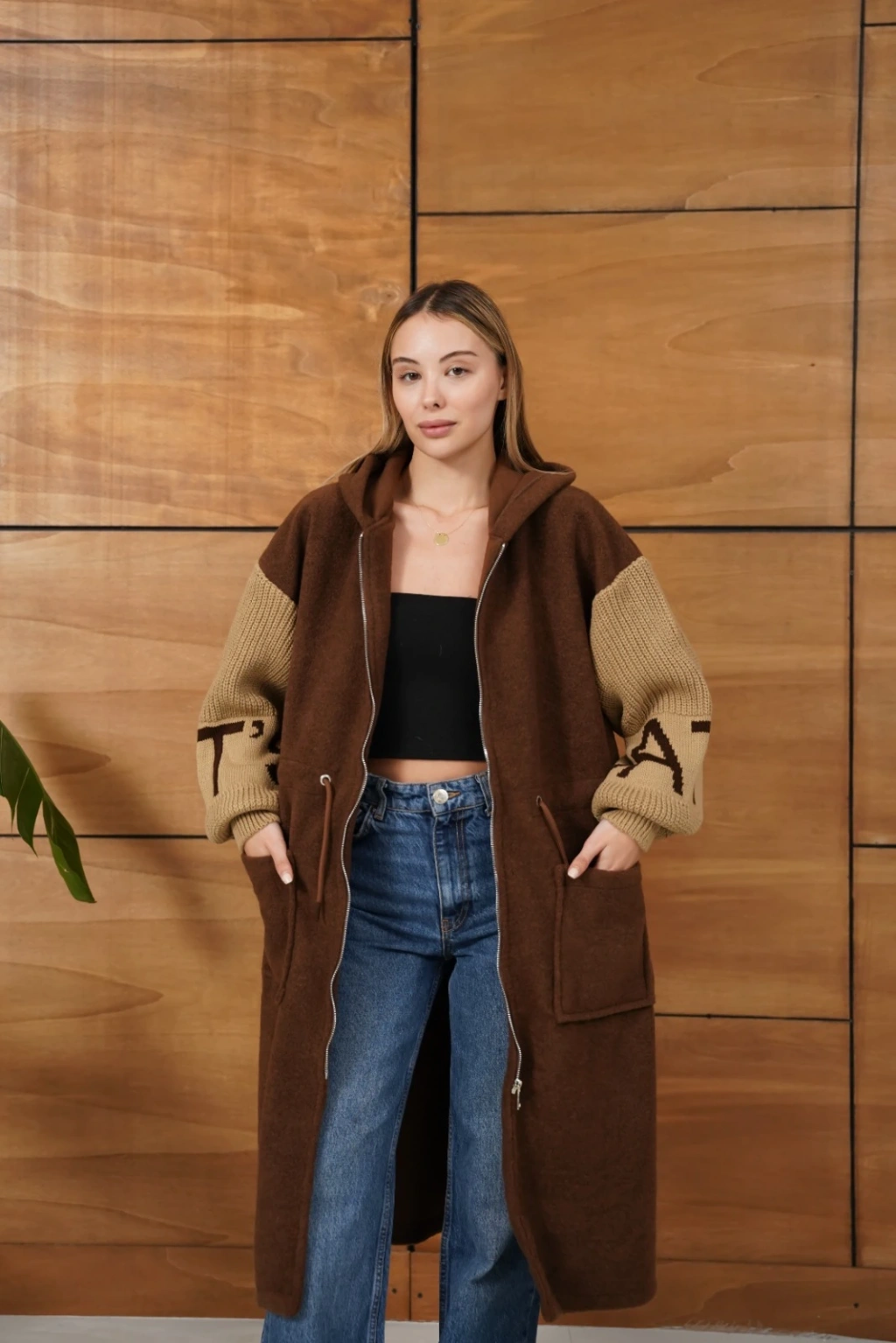 Kapüşonlu Fermuar Detay Triko Hırka Acı Kahve