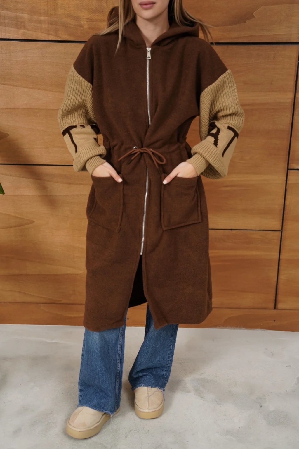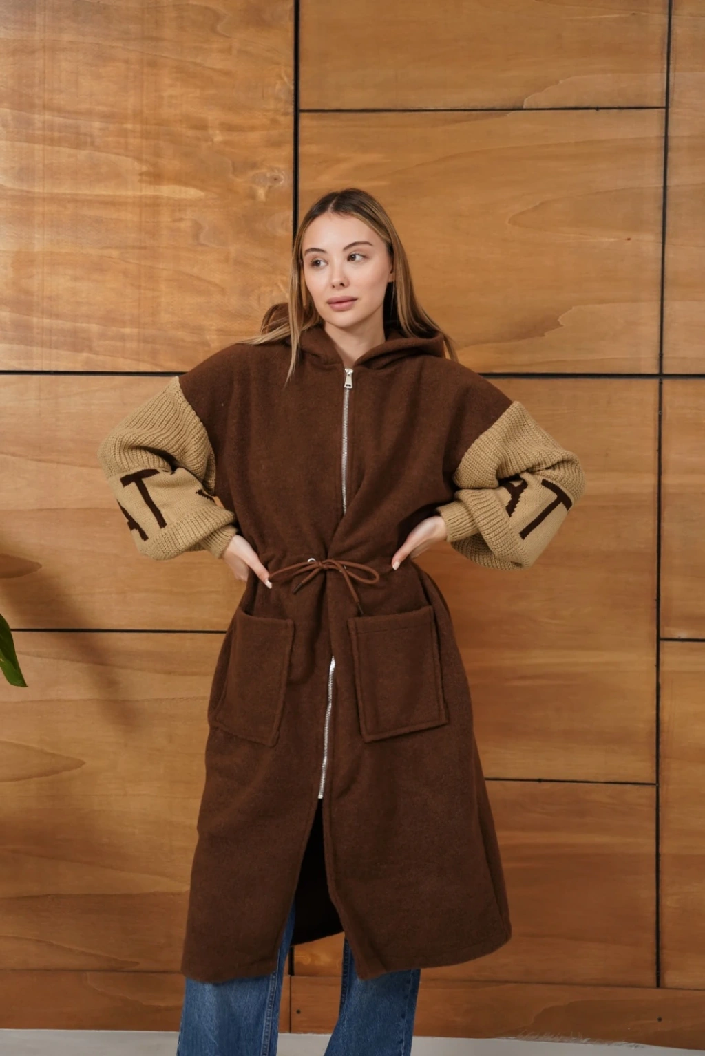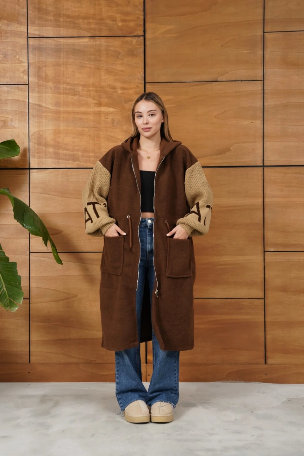 Kapüşonlu Fermuar Detay Triko Hırka Acı Kahve