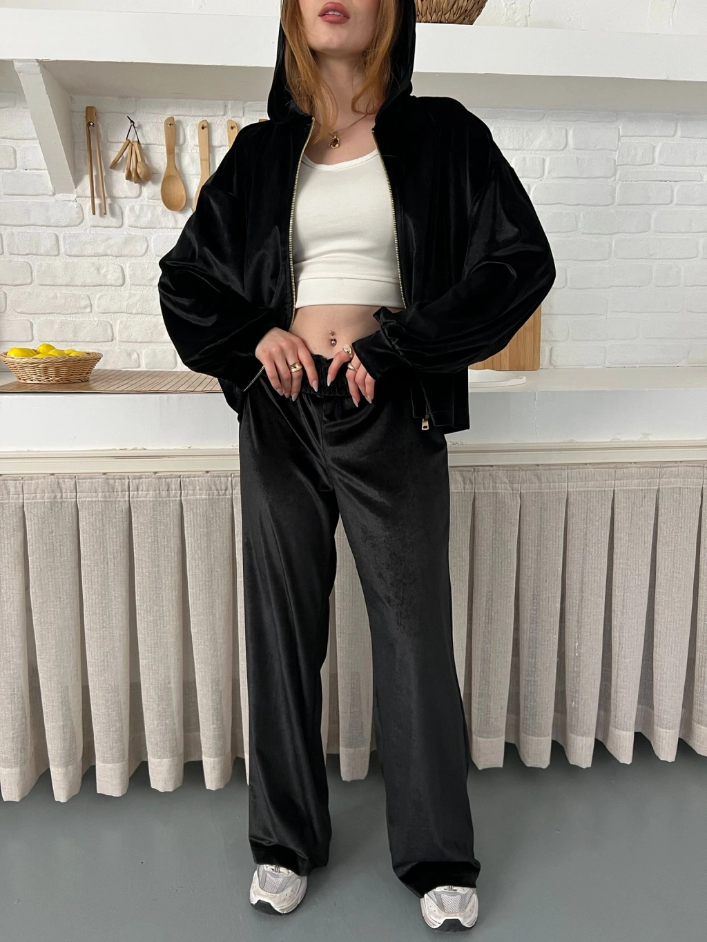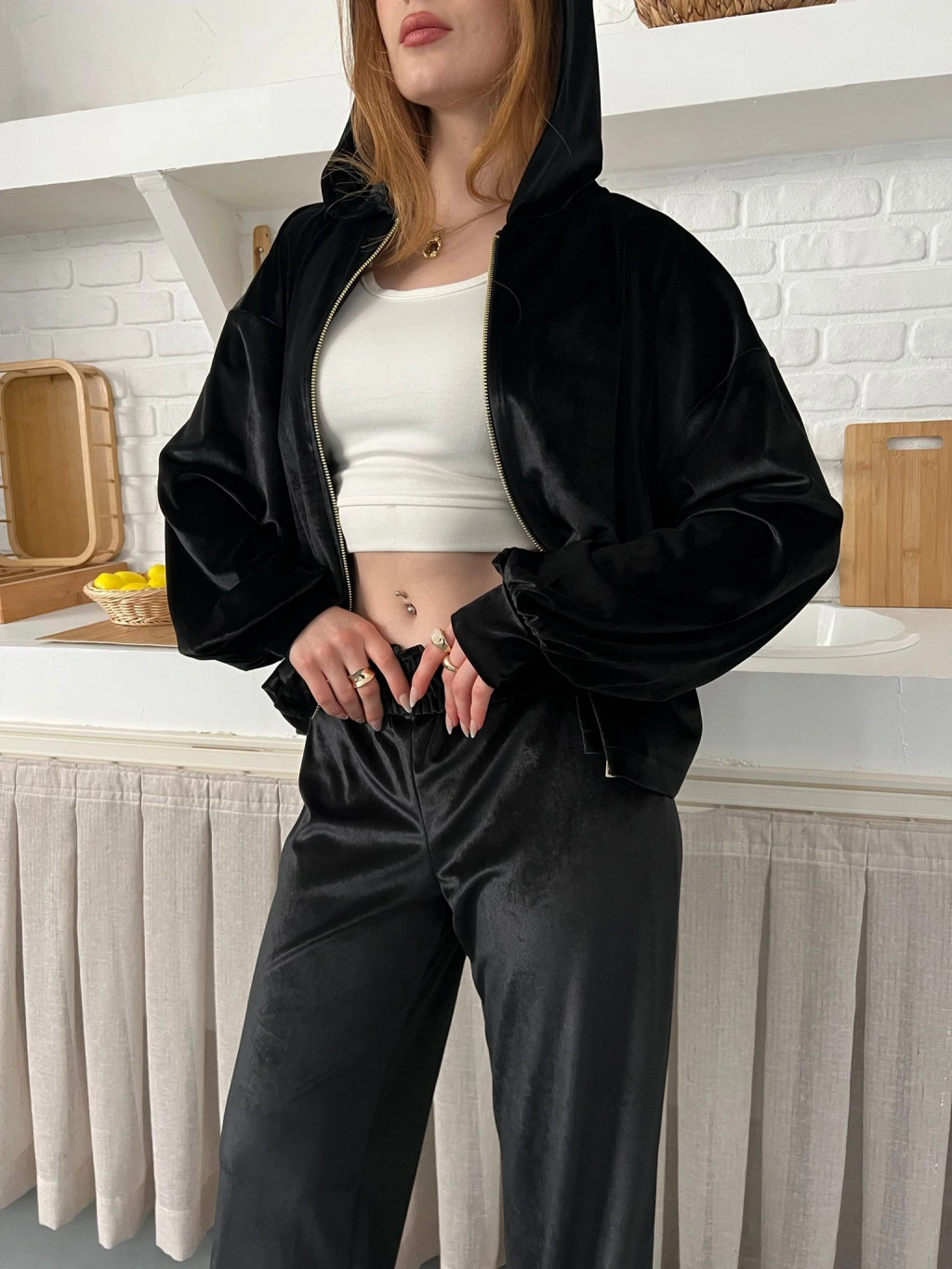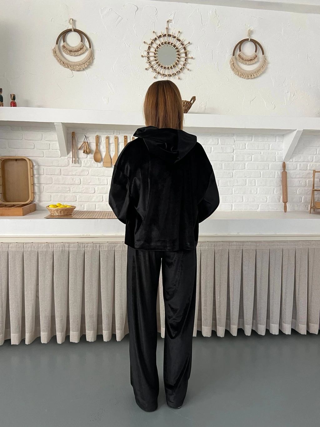 Kapüşonlu Kadife Takım Siyah