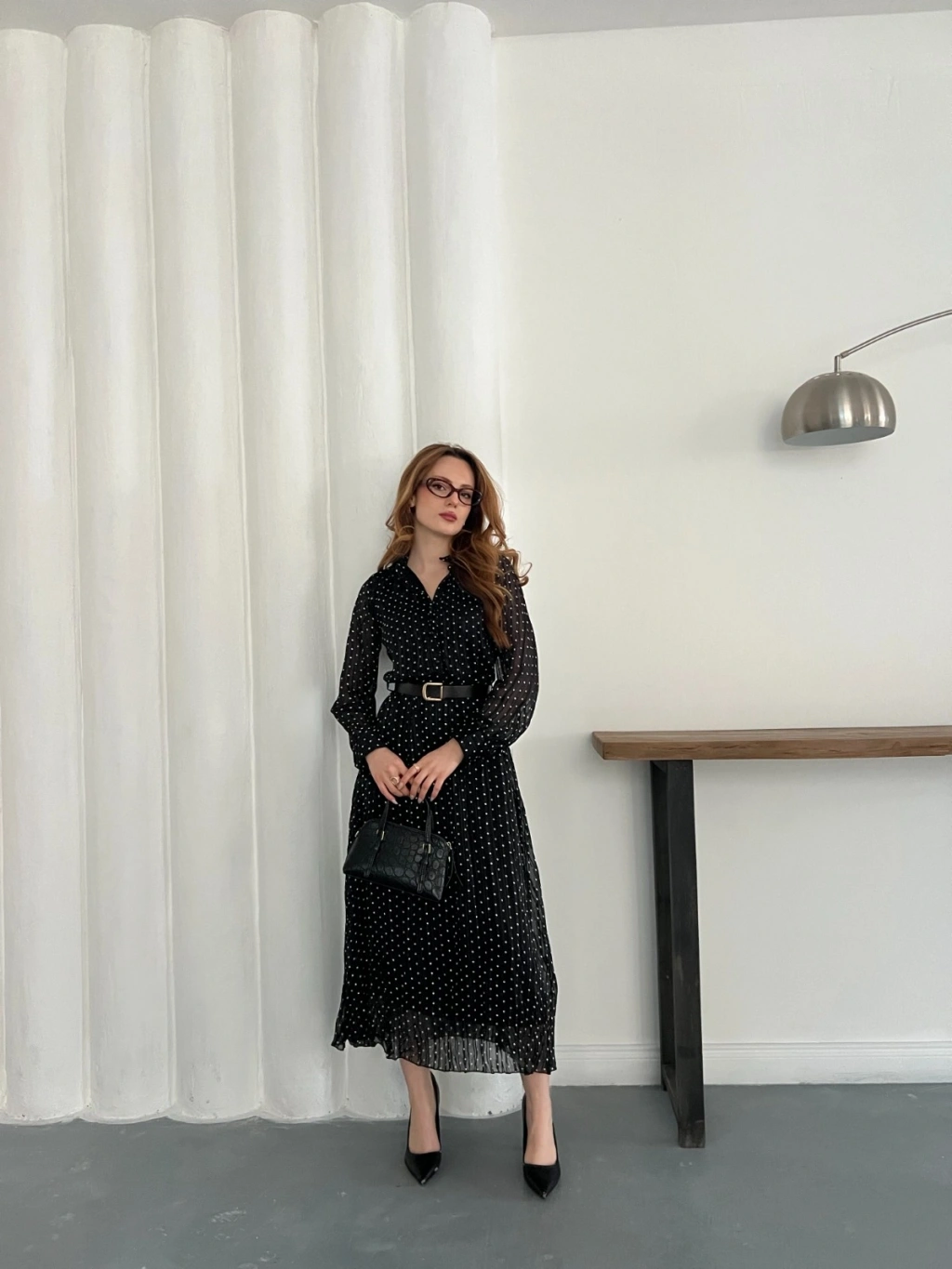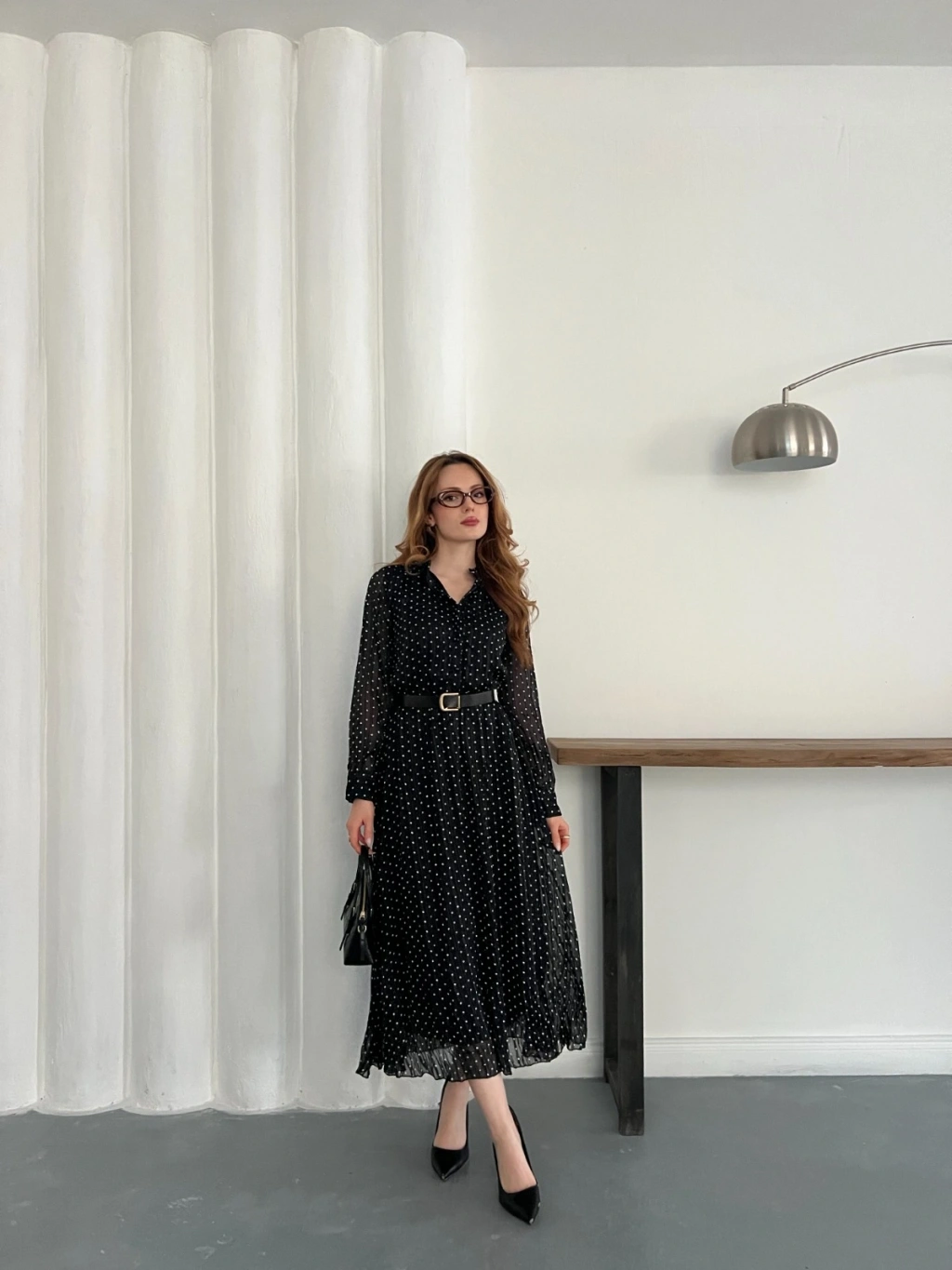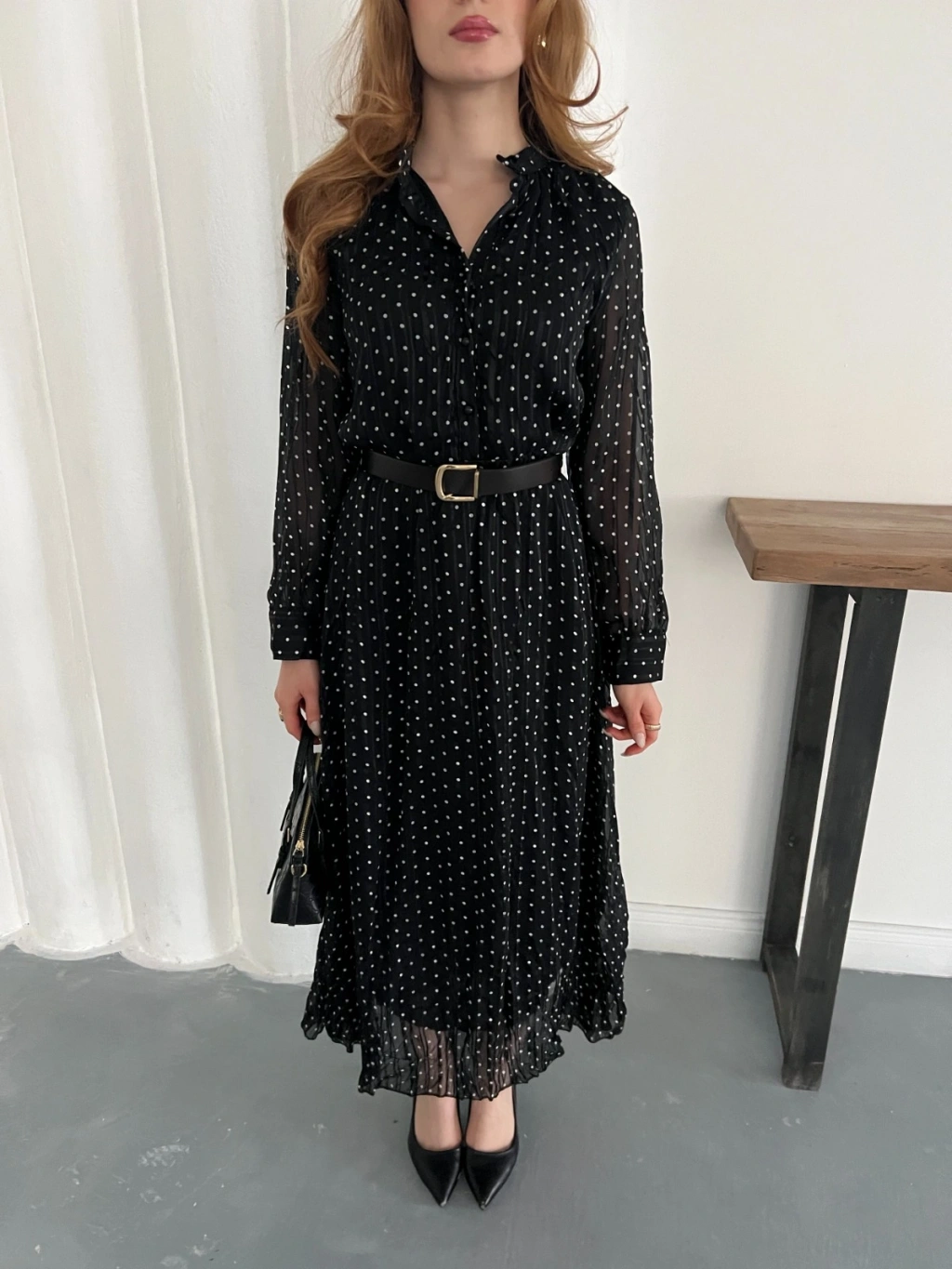 Kemer Detaylı Astarlı Şifon Elbise Siyah