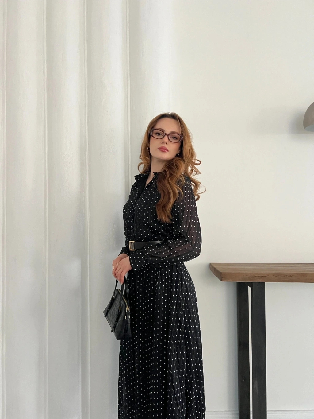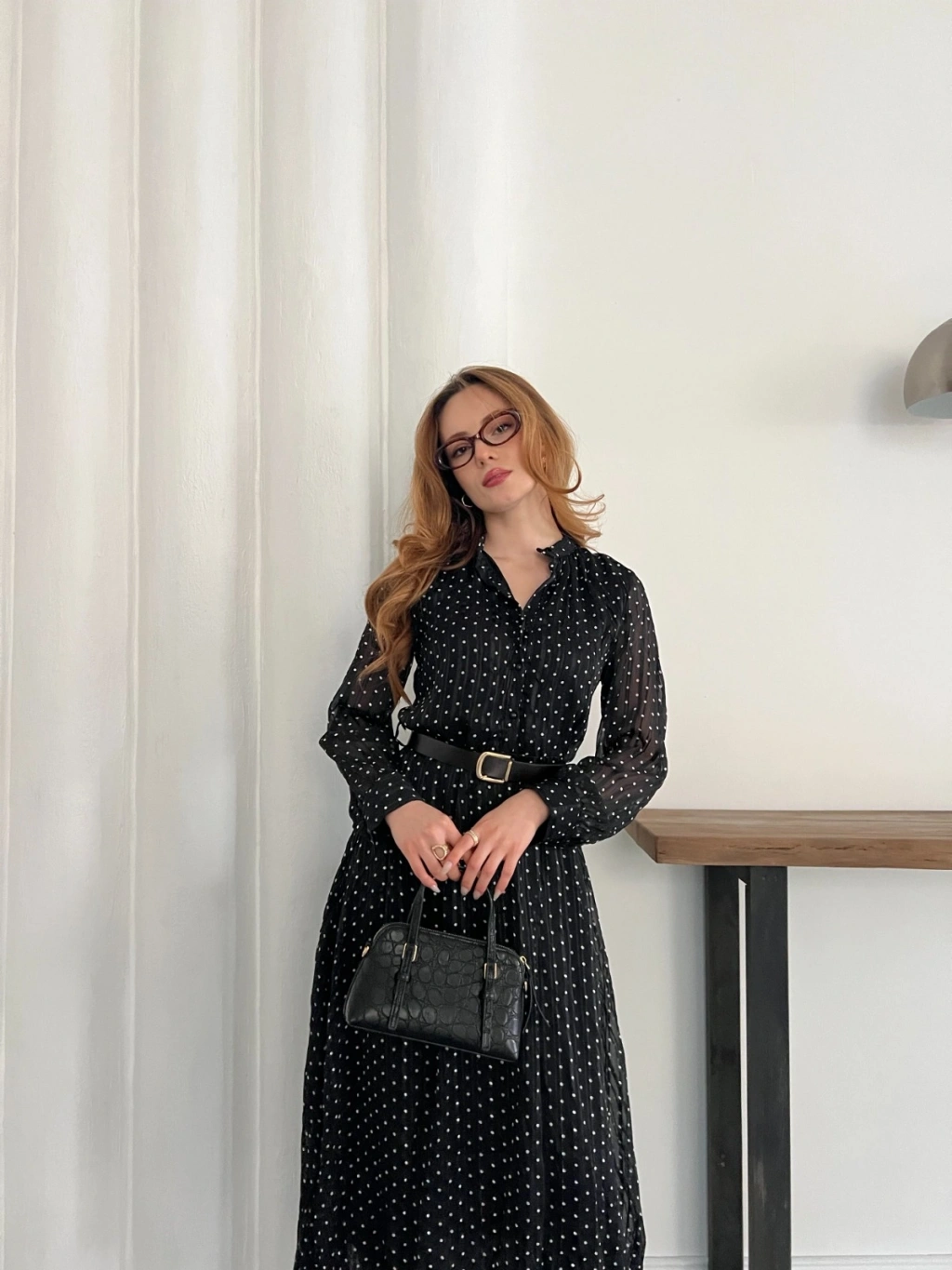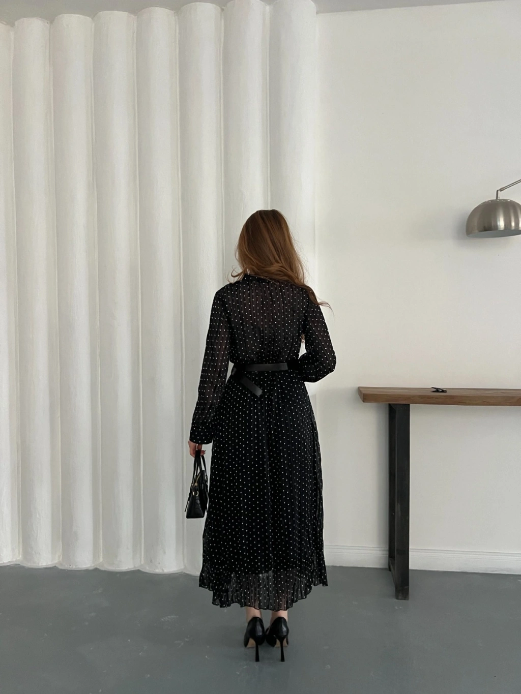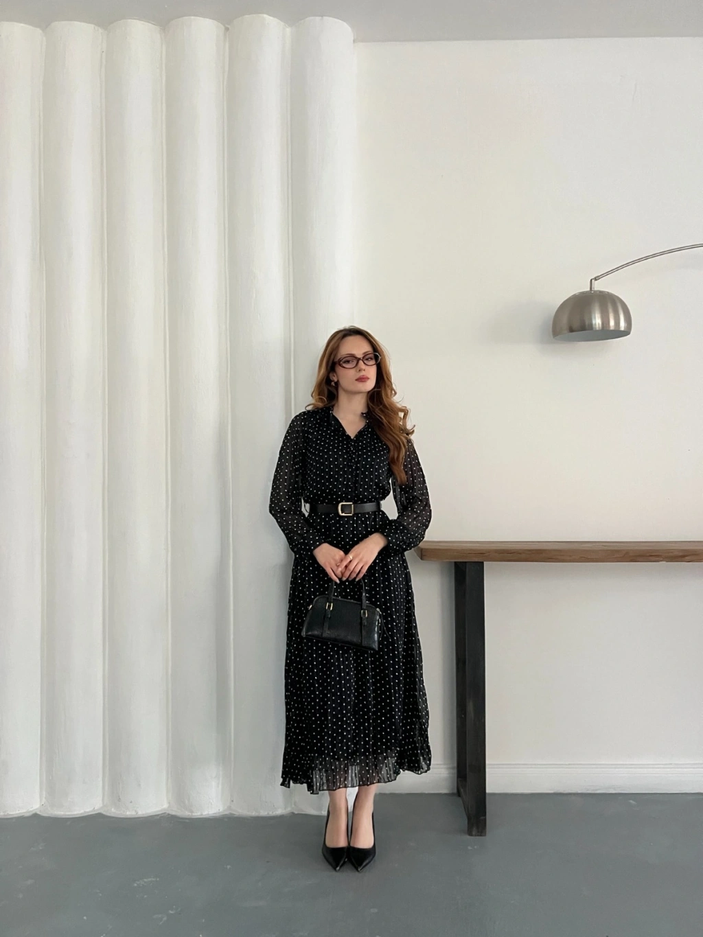 Kemer Detaylı Astarlı Şifon Elbise Siyah