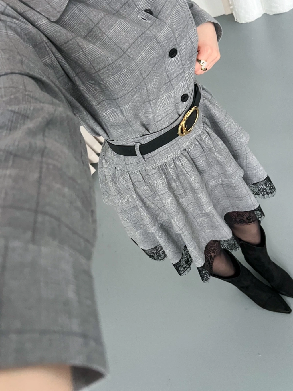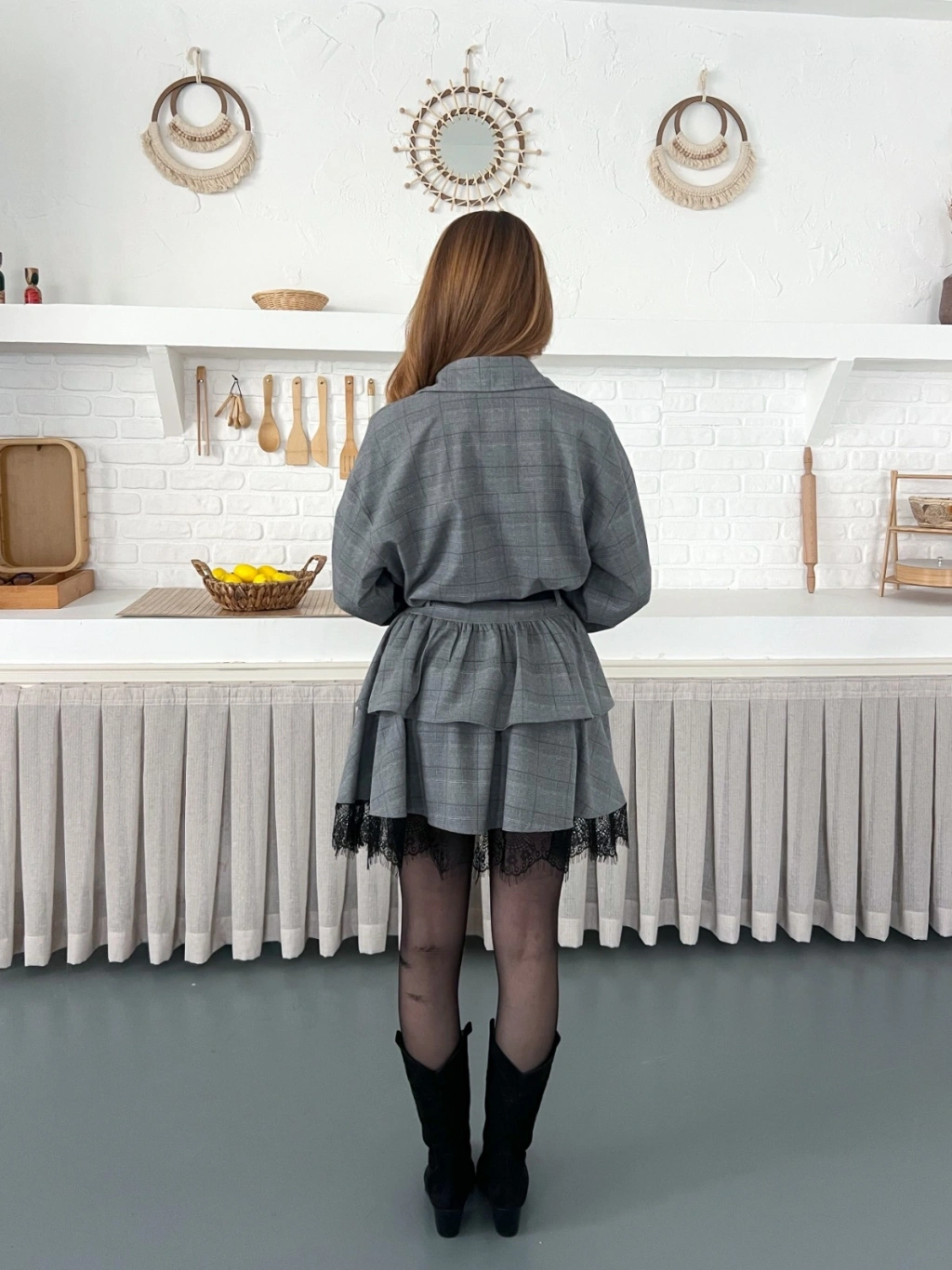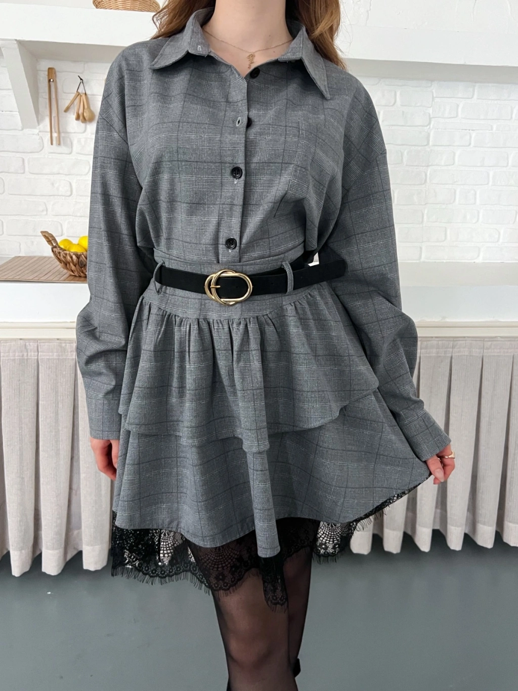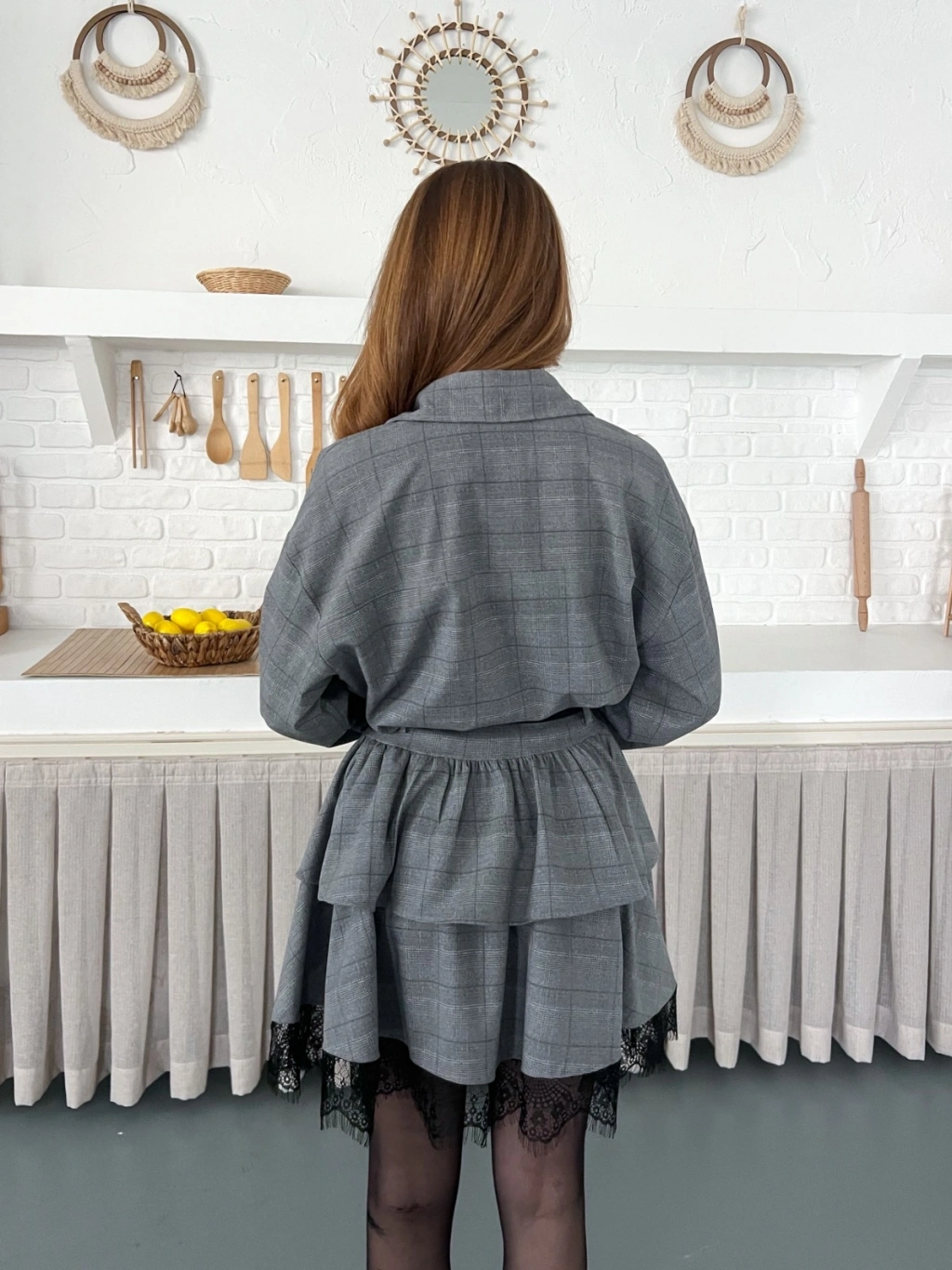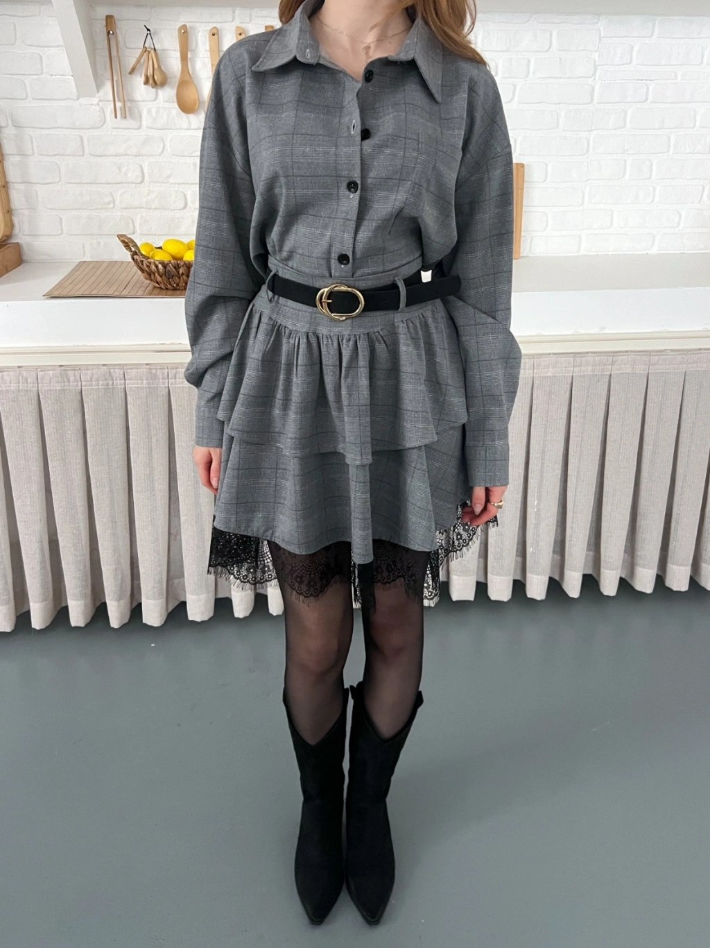 Kemer Detaylı Ekose Kumaş Dantel Etekli Takım Gri
