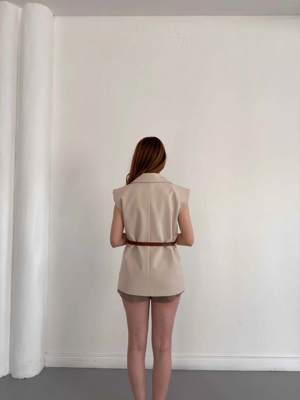 Kemer Detaylı Kruvaze Yaka Yelek Bej
