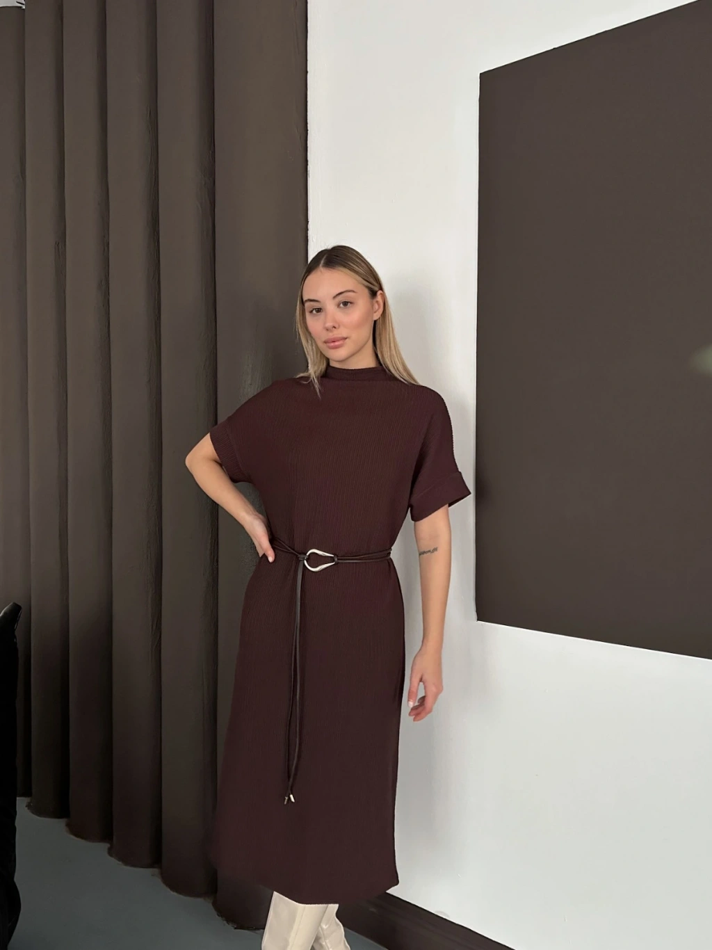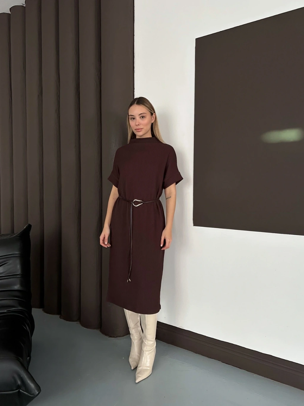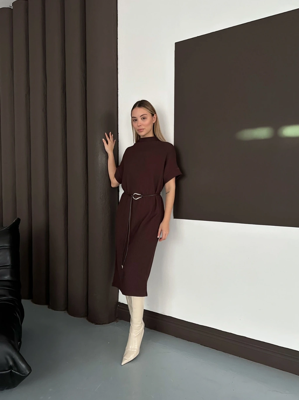 Kemer Detaylı Selanik Kumaş Uzun Elbise