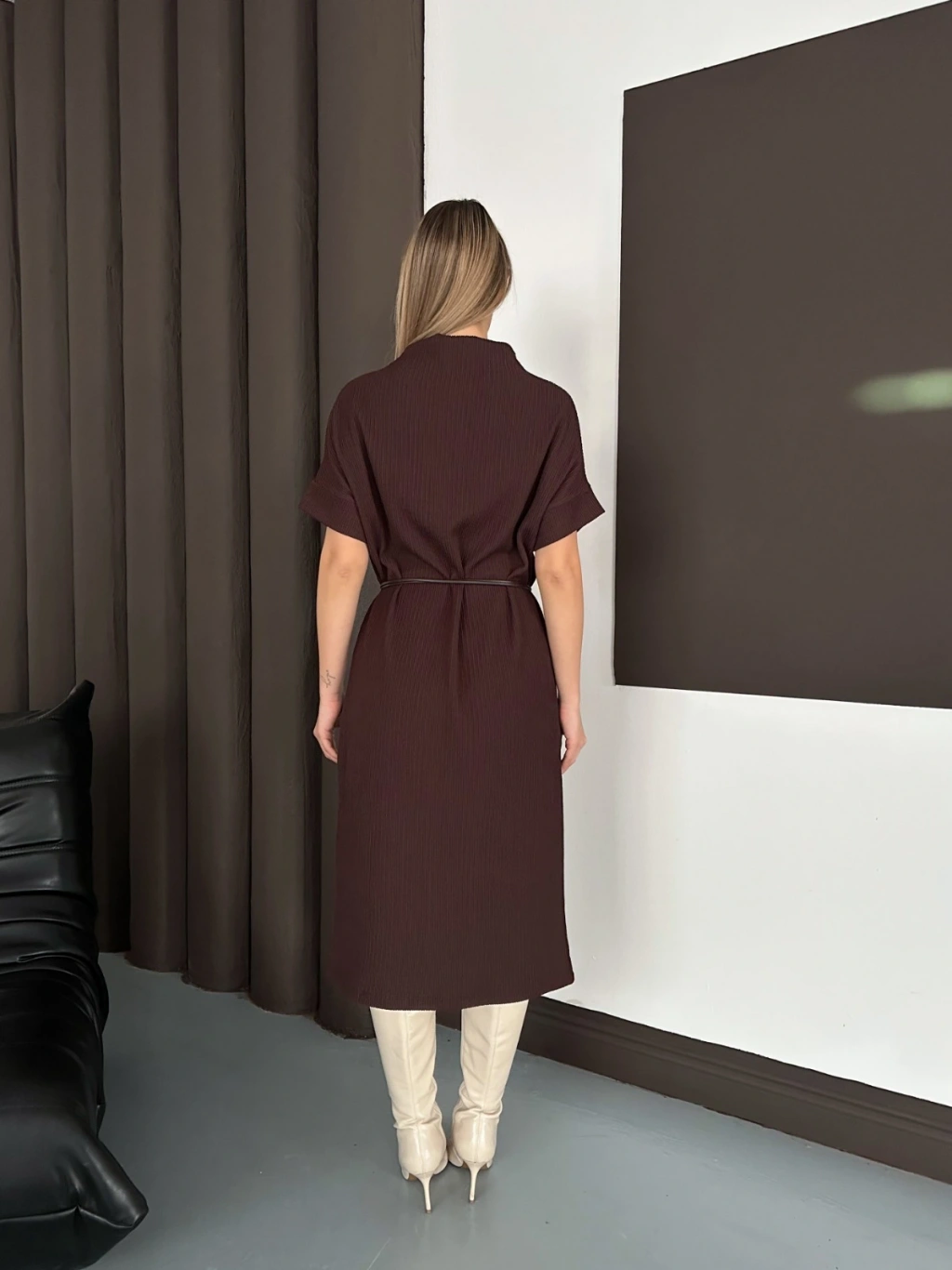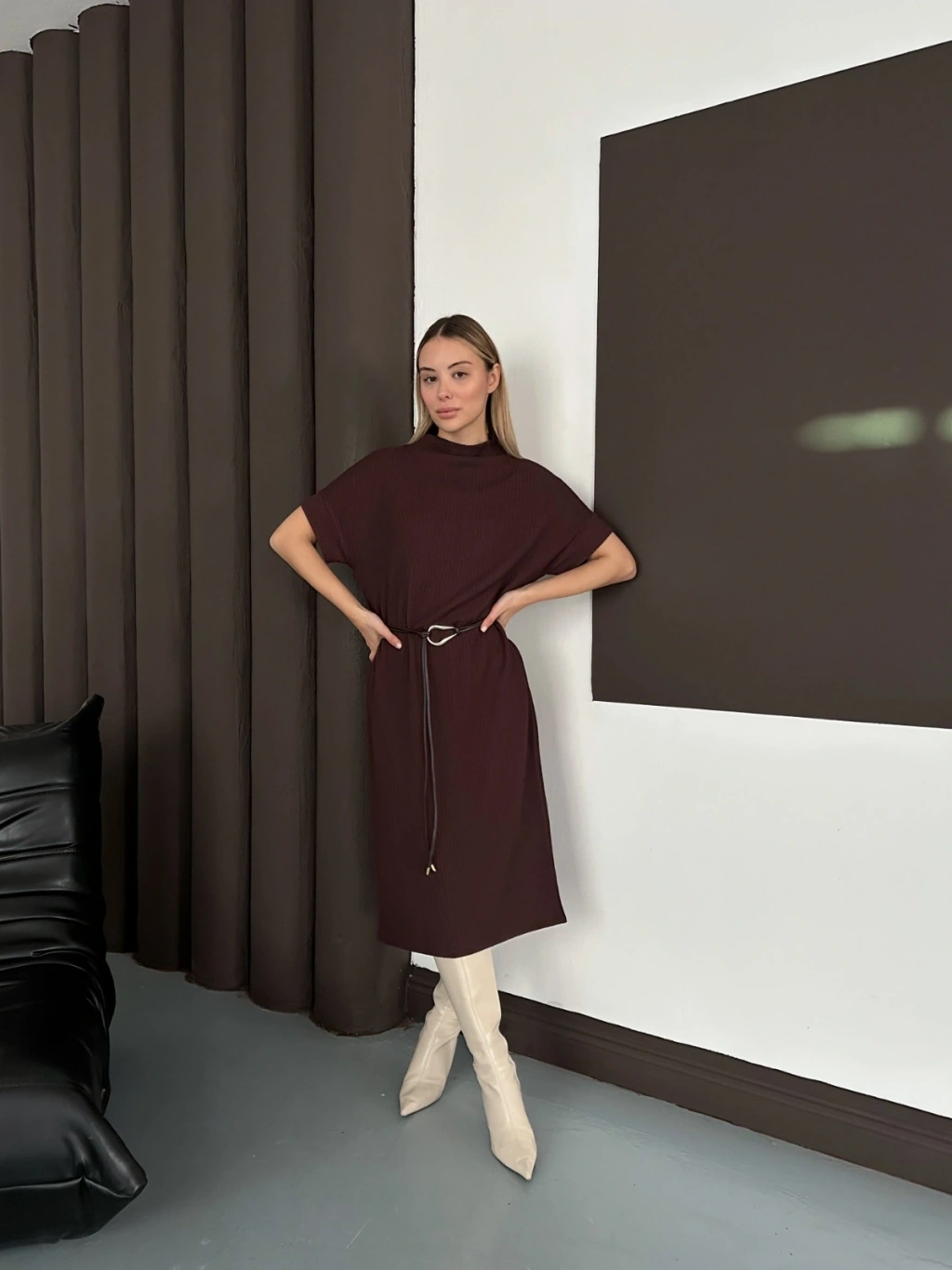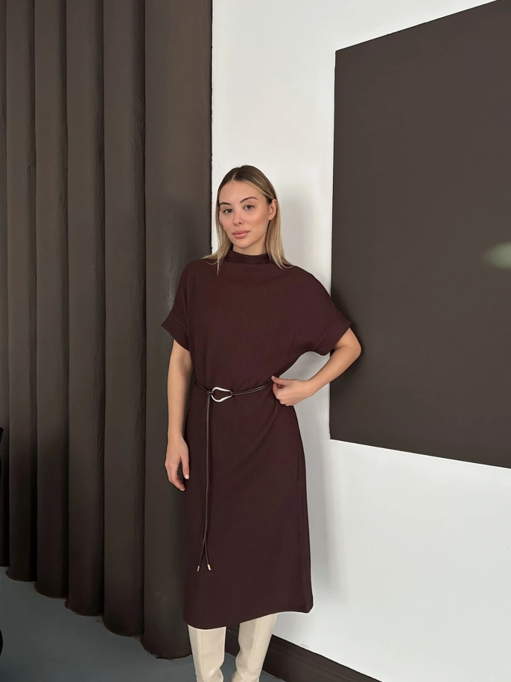 Kemer Detaylı Selanik Kumaş Uzun Elbise