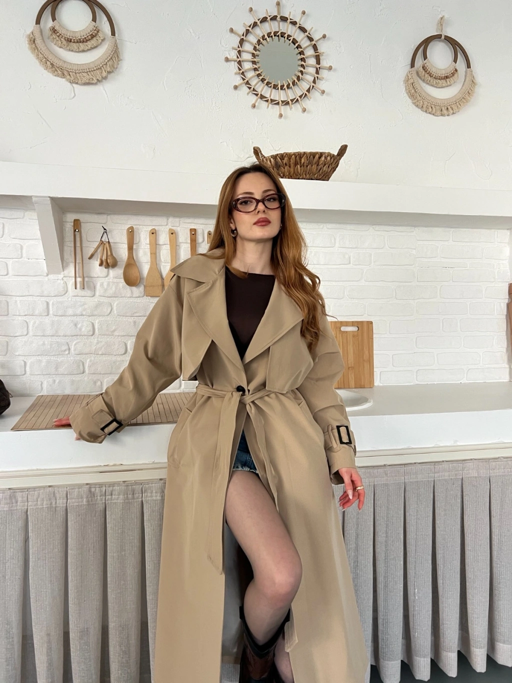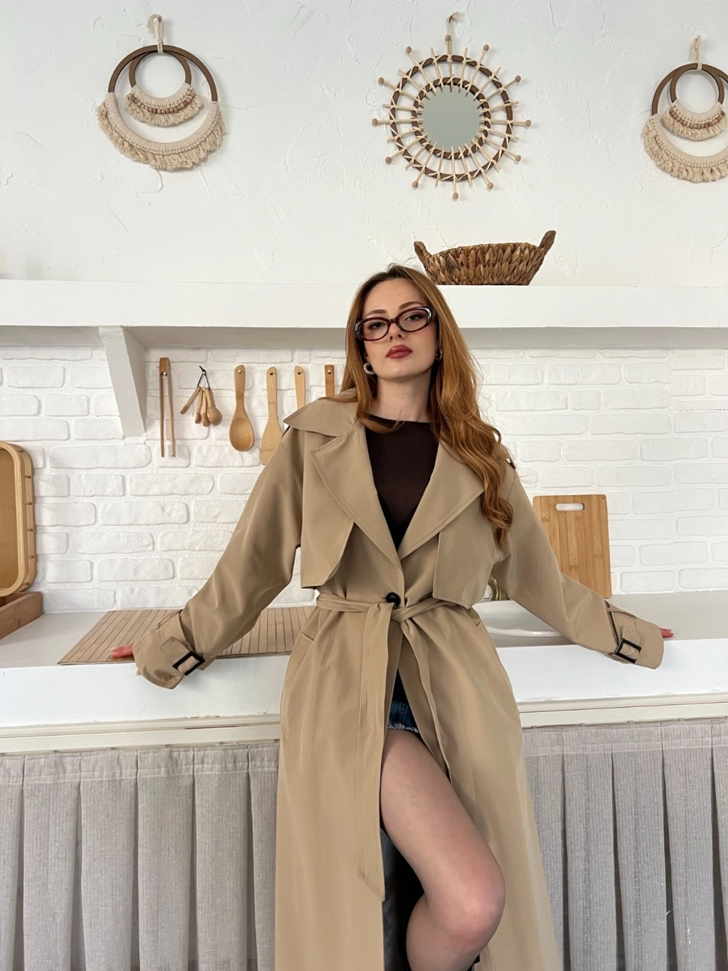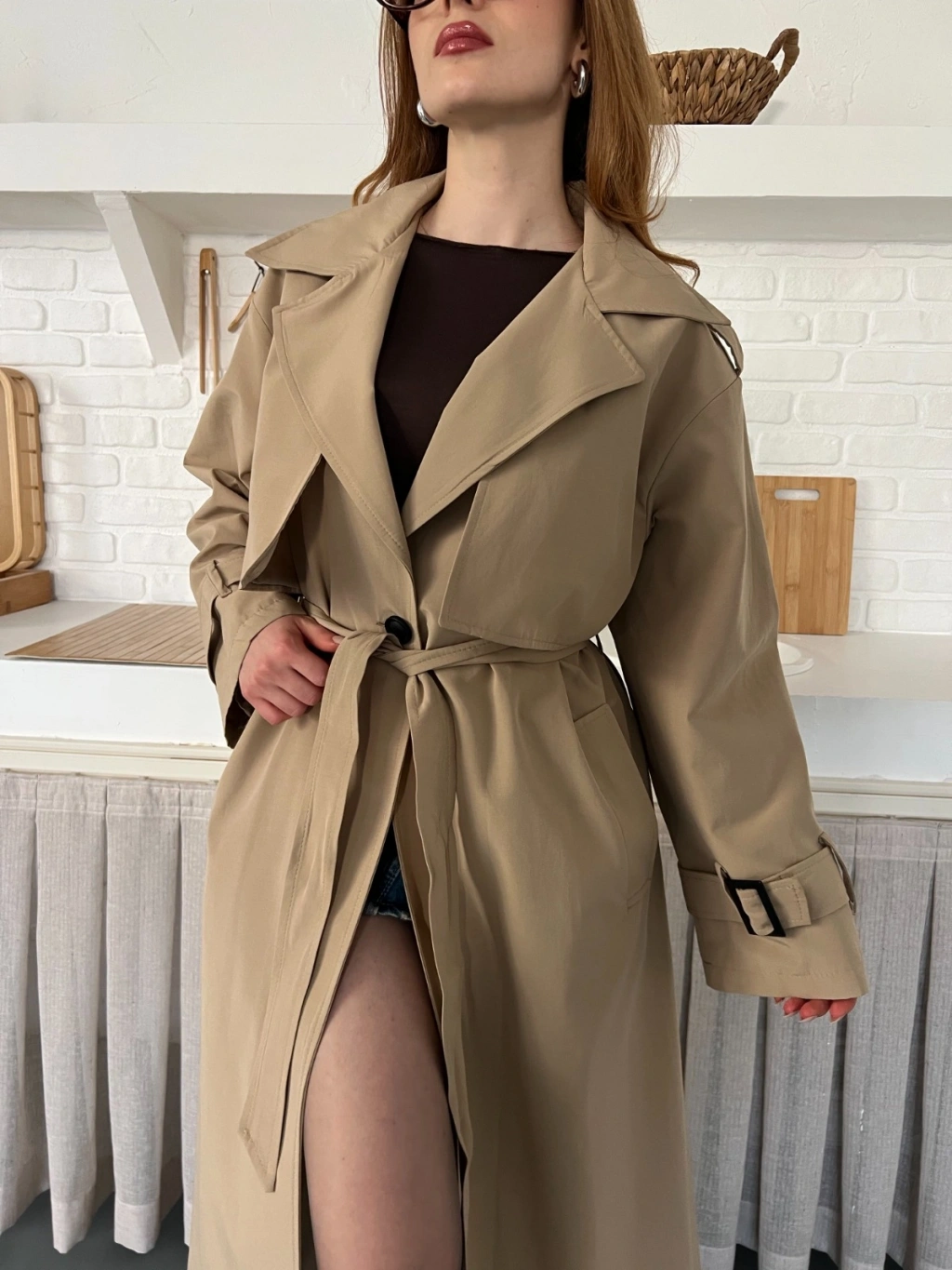 Kemer ve Manşet Detaylı Uzun Trençkot Camel