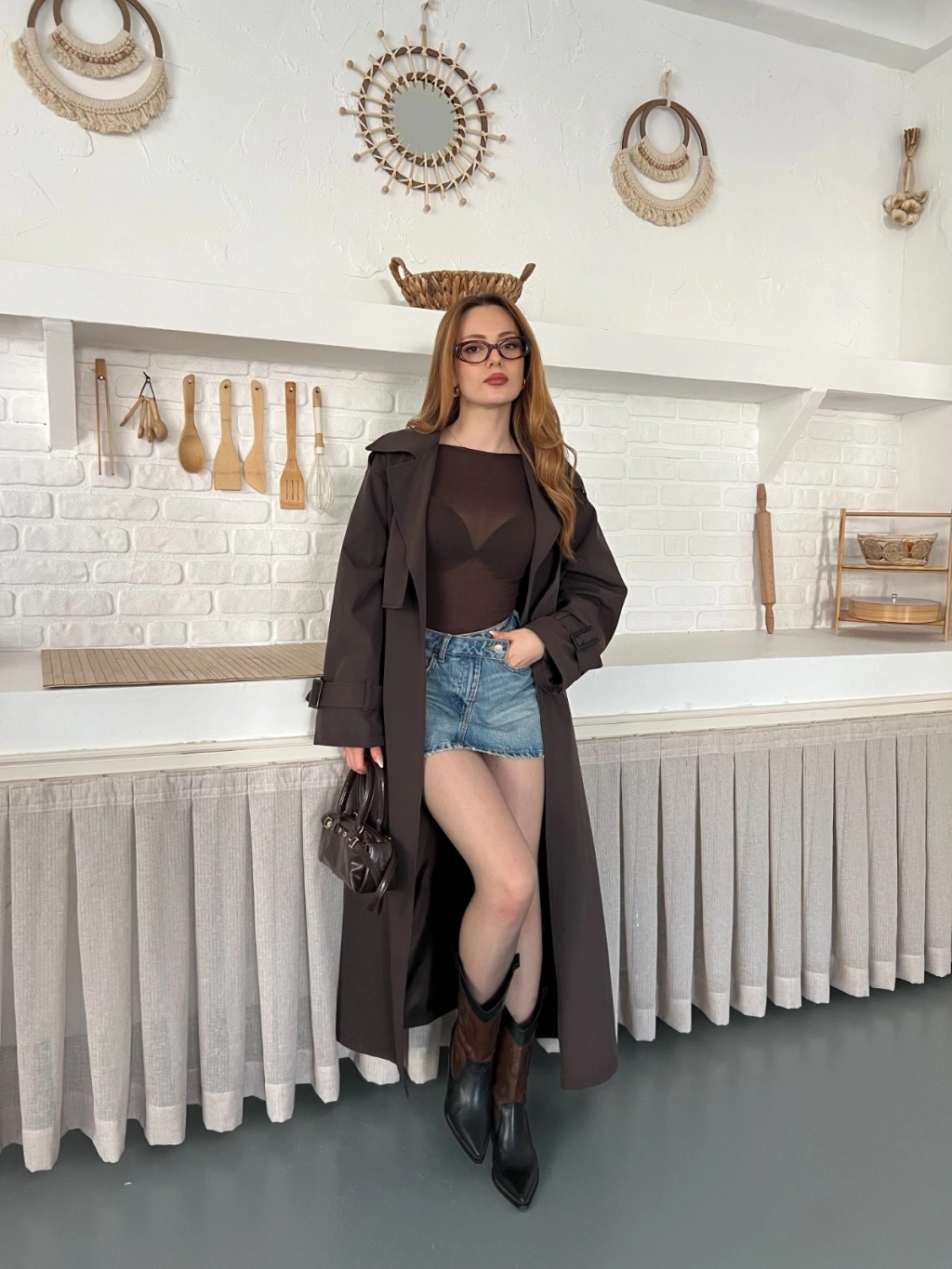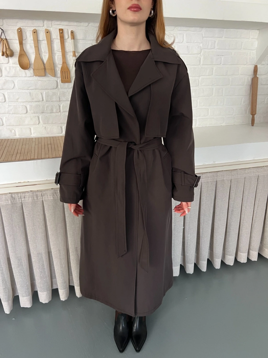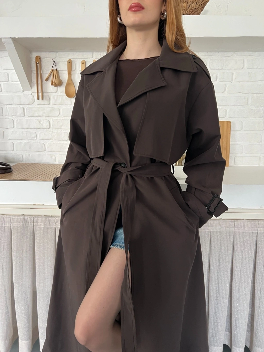 Kemer ve Manşet Detaylı Uzun Trençkot Kahve
