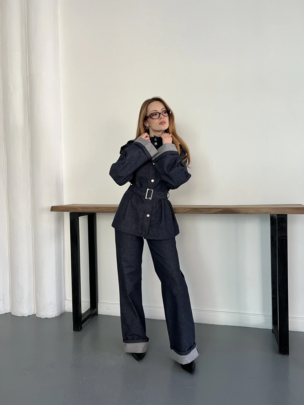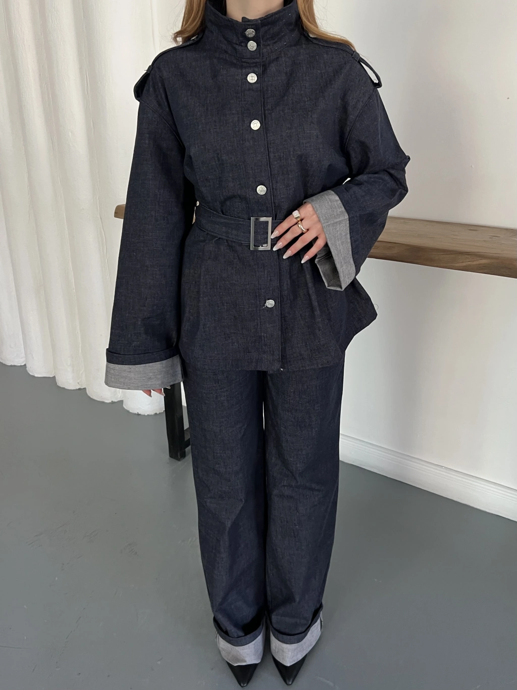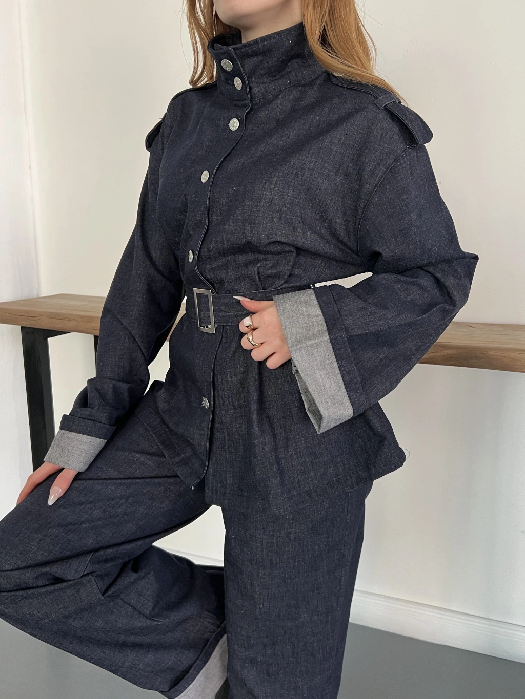 Kemerli Düğme Detaylı Yüksek Yaka Denim Takım Lacivert