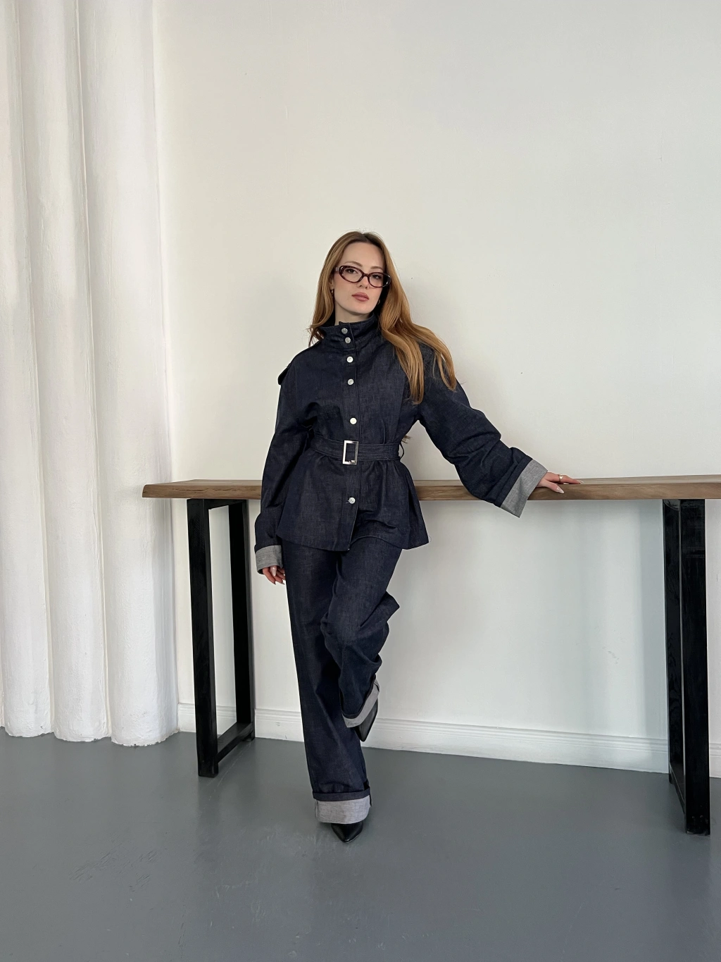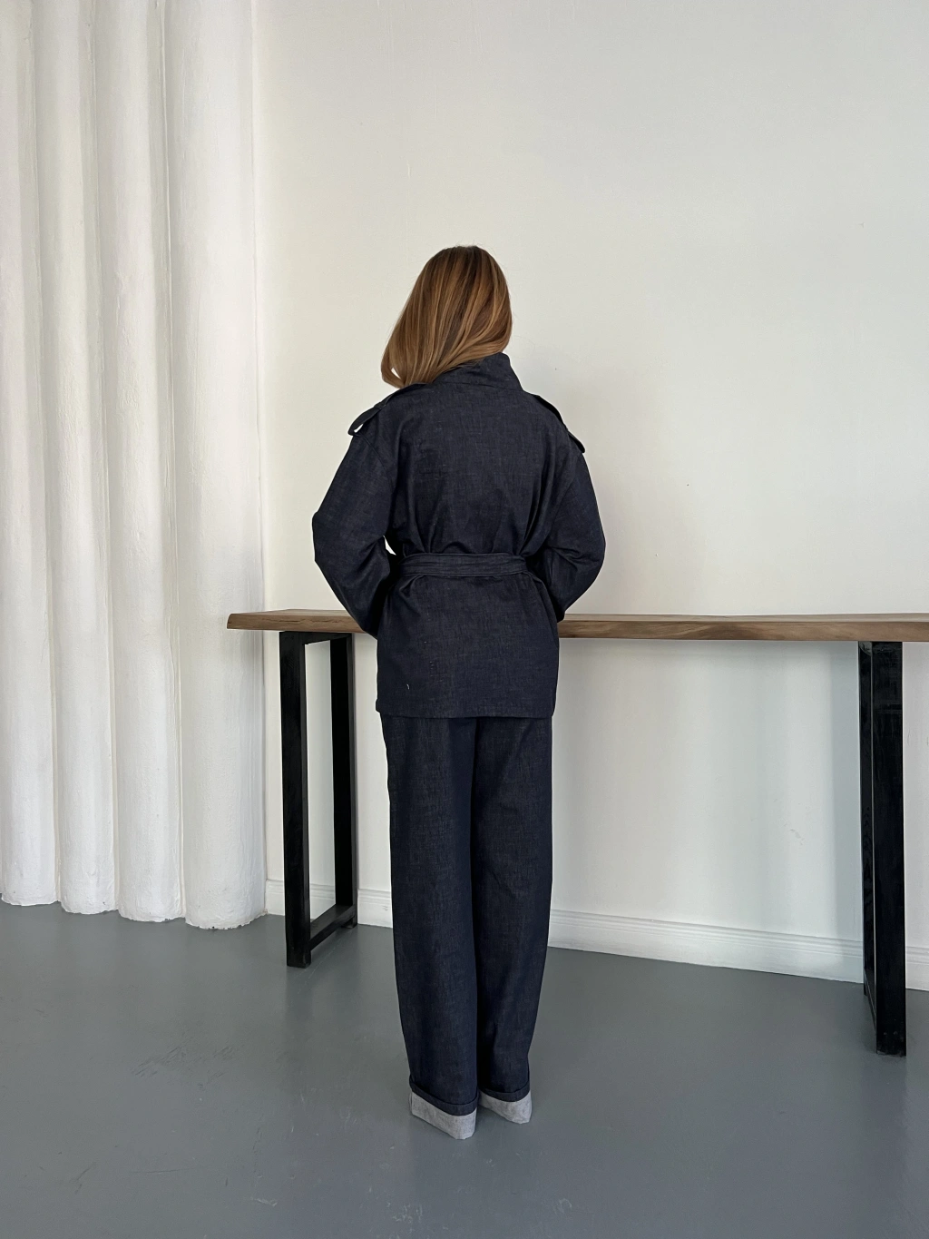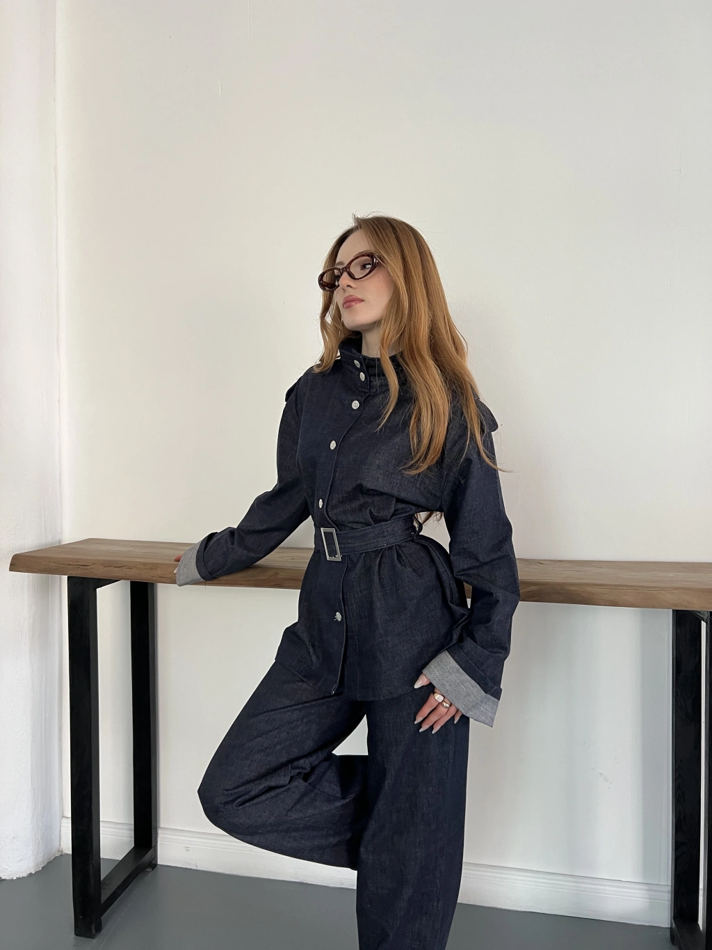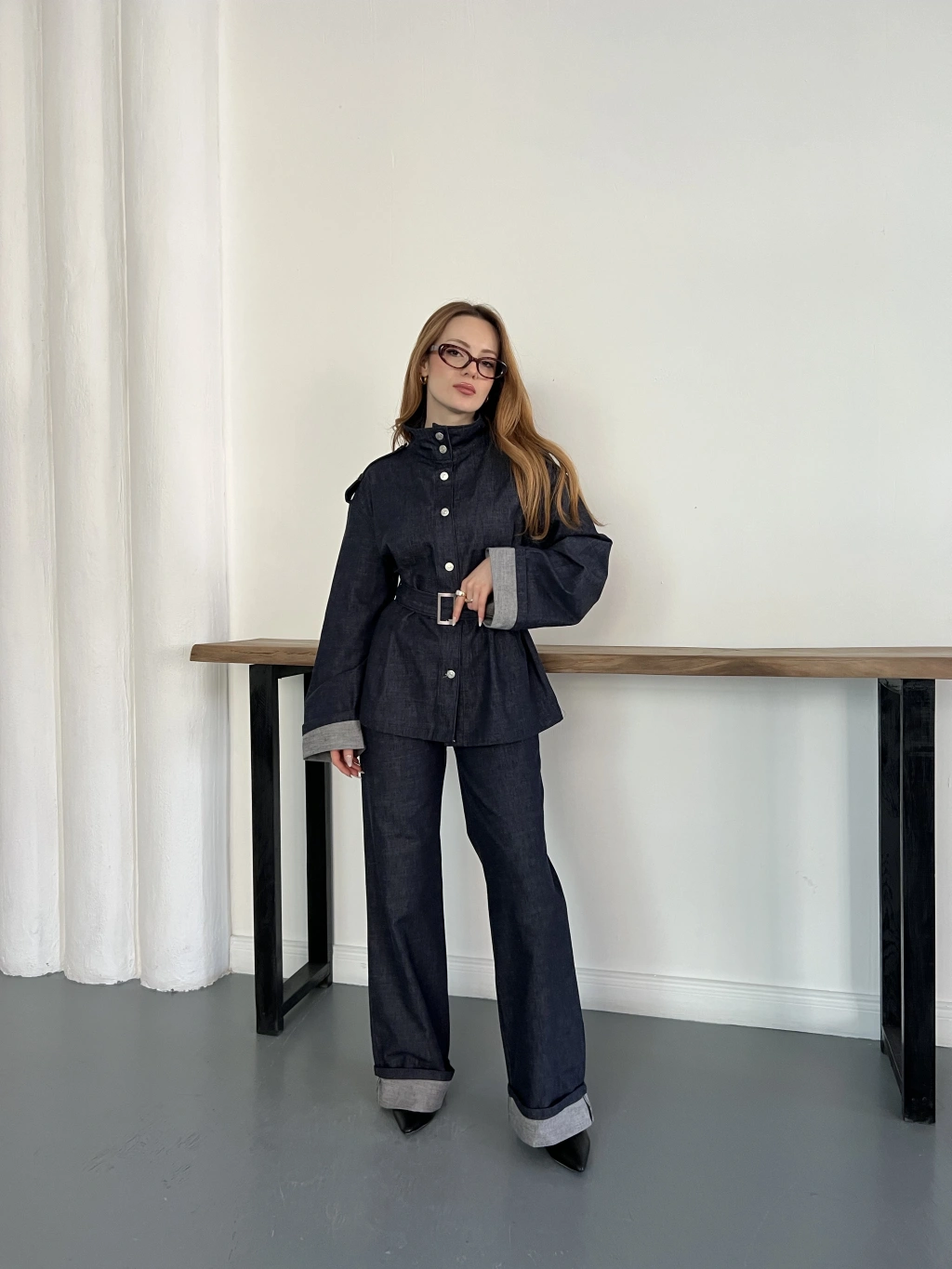 Kemerli Düğme Detaylı Yüksek Yaka Denim Takım Lacivert