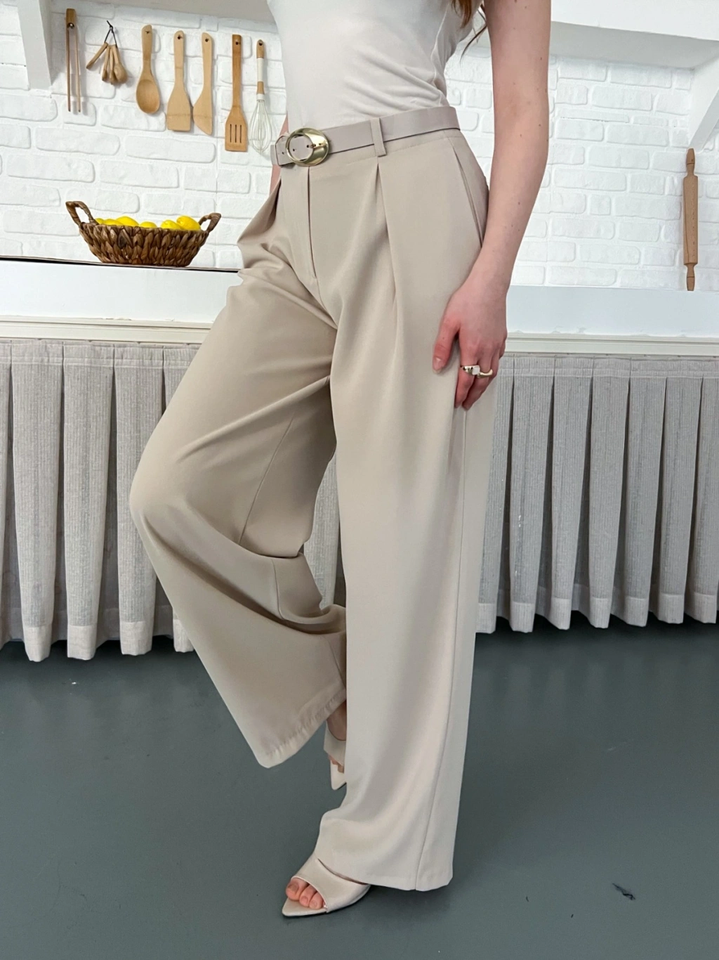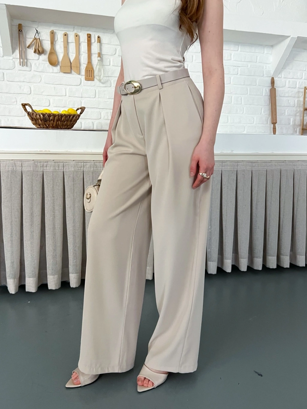 Kemerli Yüksek Bel Bol Paça Pantolon Bej