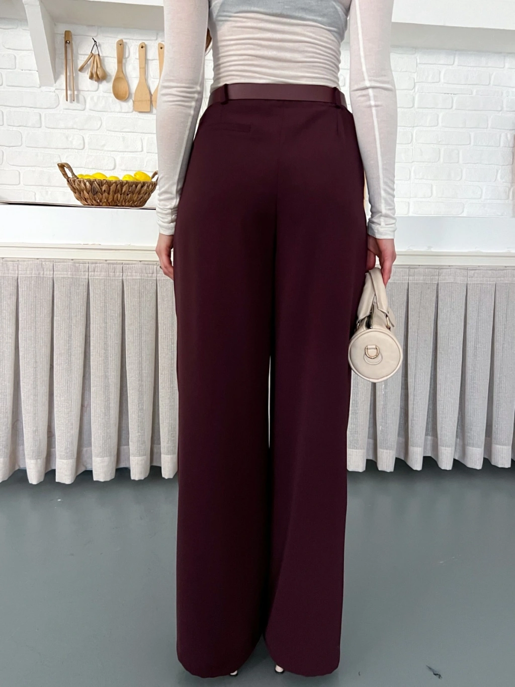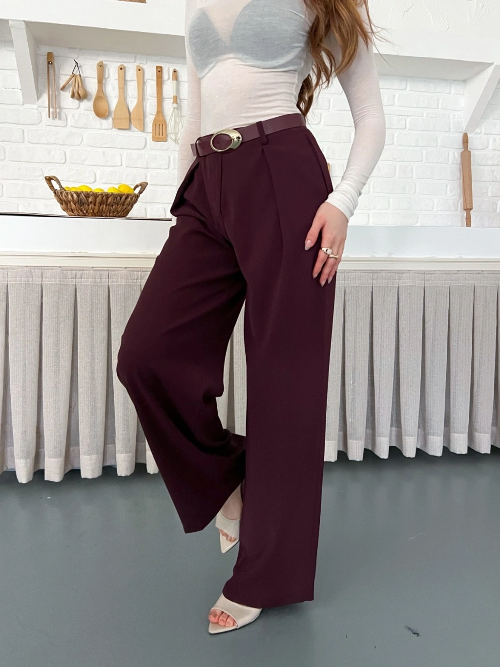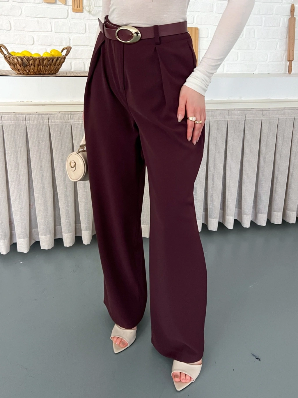 Kemerli Yüksek Bel Bol Paça Pantolon Mürdüm