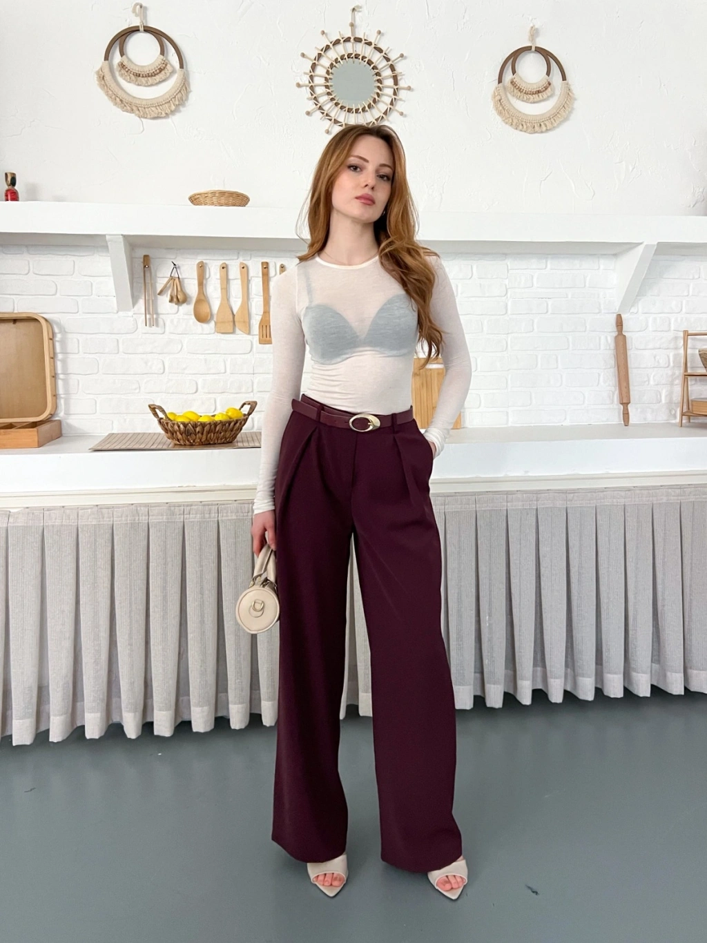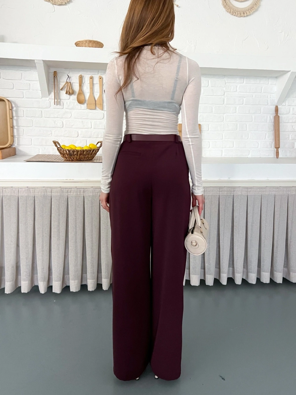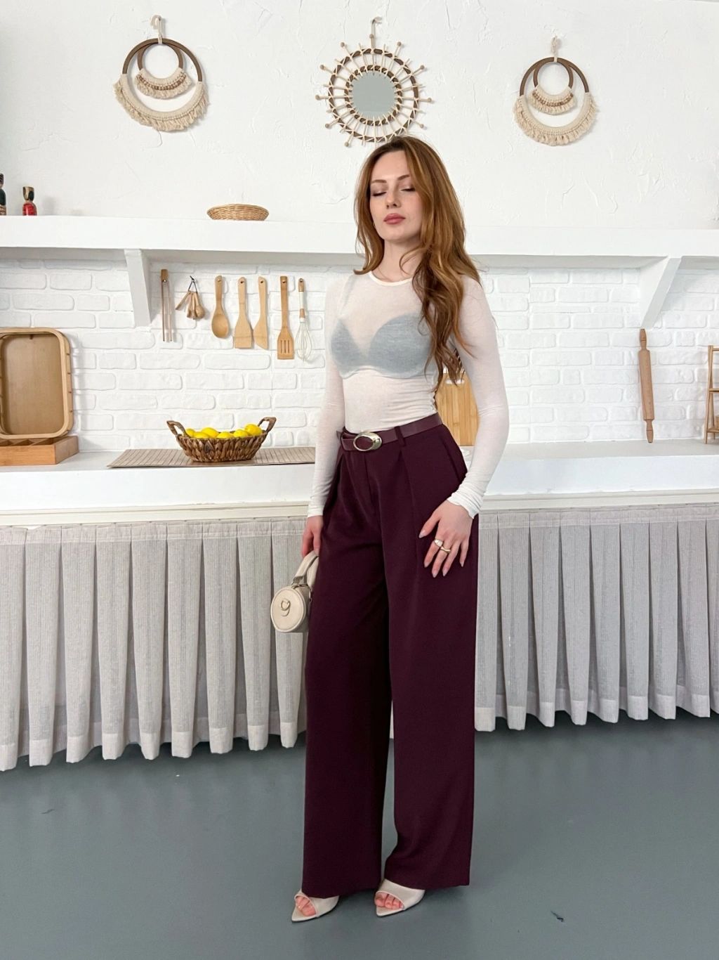Kemerli Yüksek Bel Bol Paça Pantolon Mürdüm