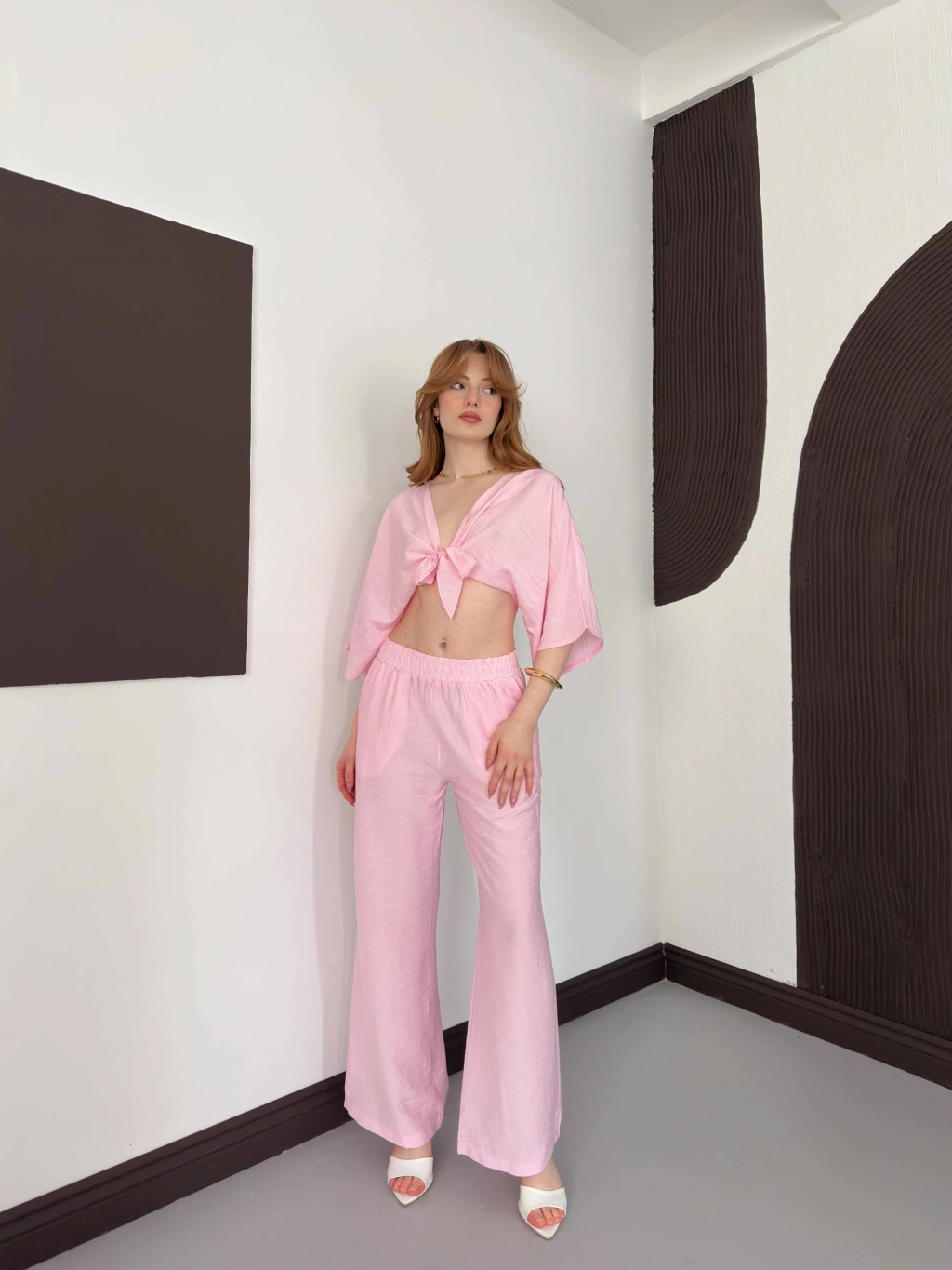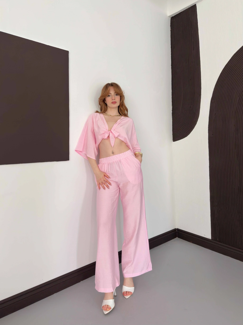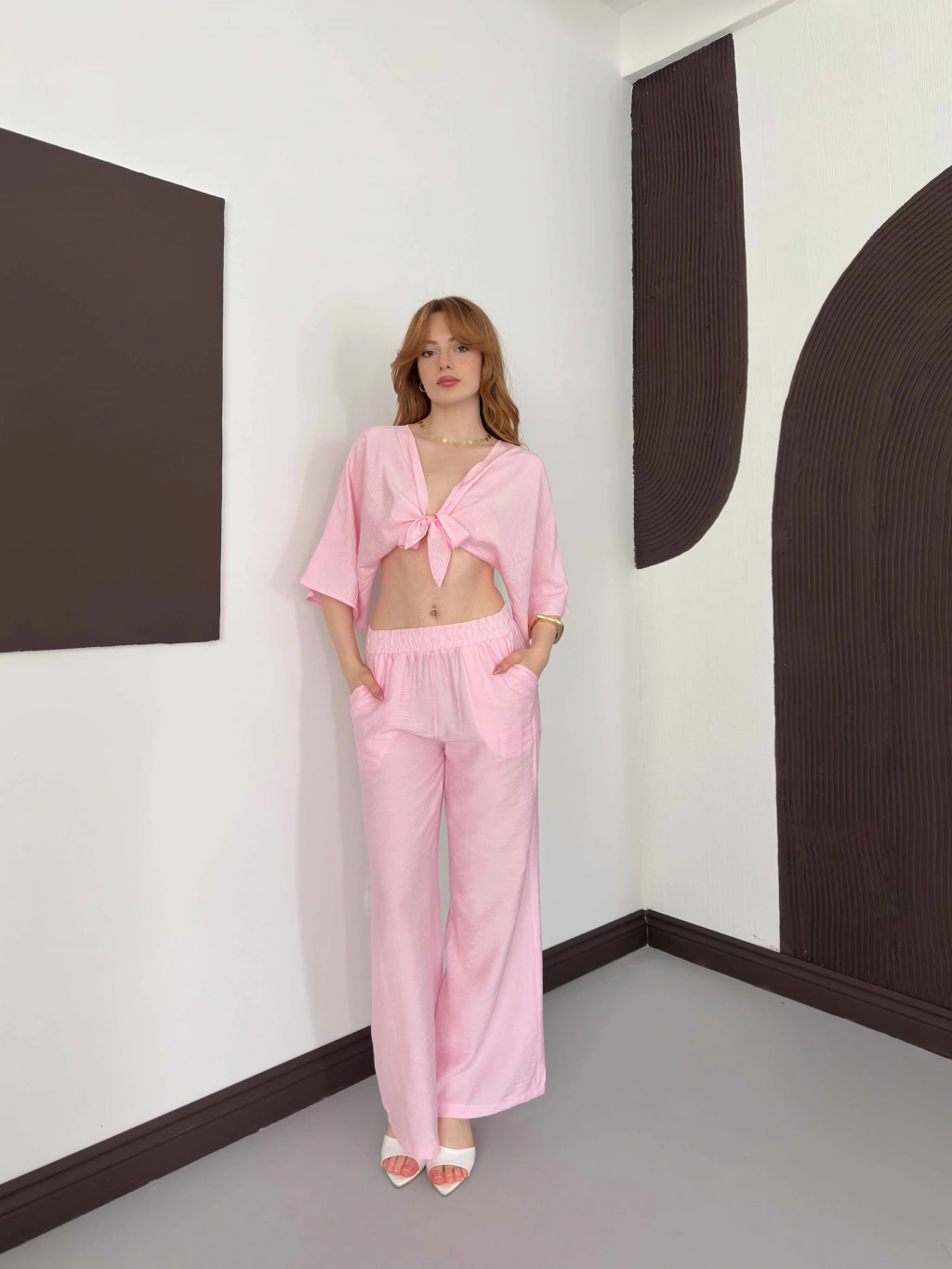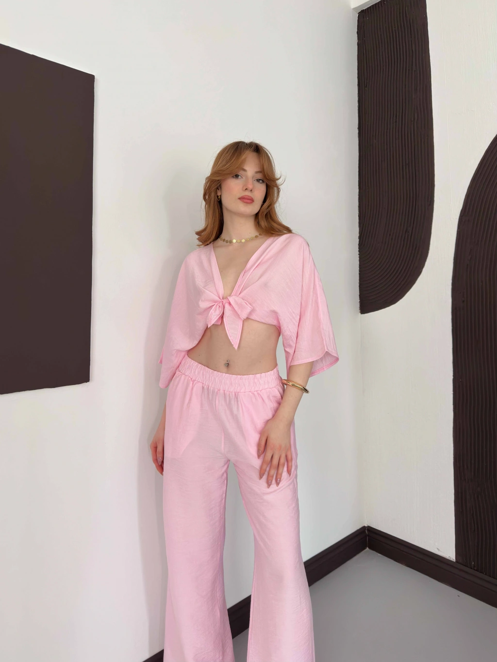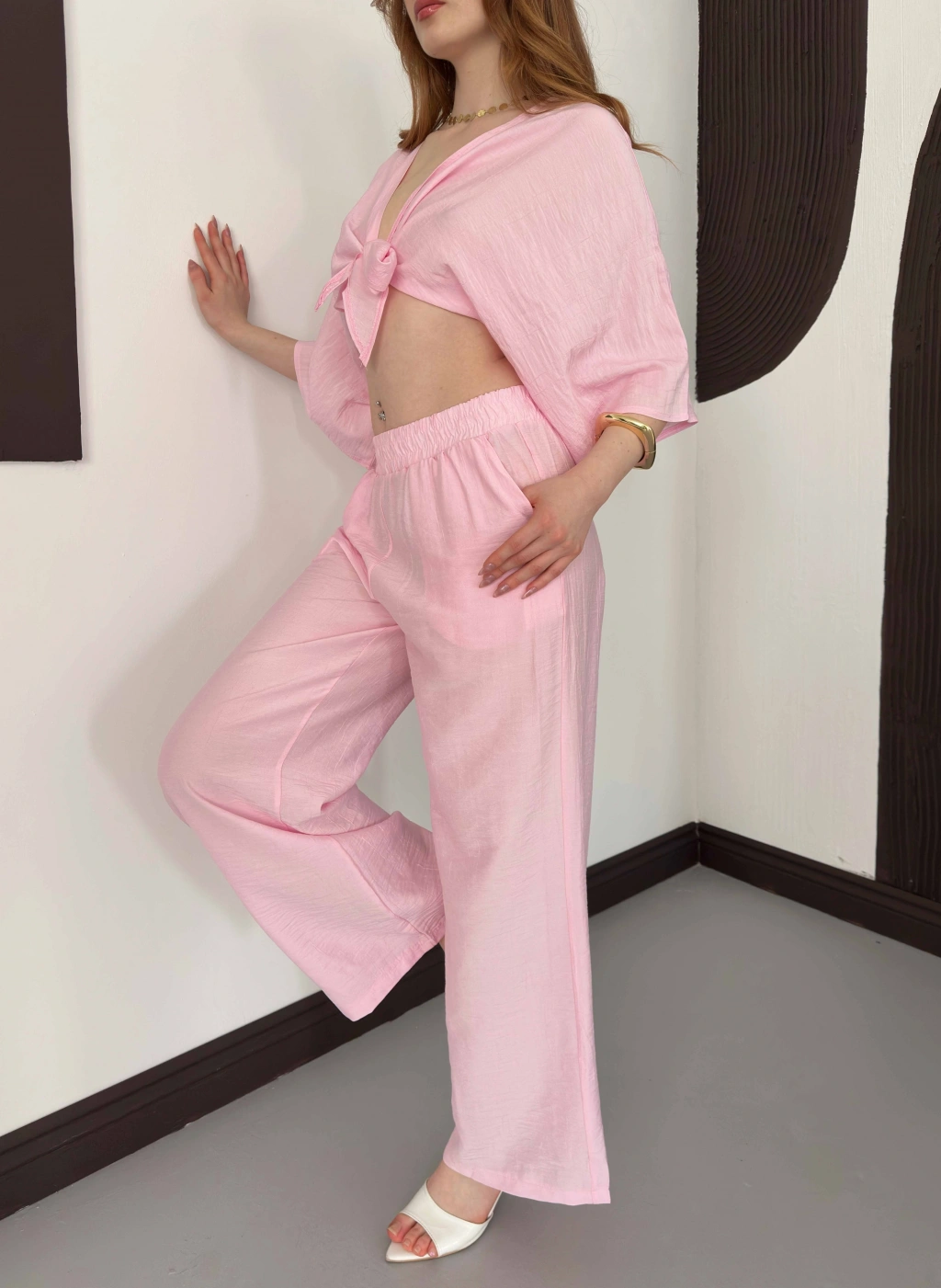 Keten Önden Bağlama Detaylı İkili Takım Pembe