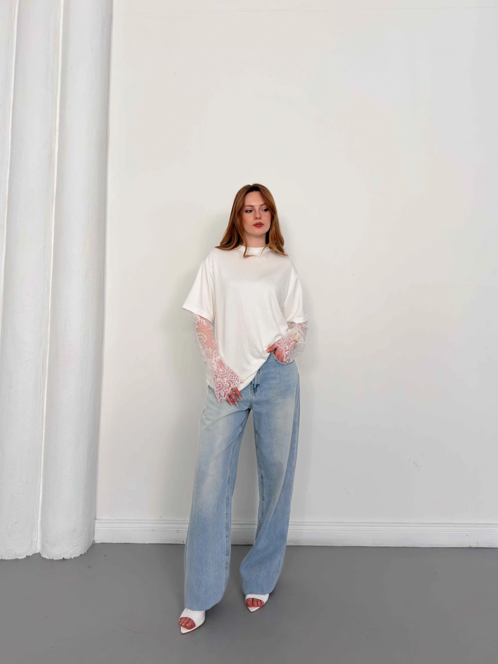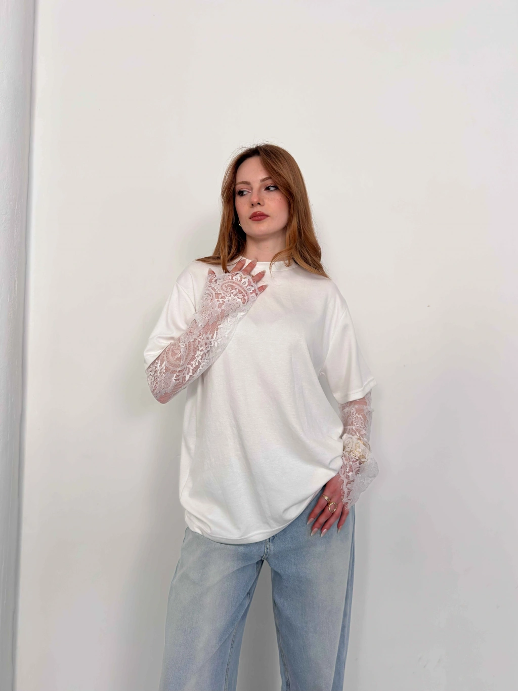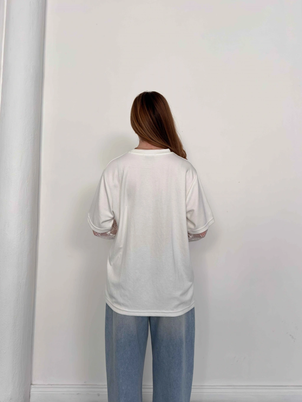 Kol Dantel Detaylı Oversize Tişört Beyaz