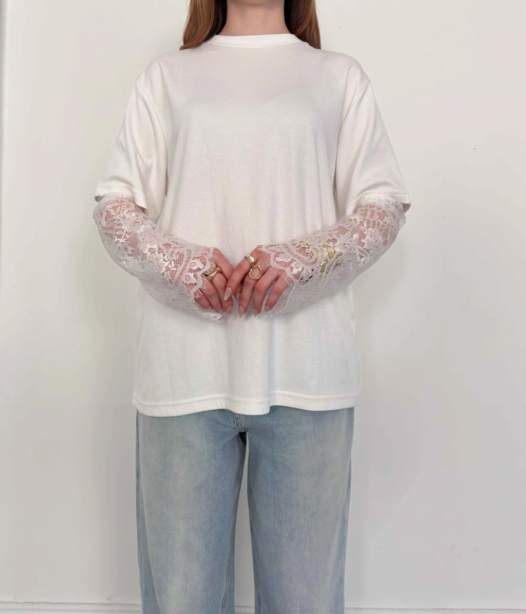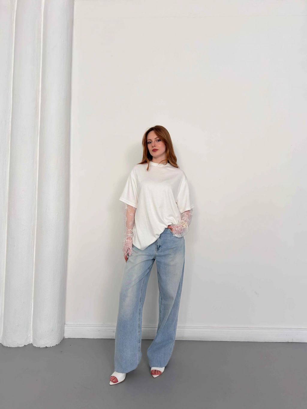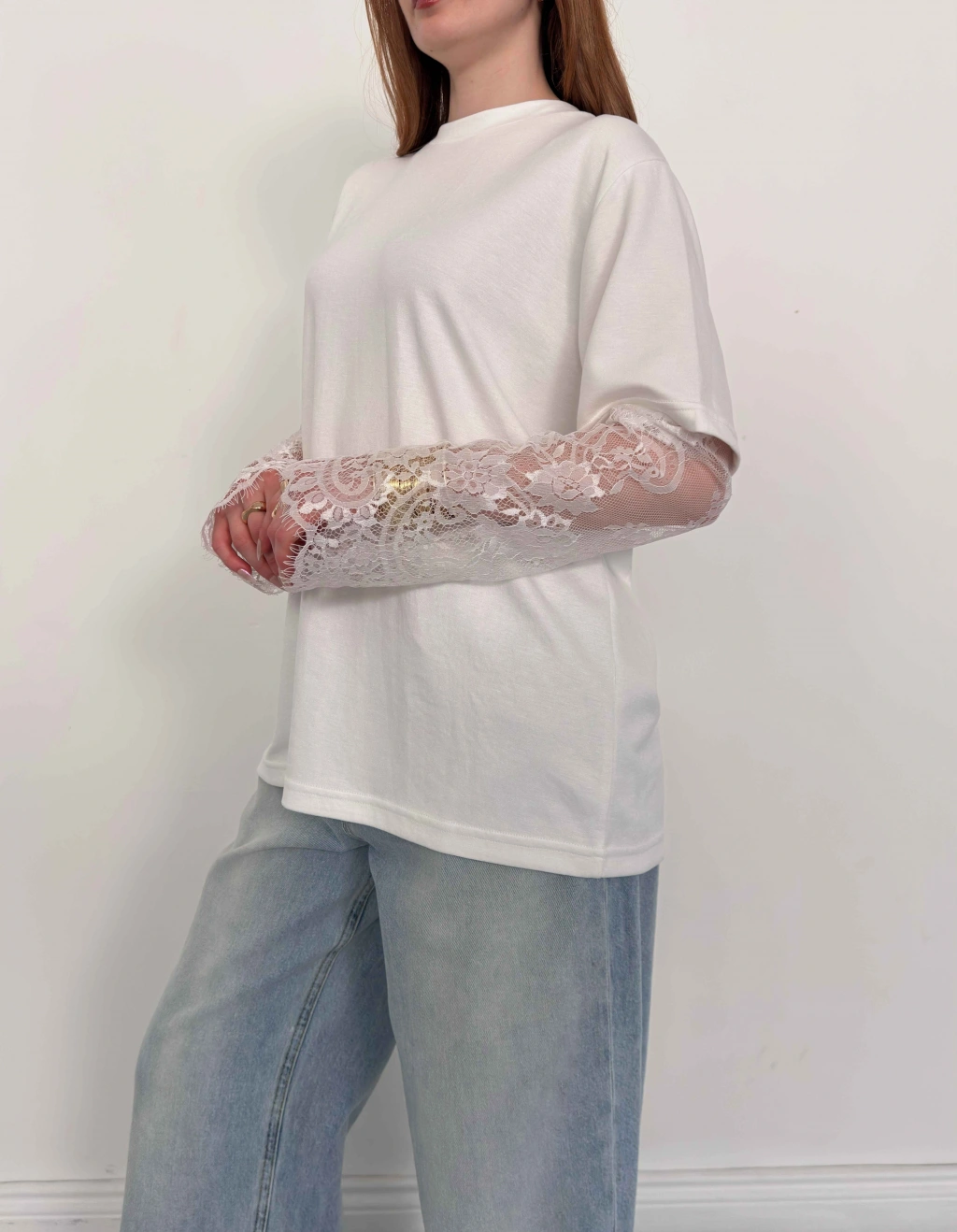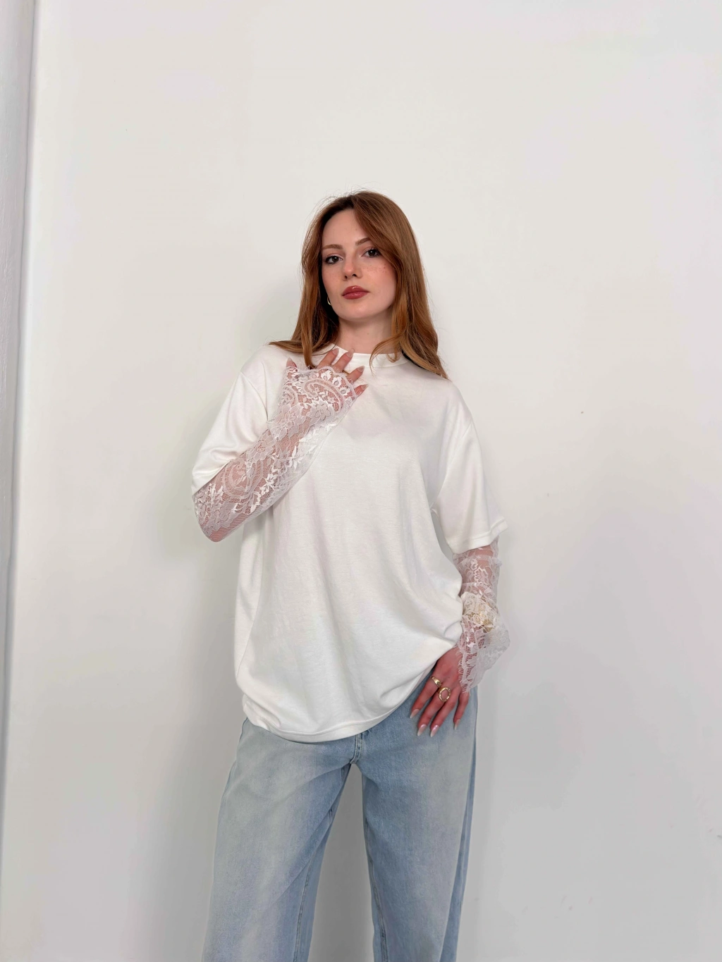 Kol Dantel Detaylı Oversize Tişört Beyaz