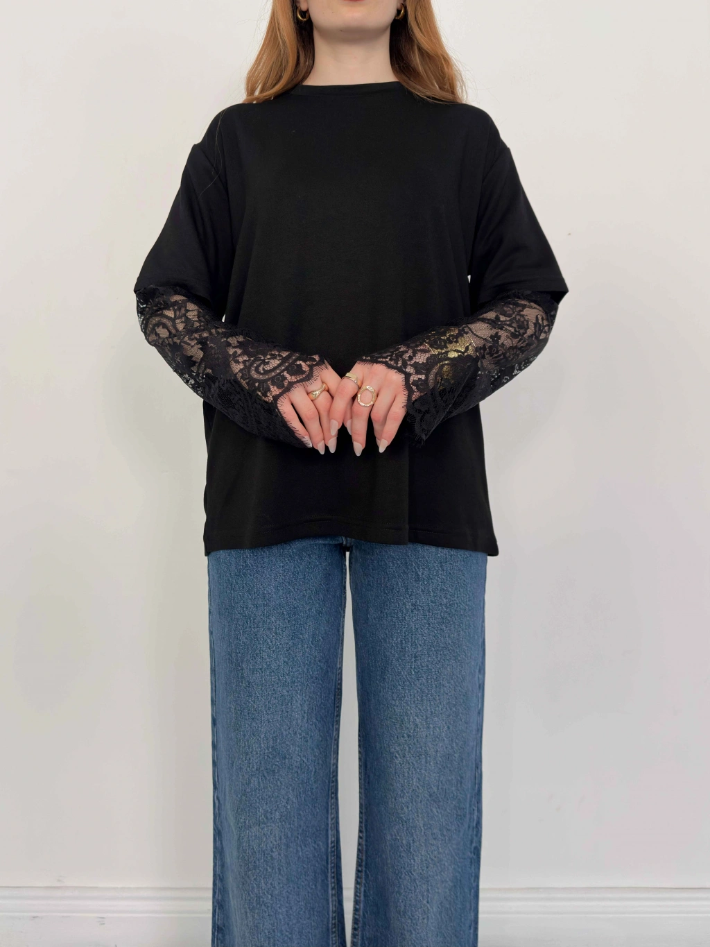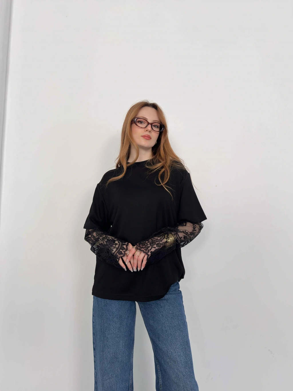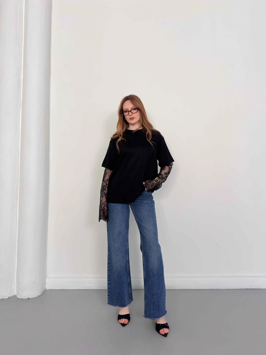 Kol Dantel Detaylı Oversize Tişört Siyah