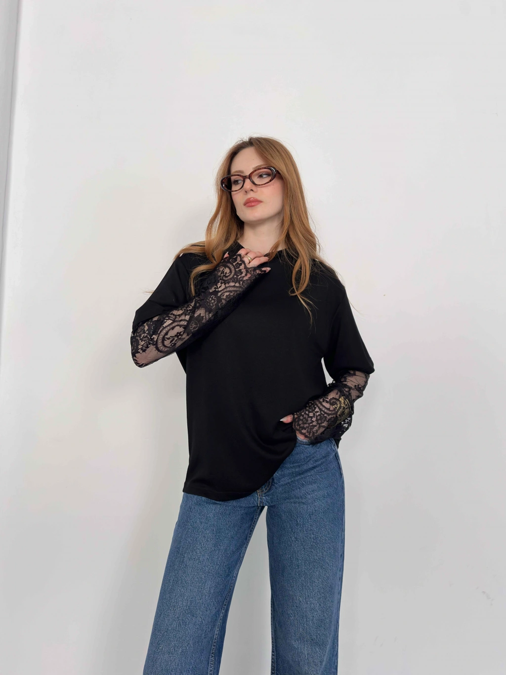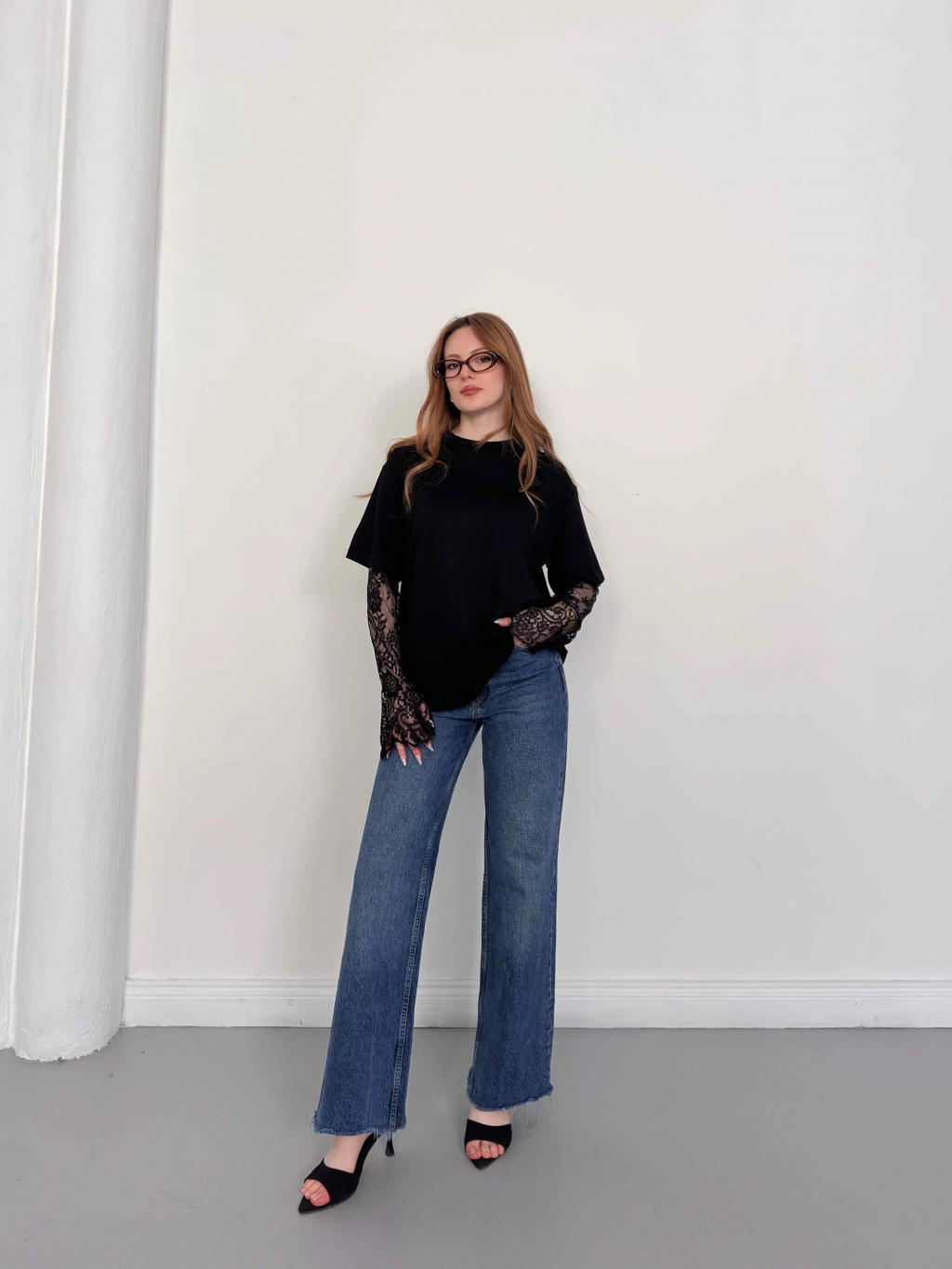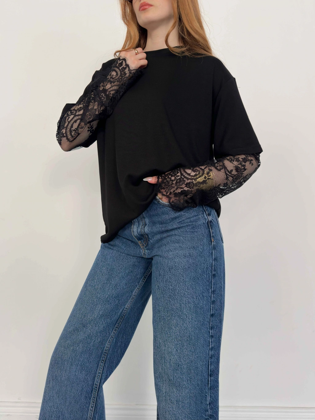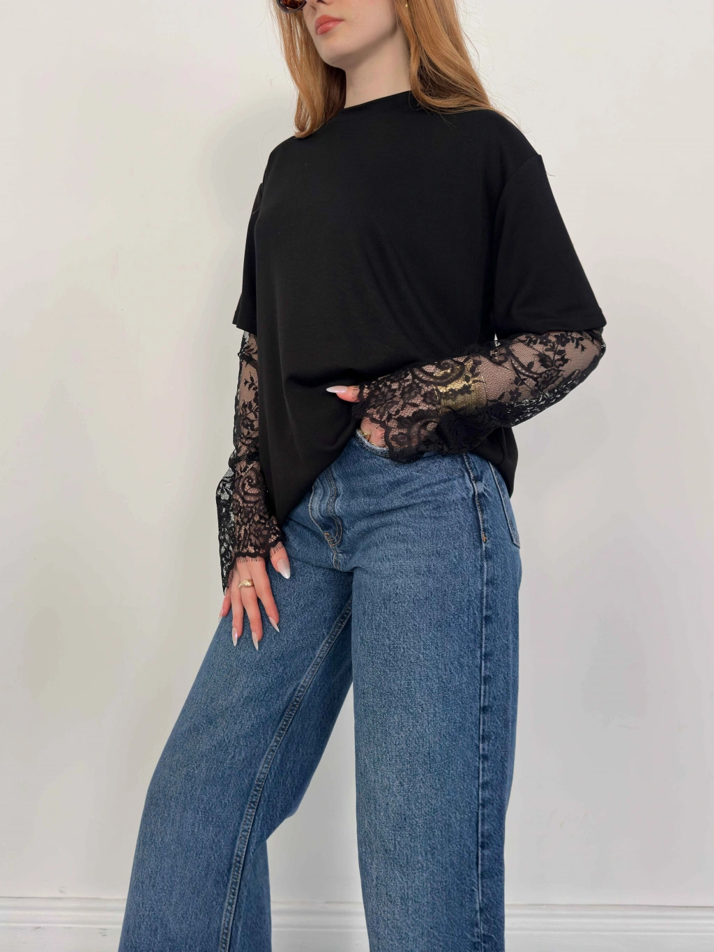 Kol Dantel Detaylı Oversize Tişört Siyah