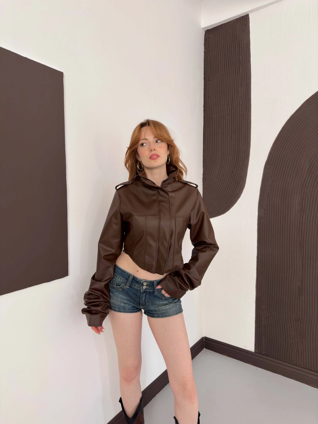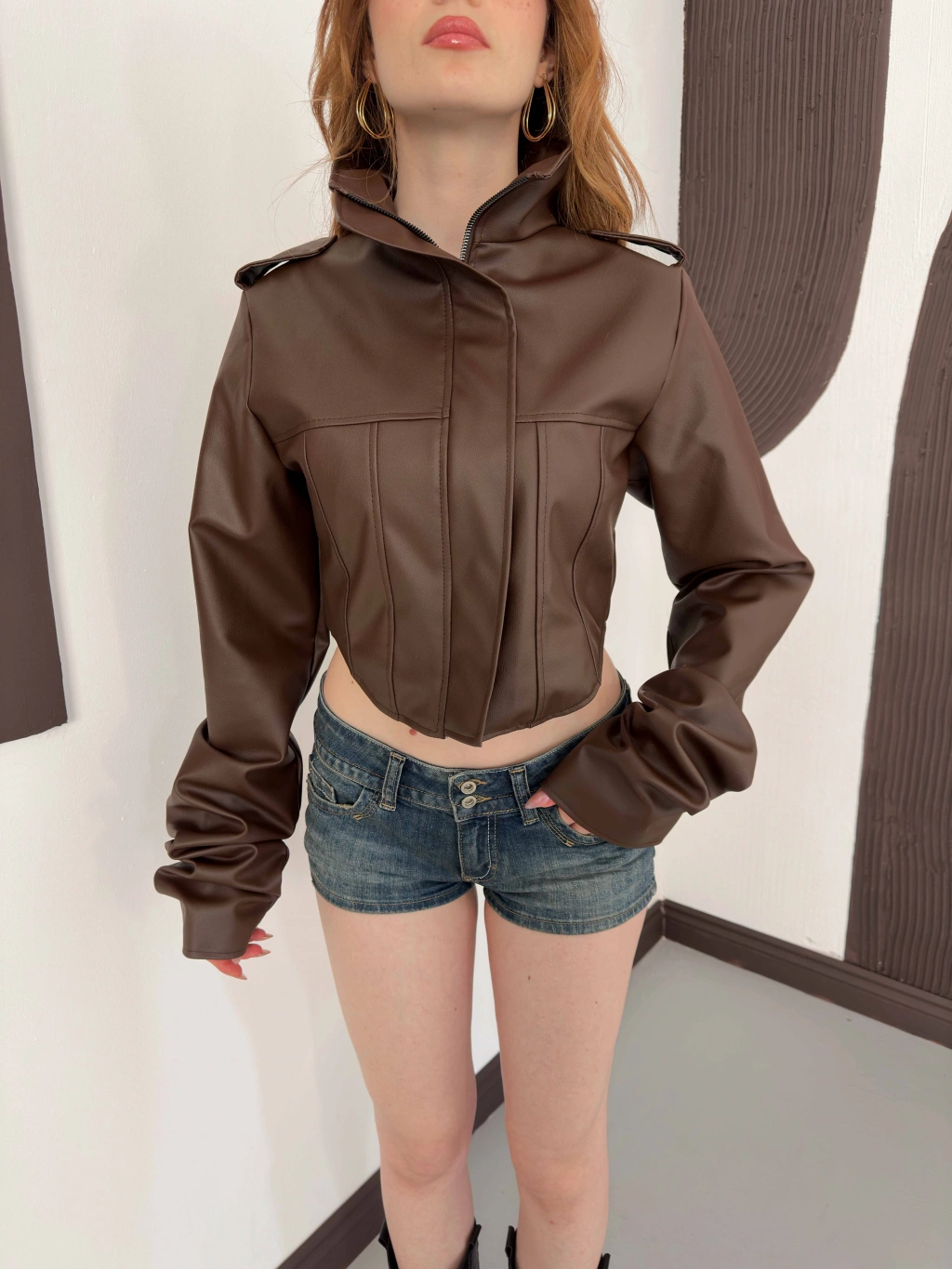 Korse Detaylı Premium Tasarım Deri Ceket Kahve