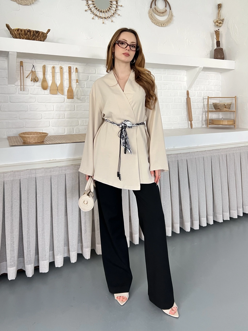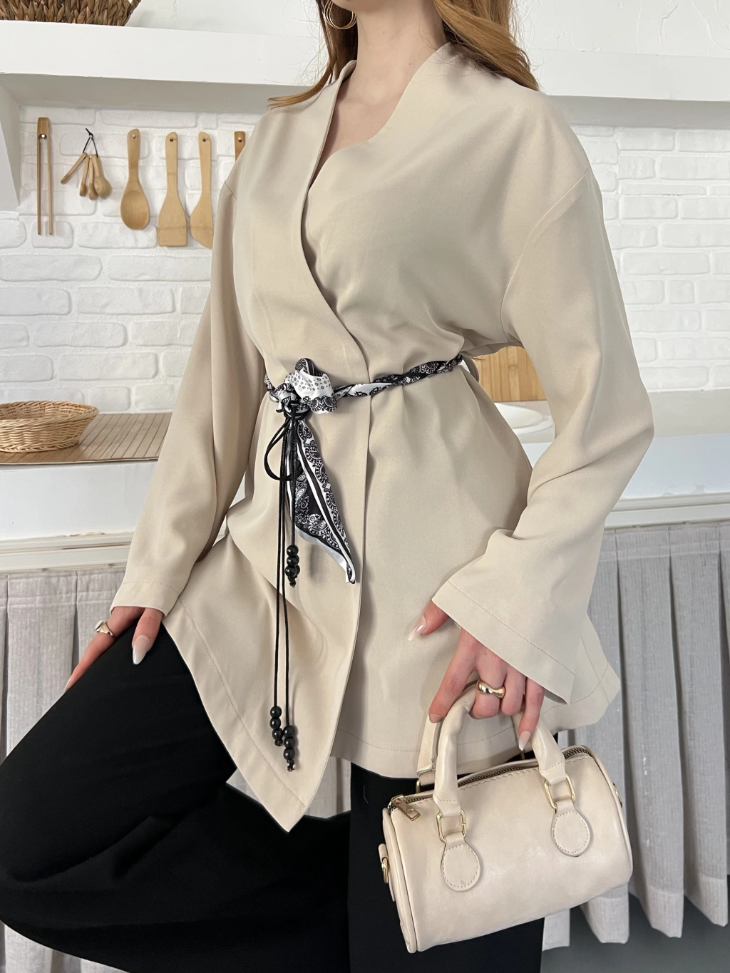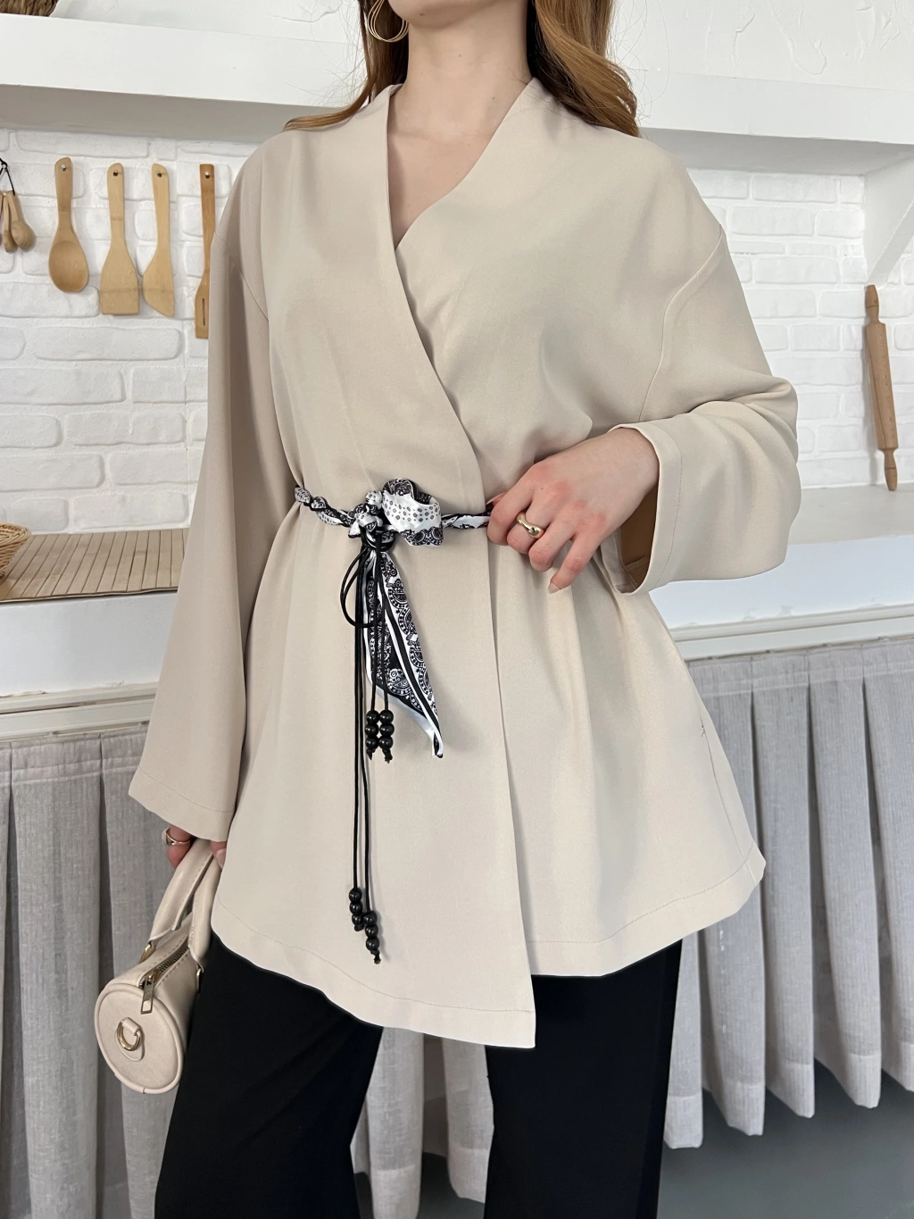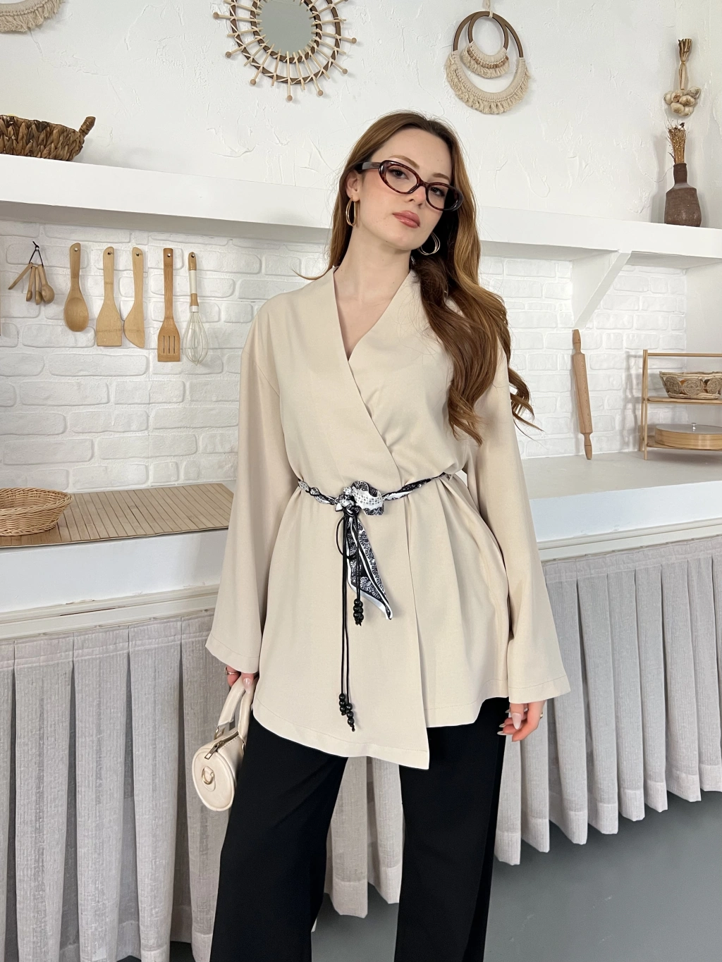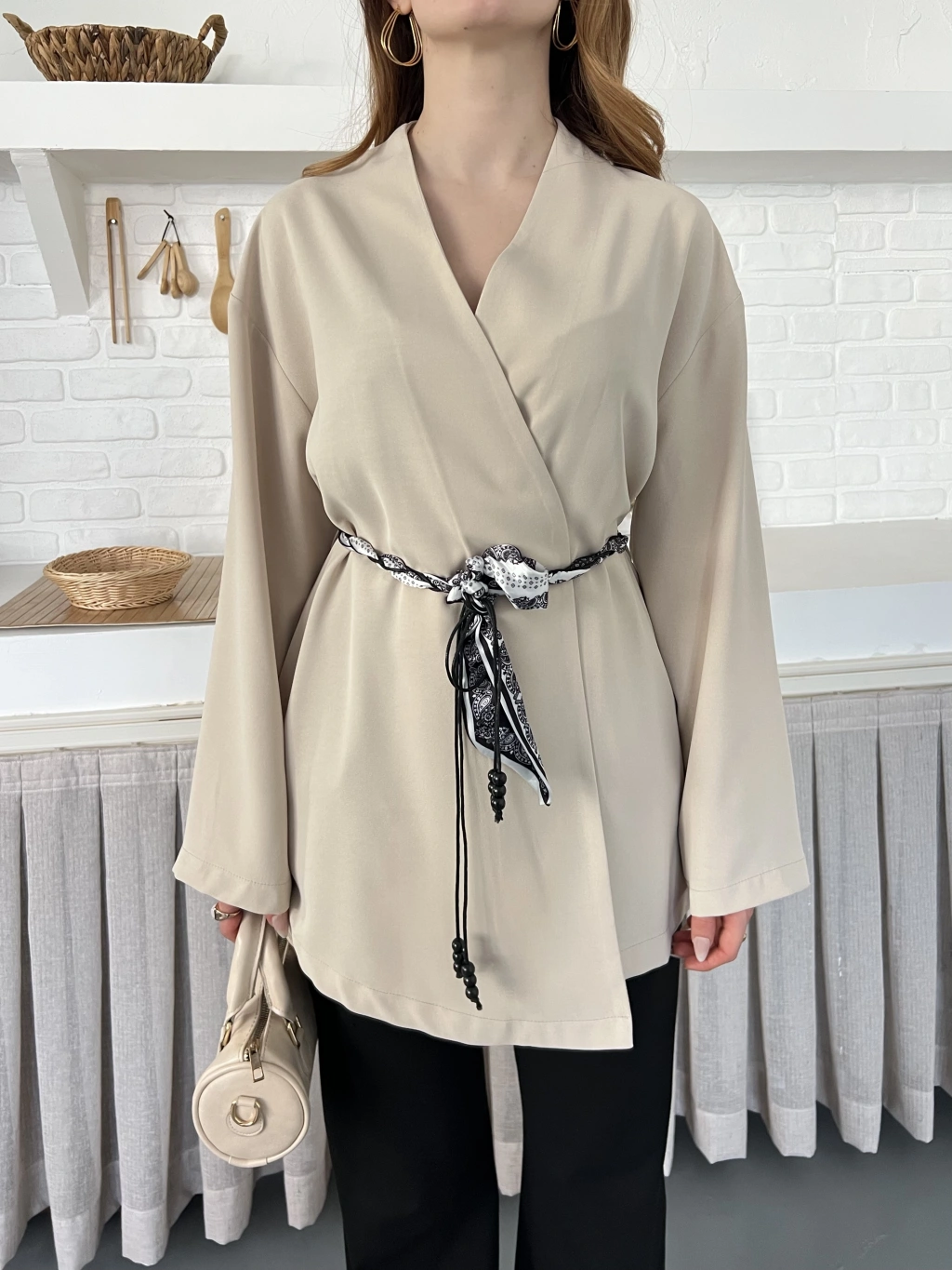 Kruvaze Yaka Bel Kuşaklı Tasarım Bluz Bej