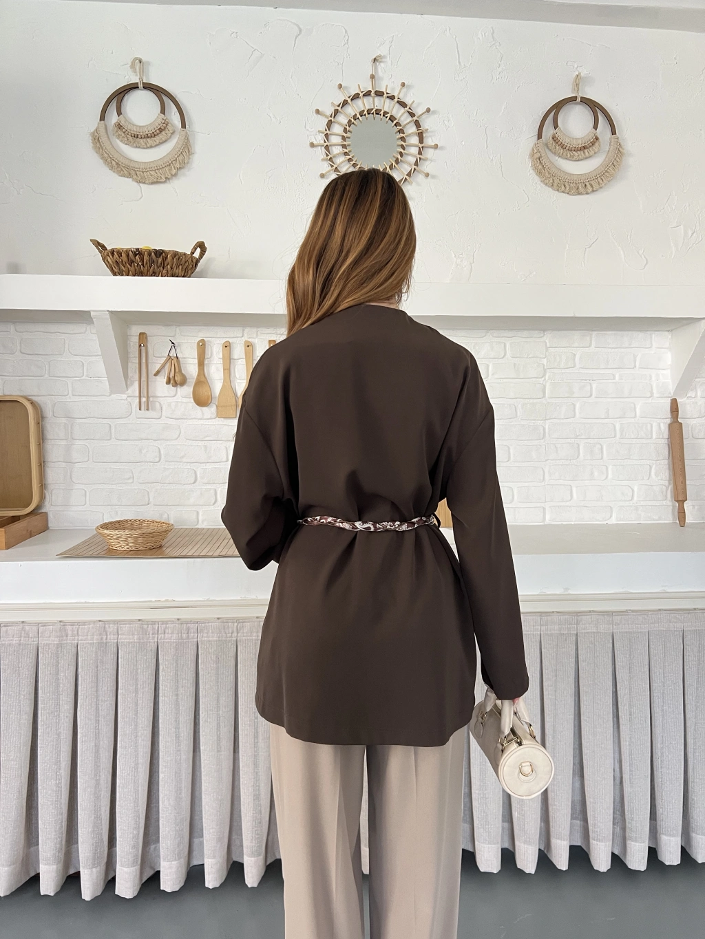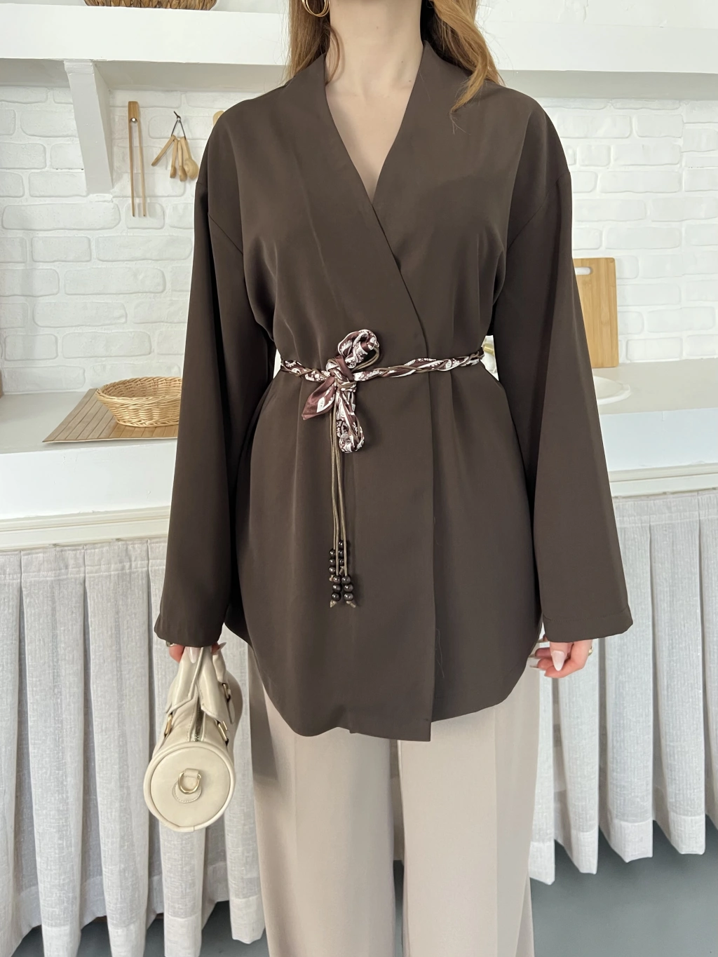 Kruvaze Yaka Bel Kuşaklı Tasarım Bluz Kahve