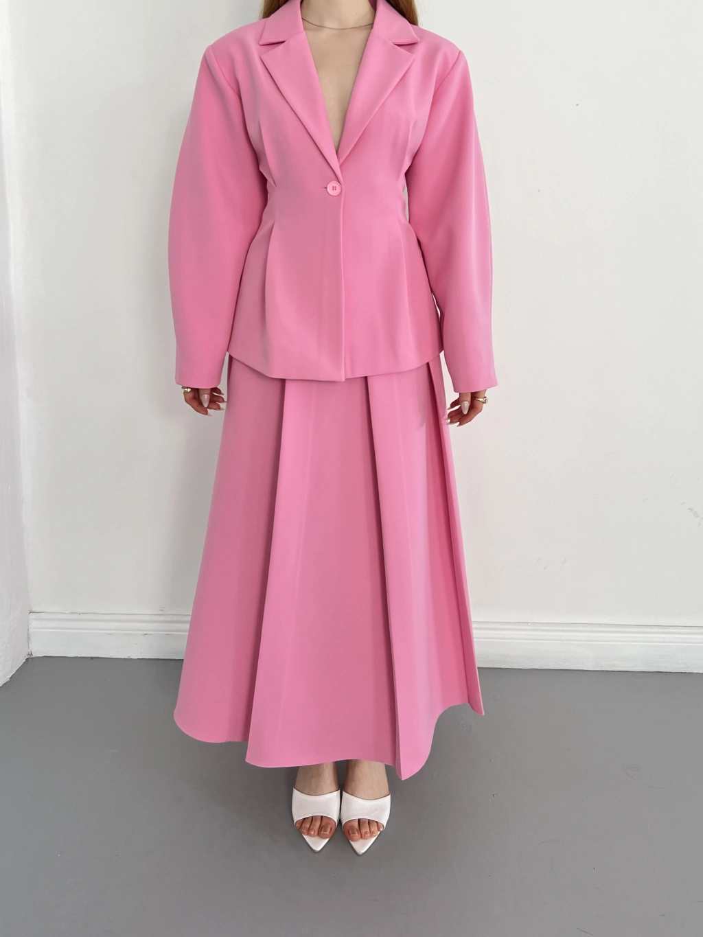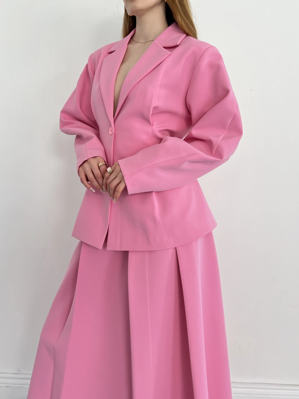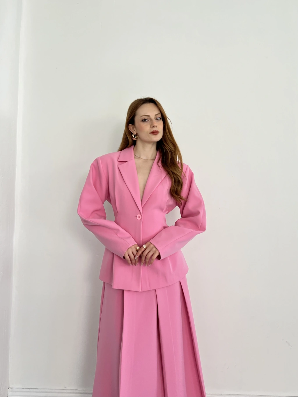 Kruvaze Yaka Ceket-Etek Takım Pembe