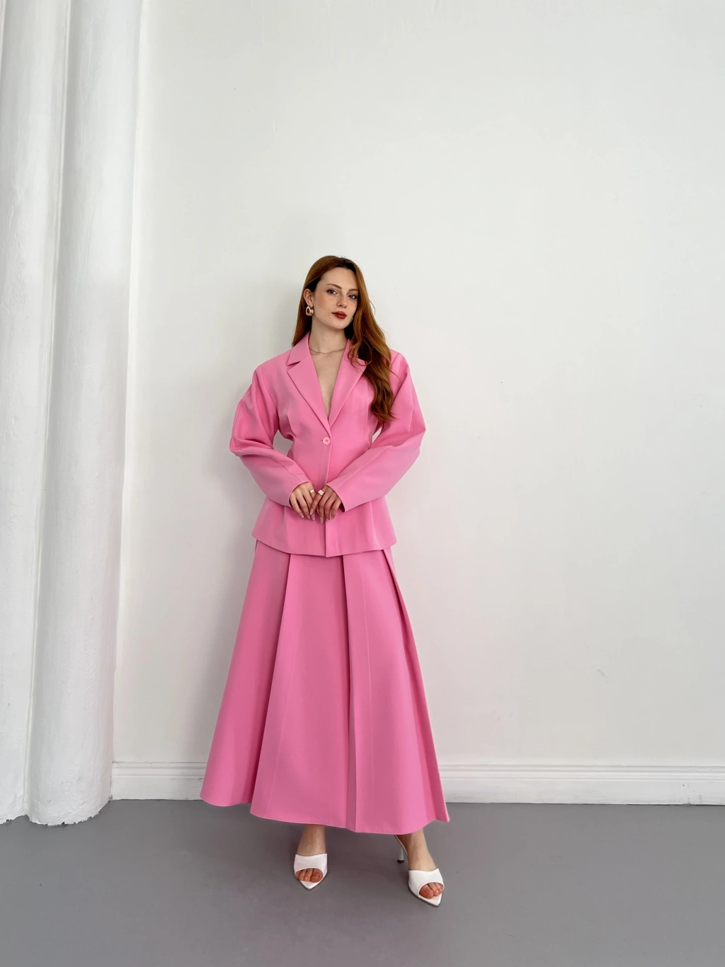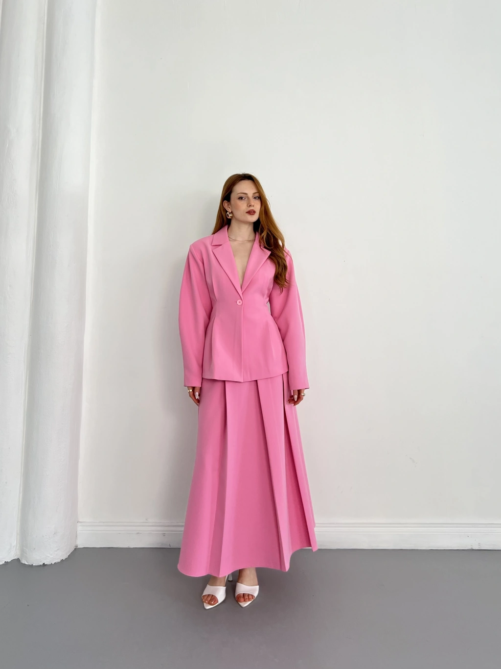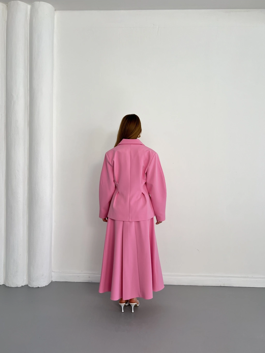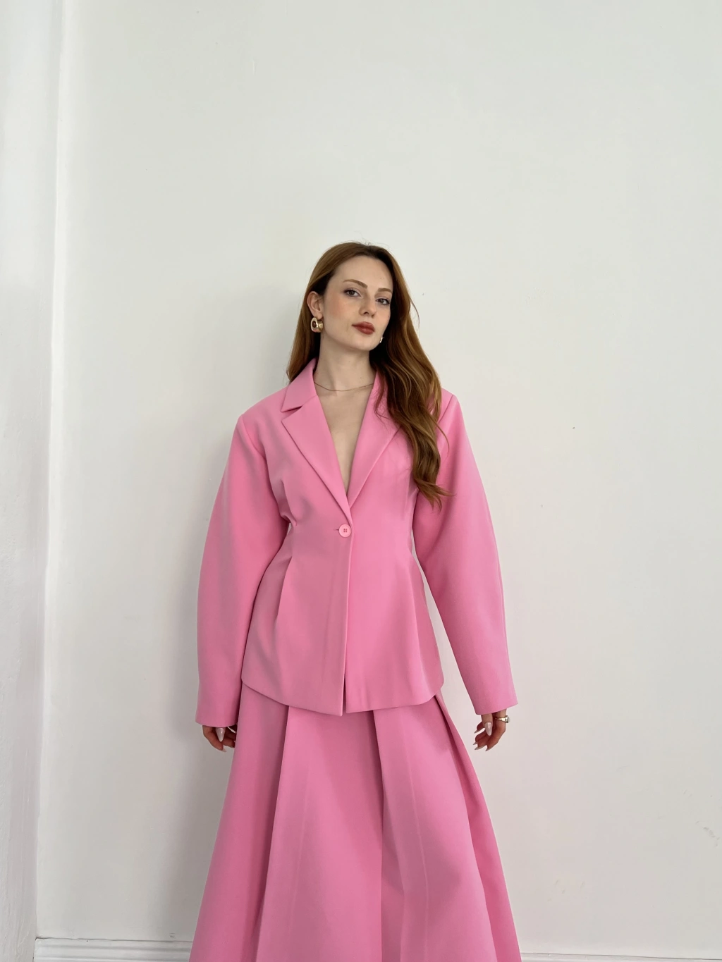 Kruvaze Yaka Ceket-Etek Takım Pembe