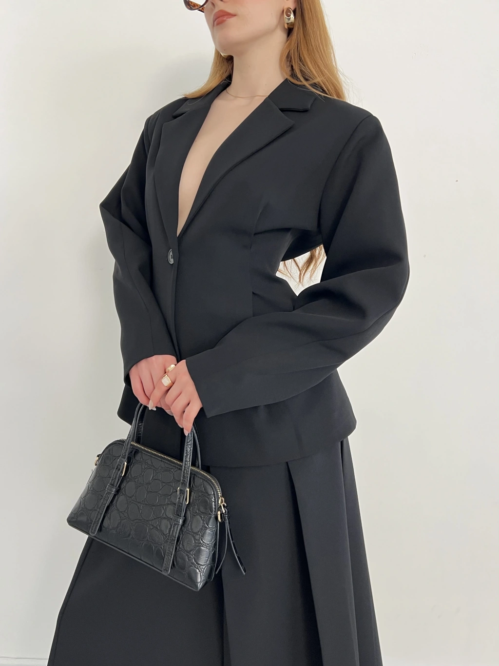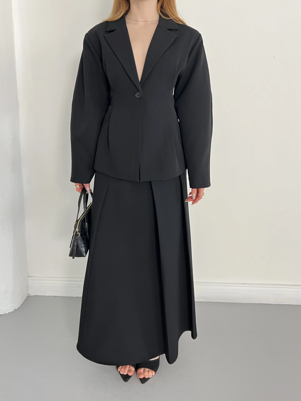 Kruvaze Yaka Ceket-Etek Takım Siyah
