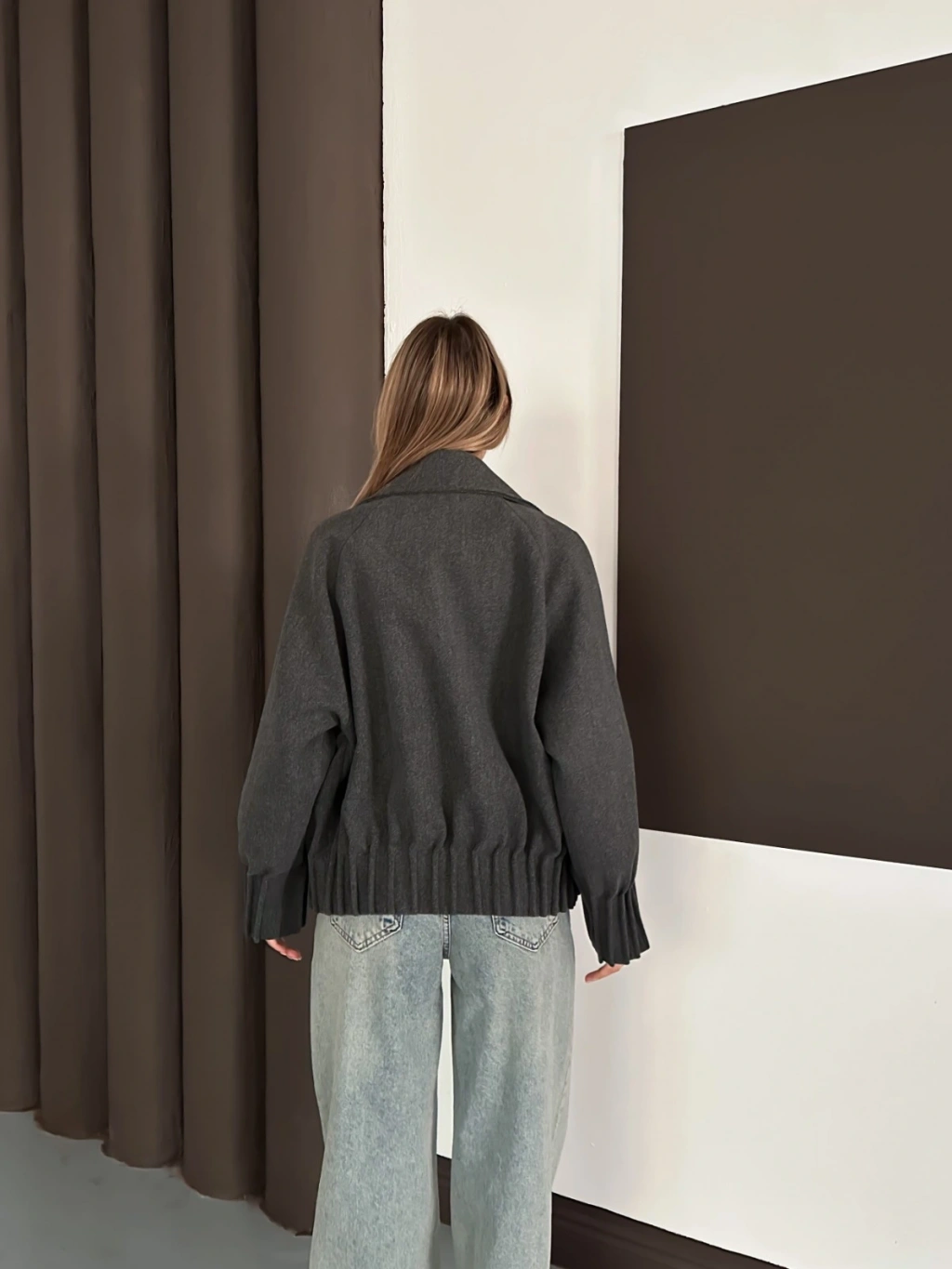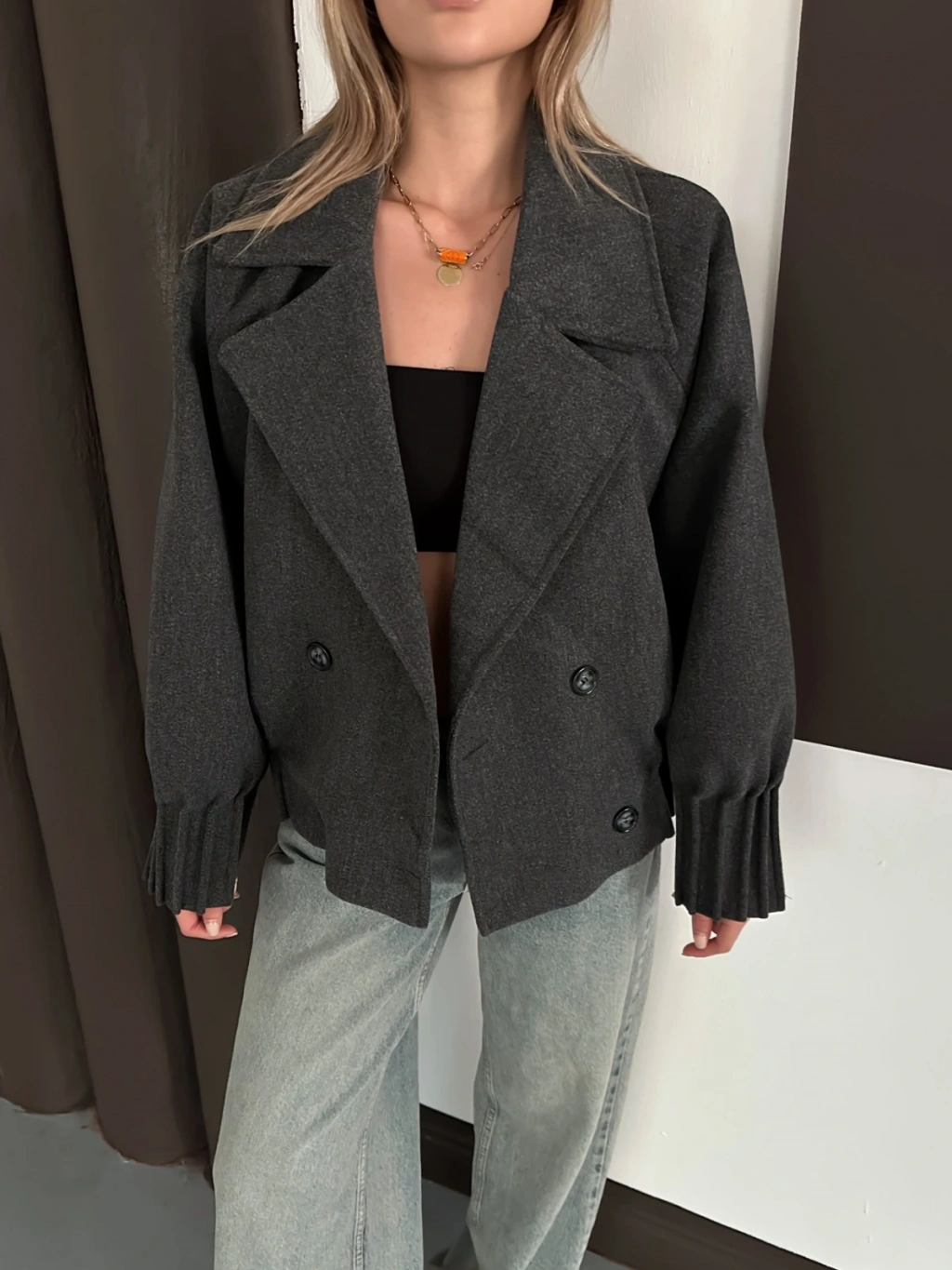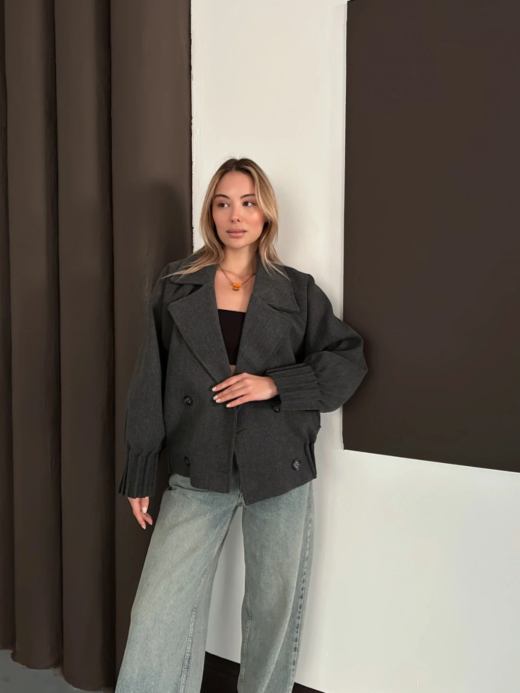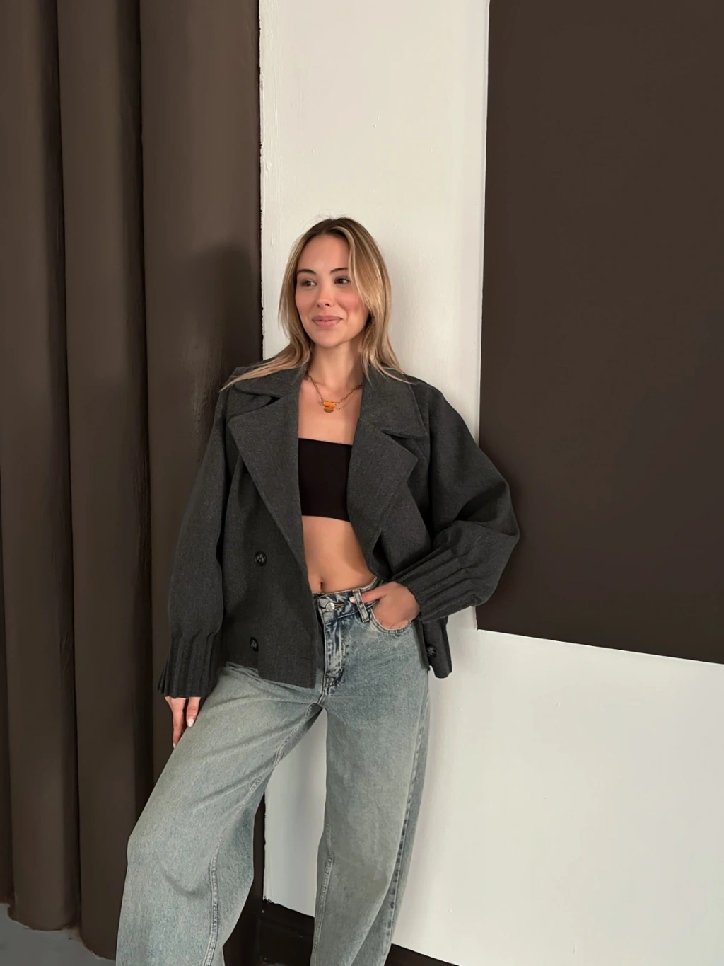 Kruvaze Yaka Kısa Büzgü Detaylı Kaşe Ceket Antrasit