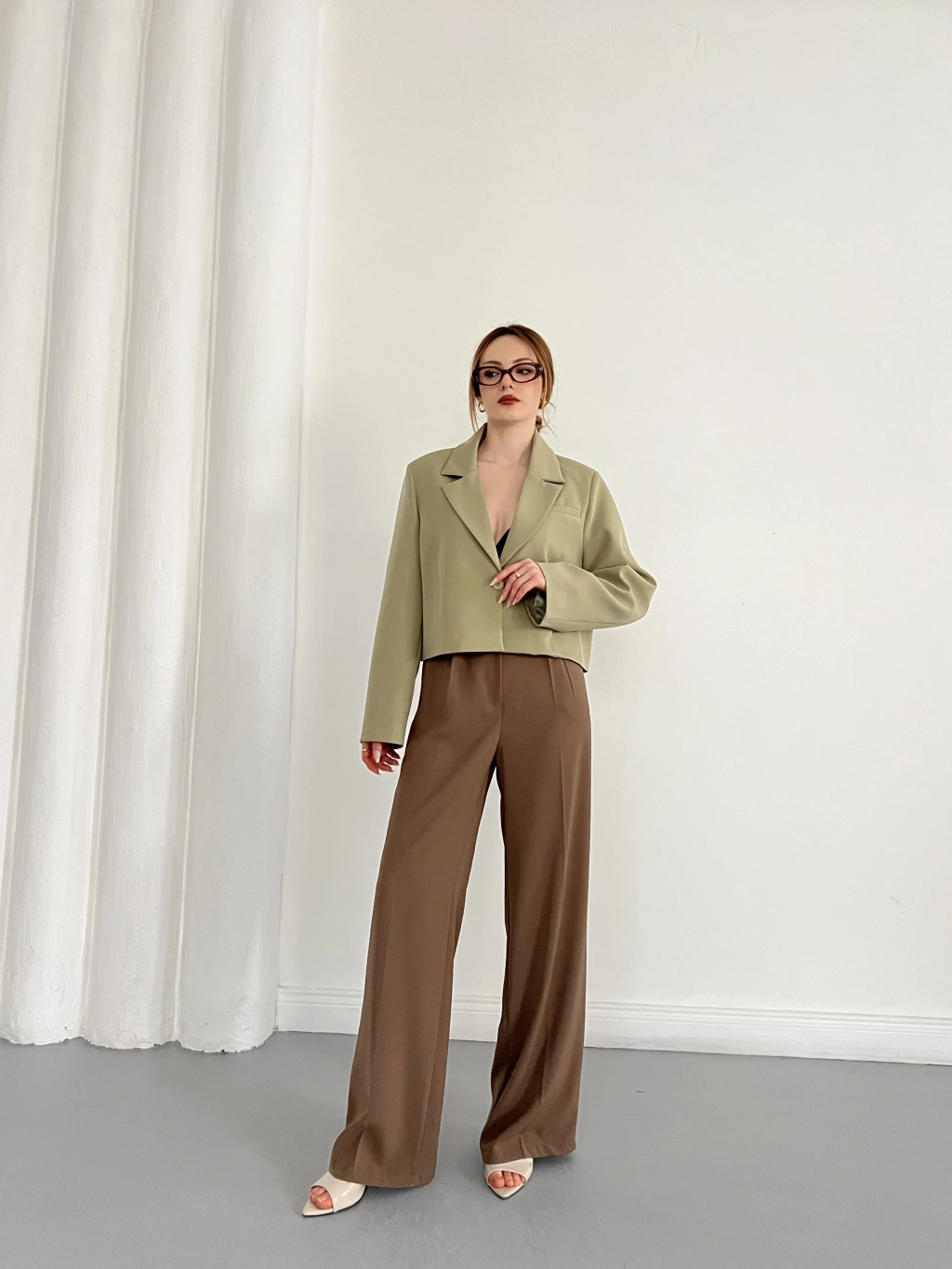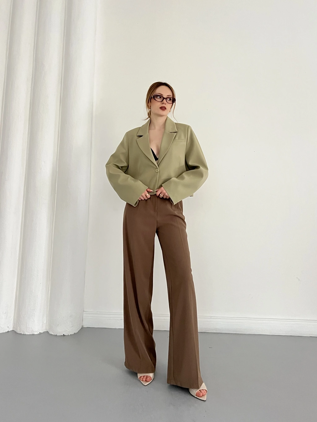 Kruvaze Yaka Tek Düğme Detay Crop Ceket Kahve